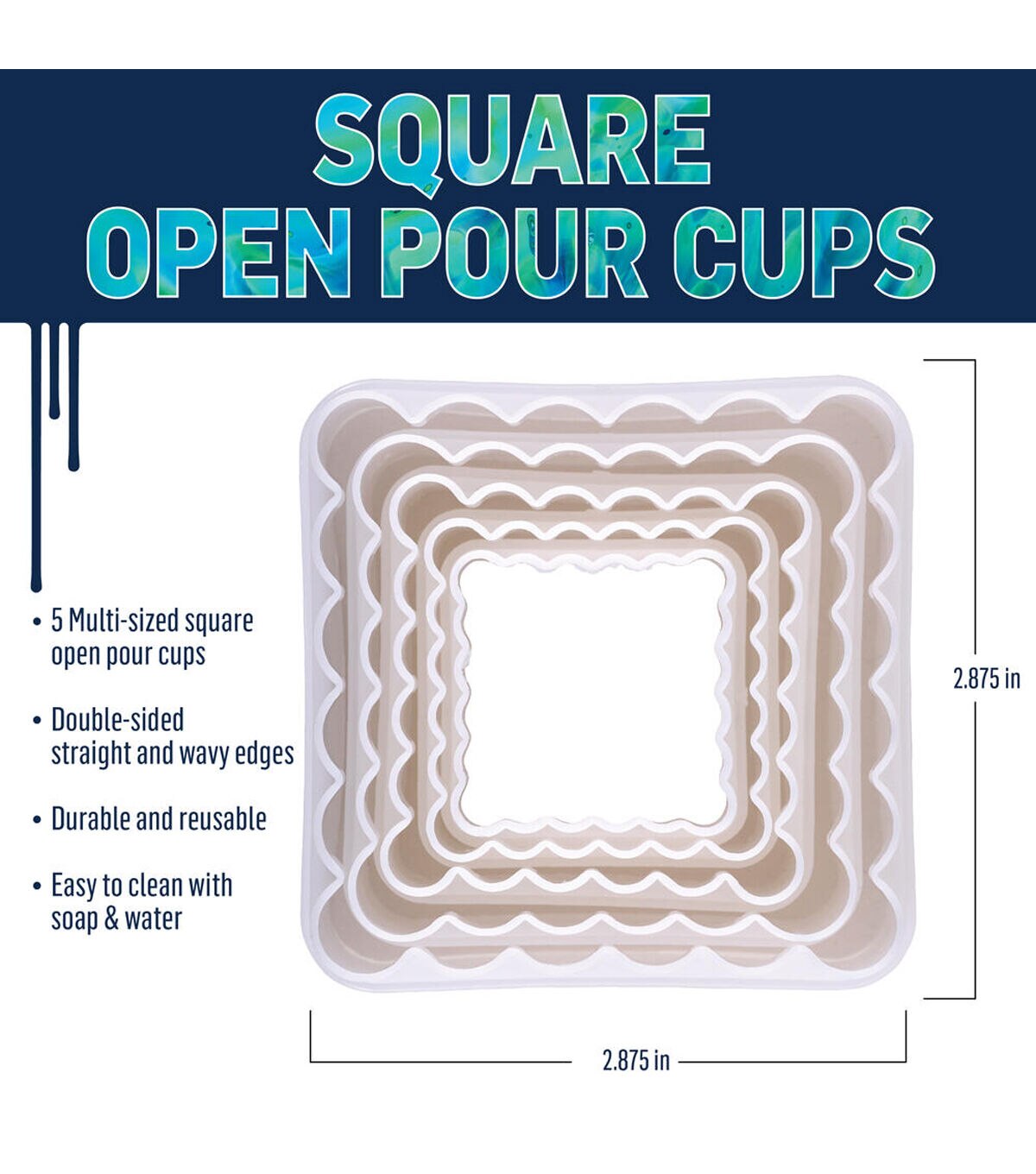 Create various patterns and effects with the FolkArt Drizzle Square Open Pour Cups. Each of the 5 square open pour cups have double-sided straight and wavy edges for creating unique fluid art. Create dreamy blended patterns by adding pouring paint into cups and watching colors flow. These cups are durable and reusable and are easy to clean with soap and water. Explore the pour using FolkArt Drizzle products or any pouring paint with the FolkArt Drizzle Square Open Pour Cups.
