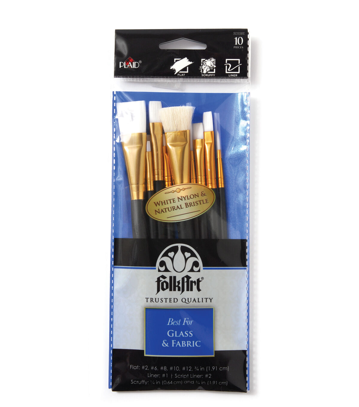 The FolkArt Glass and Fabric 10 Piece Brush Set is the must-have set for all your glass and fabric painting projects. Get even, consistent brush strokes every time with the white nylon and natural bristles. Each premium brush is made of wood with gold brass ferrules for the highest quality painting experience. This set offers you multiple sizes of brushes for small detail work to basic basecoating. Add the durablility and convenience of this versatile brush set from FolkArt to your painting accessories.