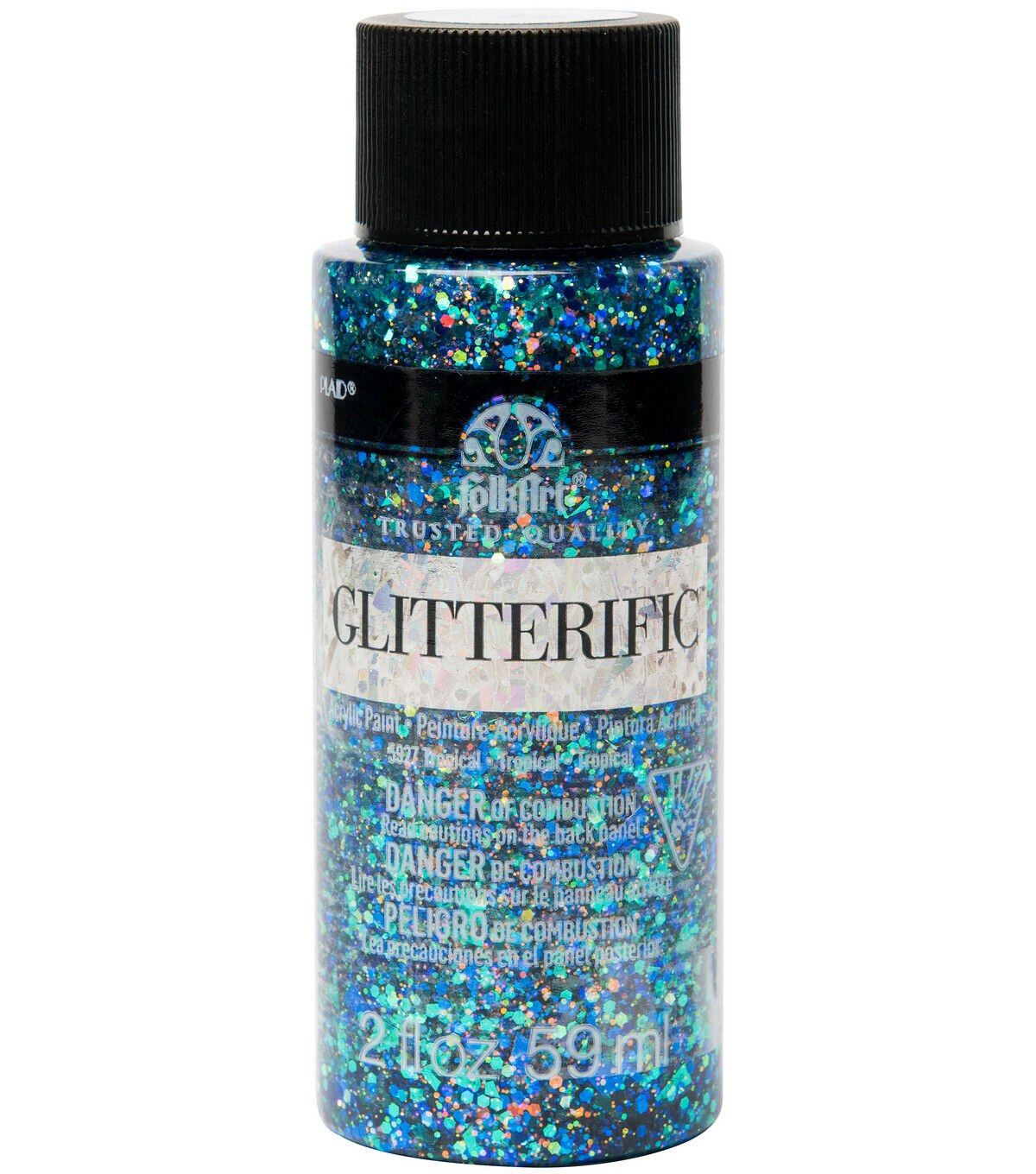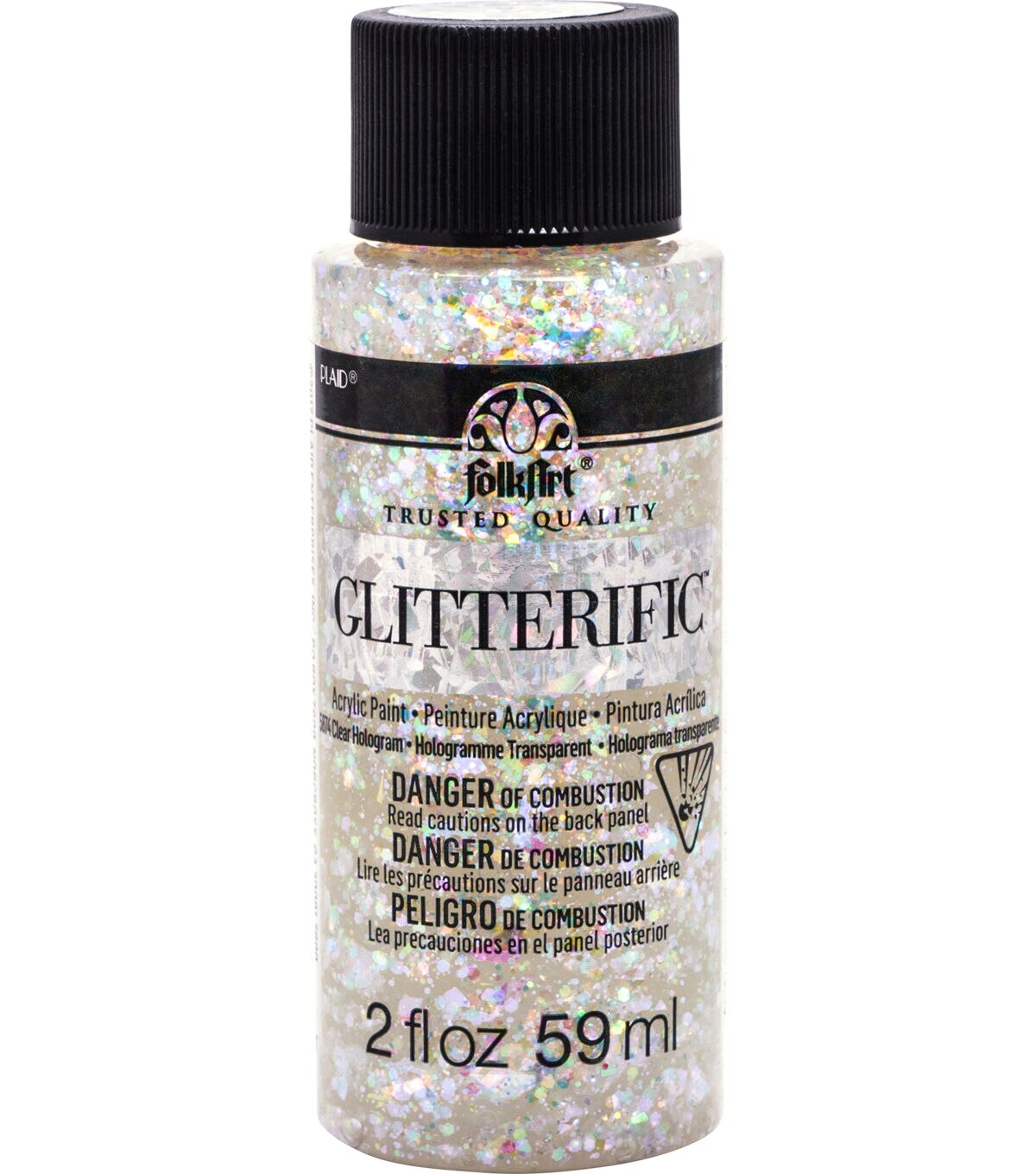 FolkArt Glitterific features multiple size glitter particles suspended in a crystal clear base to create the most dazzling glitter paint available today! Use this formula on wood, metal, glass, canvas, paper, decorative fabrics, or rigid plastic. This package contains 2 fl oz of glitter paint. Available in a variety of colors each sold separately. Conforms to ASTM D4236. Made in USA.