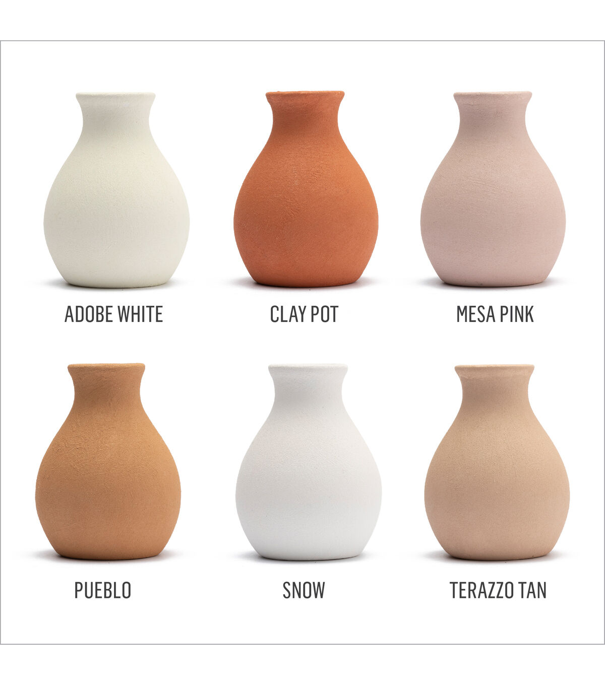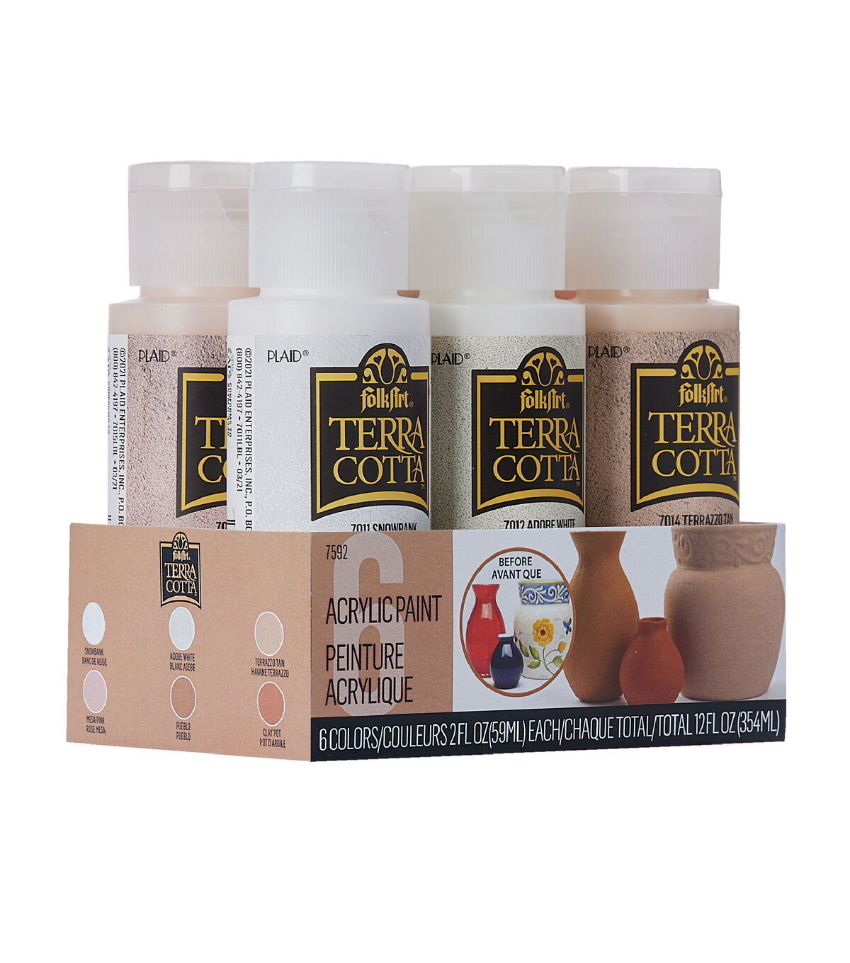- CONVENIENT SIZE - This terra cotta acrylic paint set includes 6 - 2 oz bottles of textured paint. The colors in this paint set include: FolkArt Terra Cotta Snowbank, Adobe White, Bermuda Sand, Mesa Pink, Pueblo, and Clay Pot