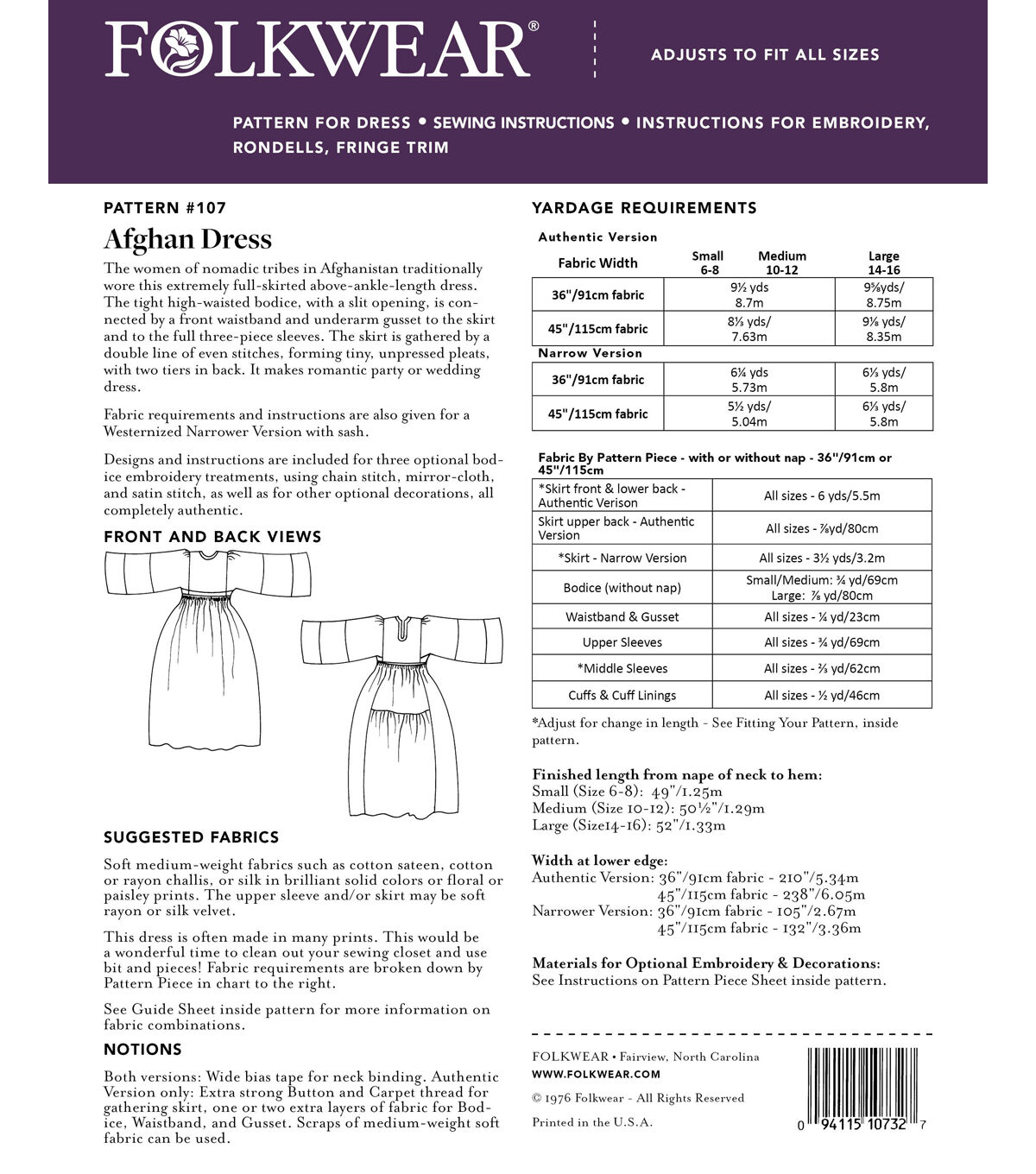 • Folkwear 107 Size 6 to 16 Misses Afghan Dress Sewing Pattern