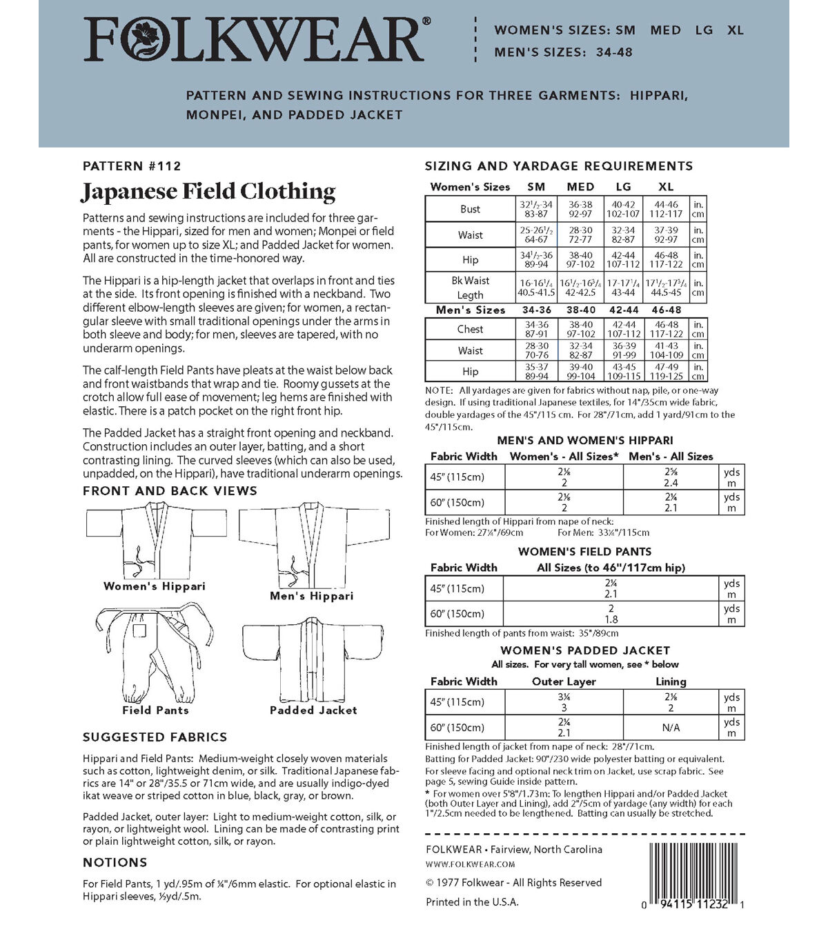 - Suggested fabrics: For Hippari and Field Pants, choose medium-weight tightly woven materials such as cotton, lightweight denim, or silk. Traditional Japanese fabrics are usually indigo-dyed ikat weave or striped cotton in blue, black, gray, or brown. For Padded Jacket, choose light to medium-weight cotton, silk, or rayon, or lightweight wool.