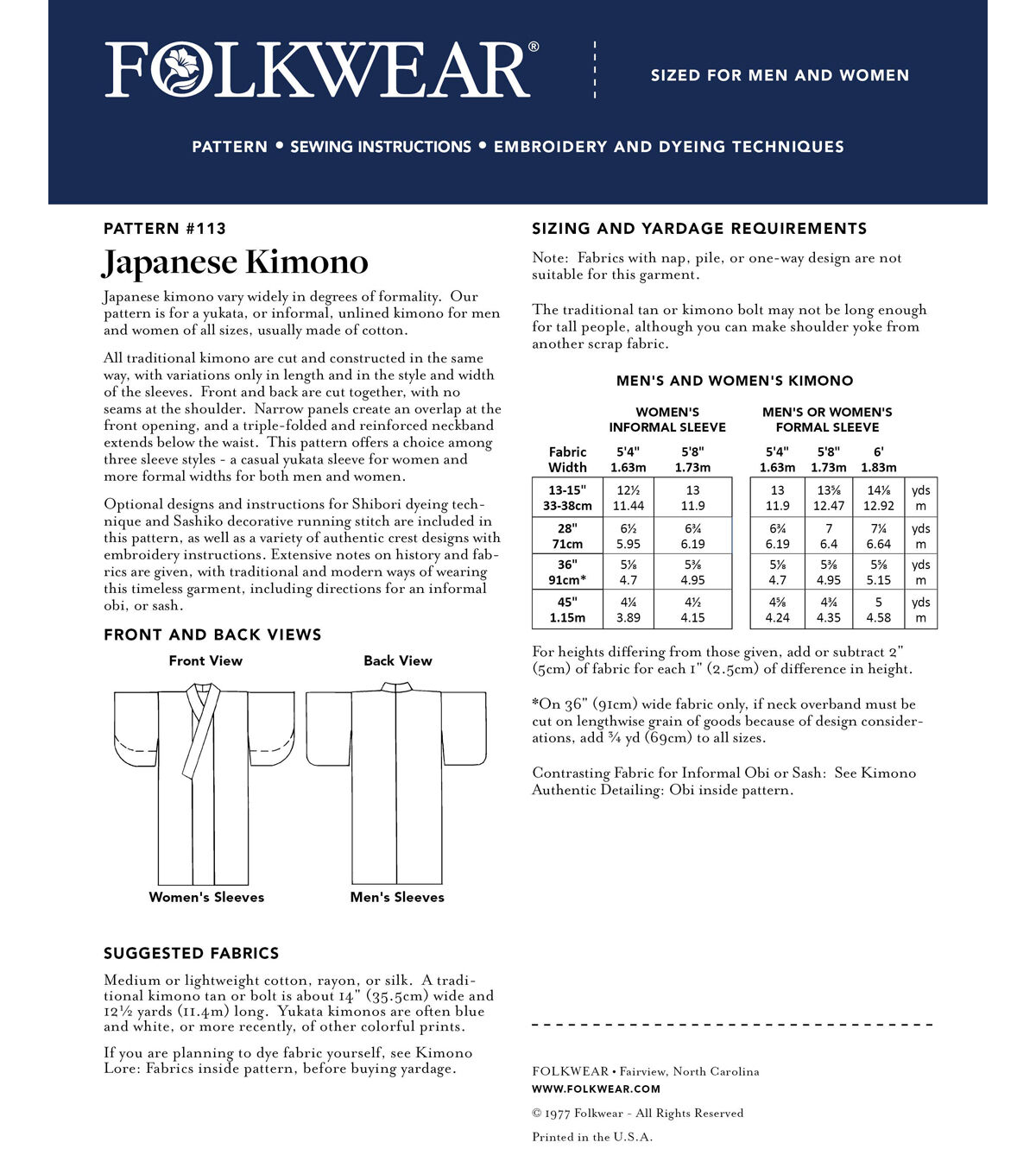 - Included: sewing pattern, sewing instructions, history and detailing of kimono, sashiko embroidery instructions and designs, shibori dying instructions.