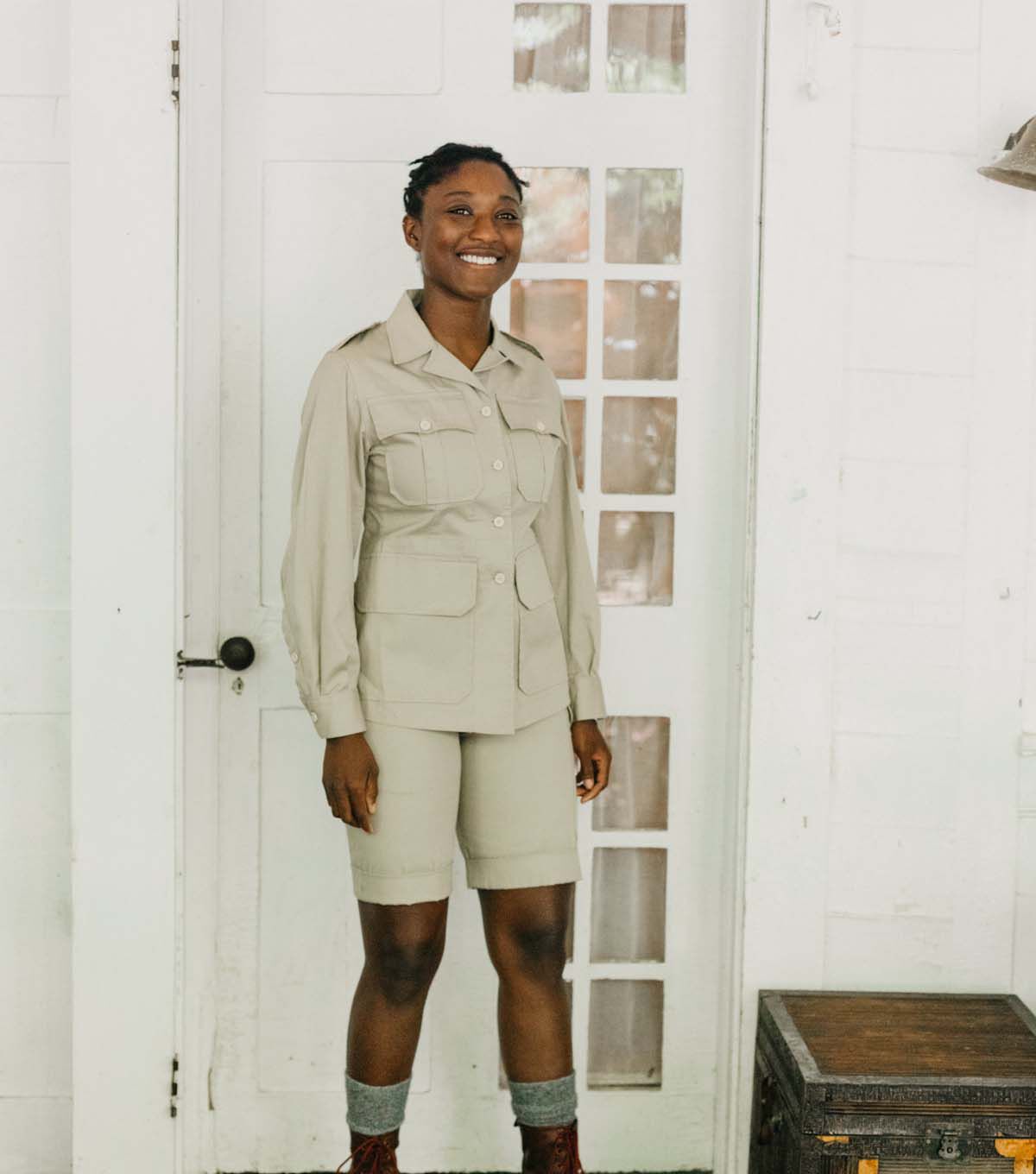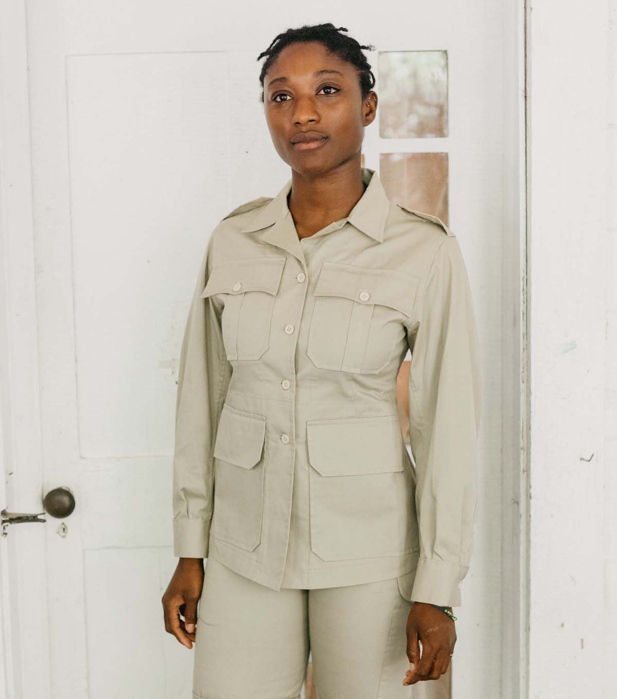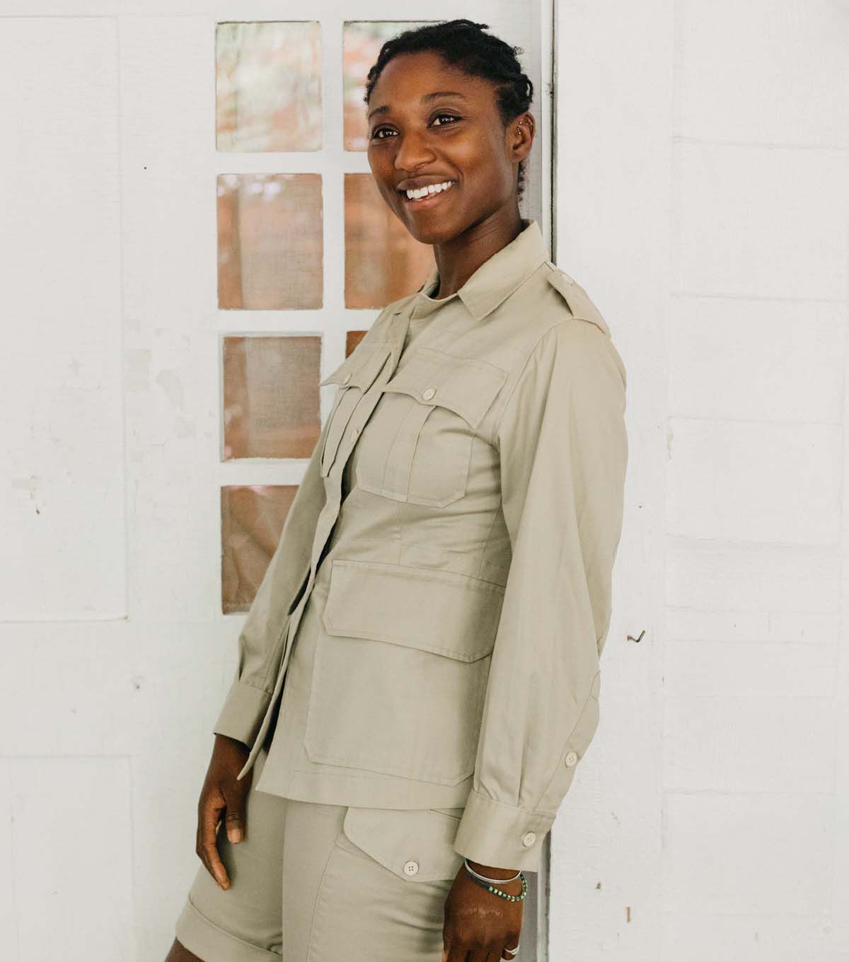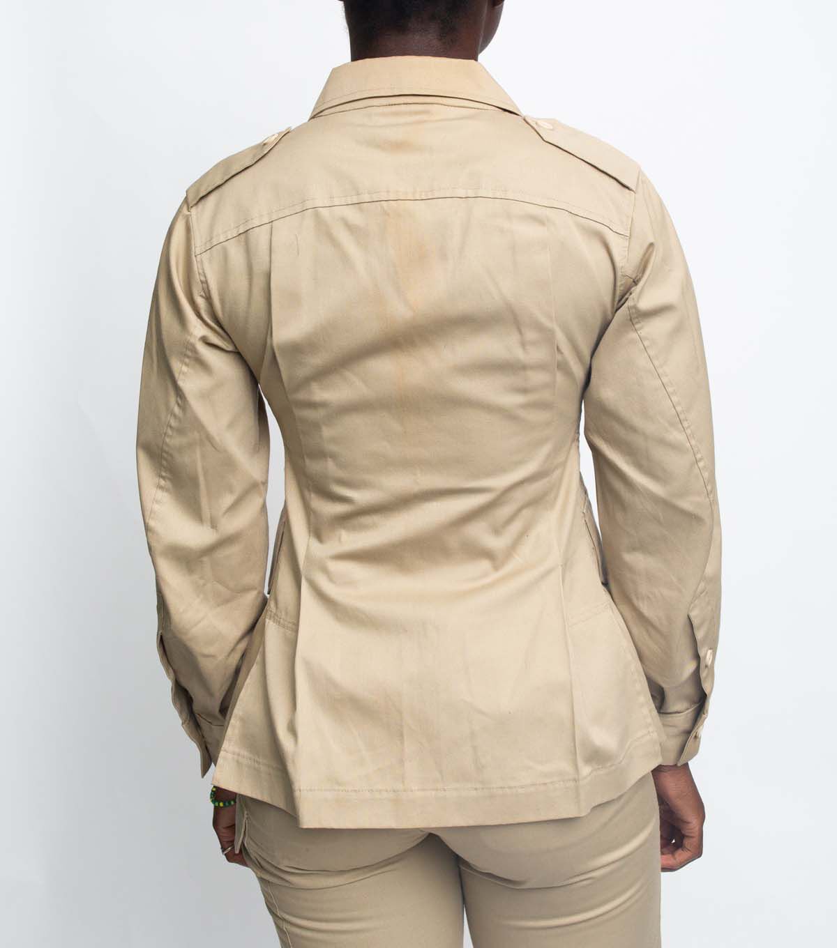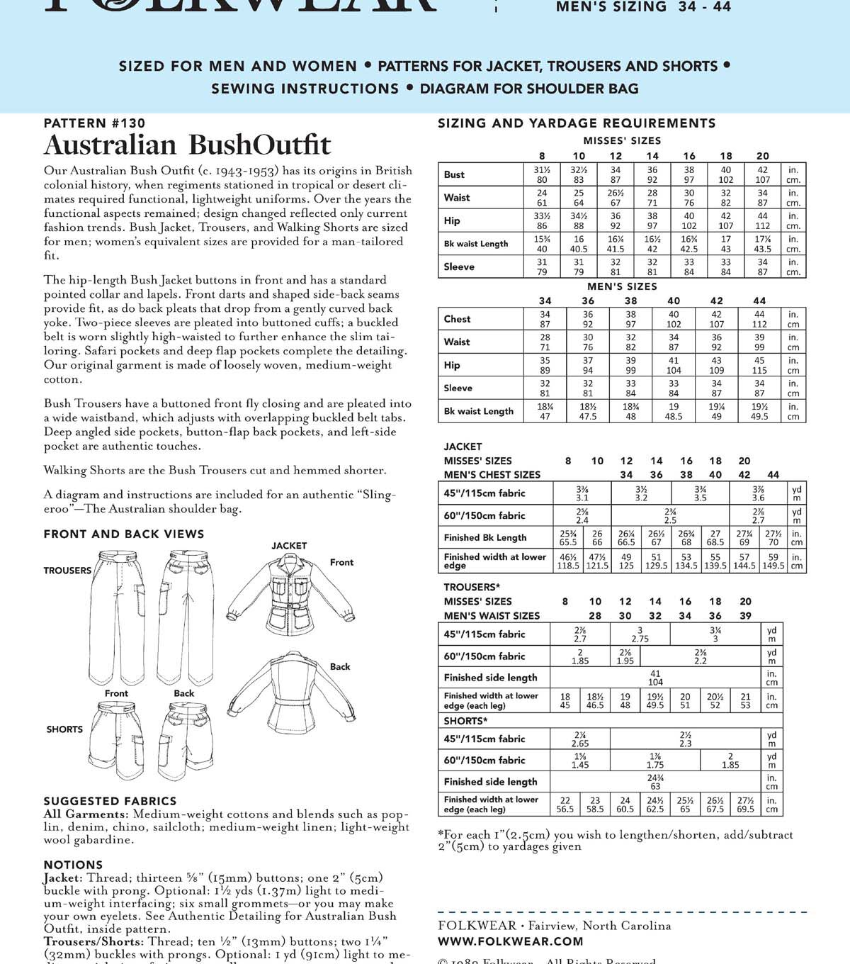 The Australian Bush Outfit (c.1943-1955) is a classic bush jacket, trousers, and shorts from Hollywood's version of the tropical British colonies. This sewing pattern has three garments, plus a bag, to sew. The hip length Bush Jacket buttons in the front and has a standard pointed collar and lapels. Front darts and shaped side-back seams provide fit, as do back pleats which drop from a gently-curved back yoke. Two piece sleeves are pleated into buttoned cuffs, a buckled belt is worn slightly high-waisted to further enhance the slim tailoring. Safari pockets and deep flap pockets complete the detailing. The original garment is made of a loosely-woven, medium weight cotton. The Bush Trousers have a buttoned front fly closing and are pleated into a wide waistband which adjusts with overlapping buckled belt tabs. Deep angled side pockets, button-flap back pockets and left-side pocket are authentic touches. Walking Shorts are the same Bush Trousers cut and hemmed shorter. Roll them up to wear them as intended. Make it in khaki for the authentic look, or silk twill for a classy updated impression. Pattern includes instructions for the slingeroo, a handy over-the-shoulder bag that completes the outfit.