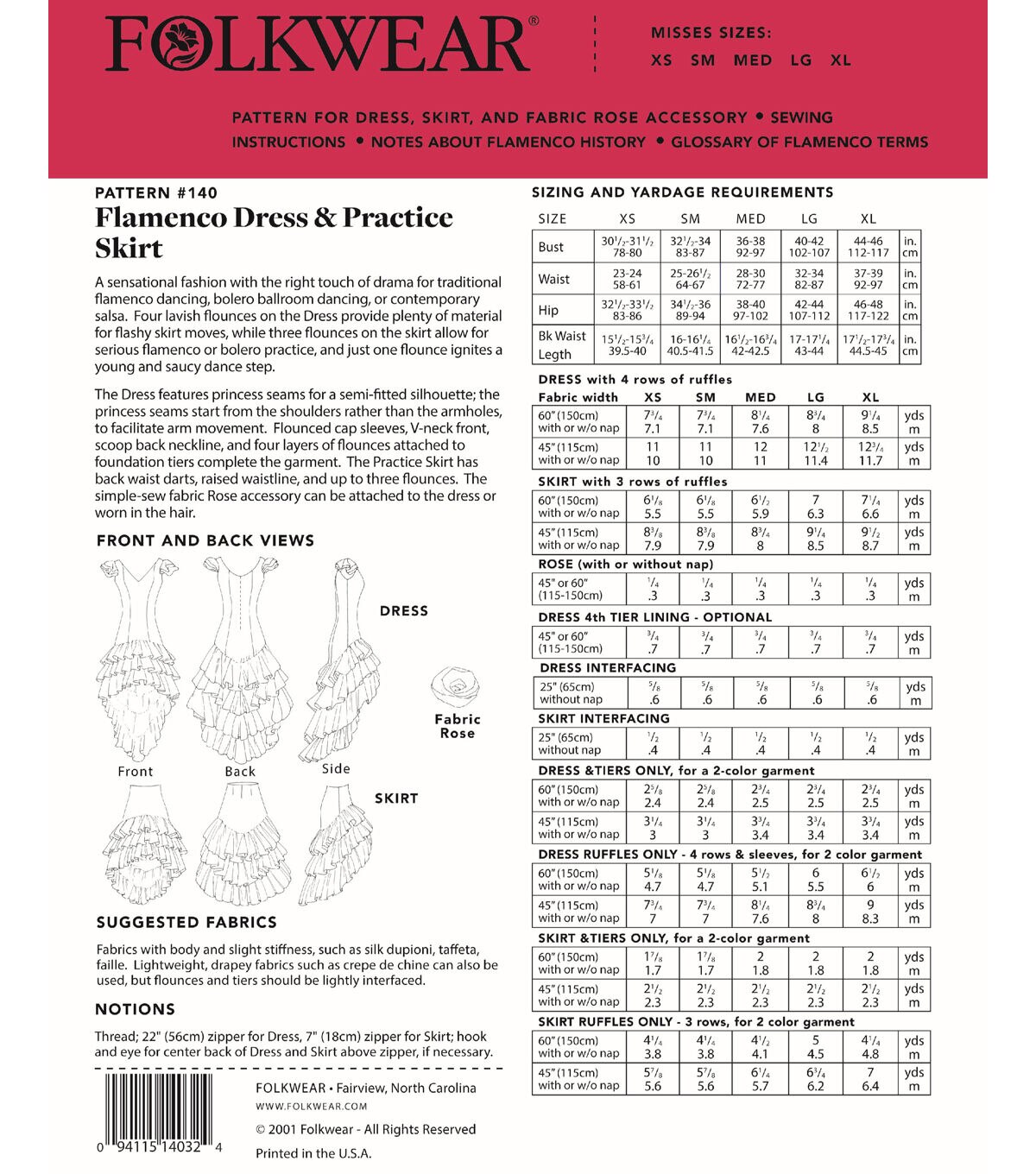 Create a sensational fashion for dancing or dress-up with this sewing pattern, complete with lavish flounces that move with flash. The Dress has princess seams for a semi-fitted silhouette; the princess seams start from the shoulders rather than the armholes to facilitate arm movement. Flounced cap sleeves, V-neck front, scoop back neckline, and four layers of flounces attached to foundation tiers complete the garment. The Skirt has back waist darts and raised waistline and up to three flounces. Make it with all three flounces or just one flounce for a salsa-hot mini. Make simple-sew fabric Rose accessory to attached to dress or pin in hair. The skirt with one flounce also makes a great everyday skirt.