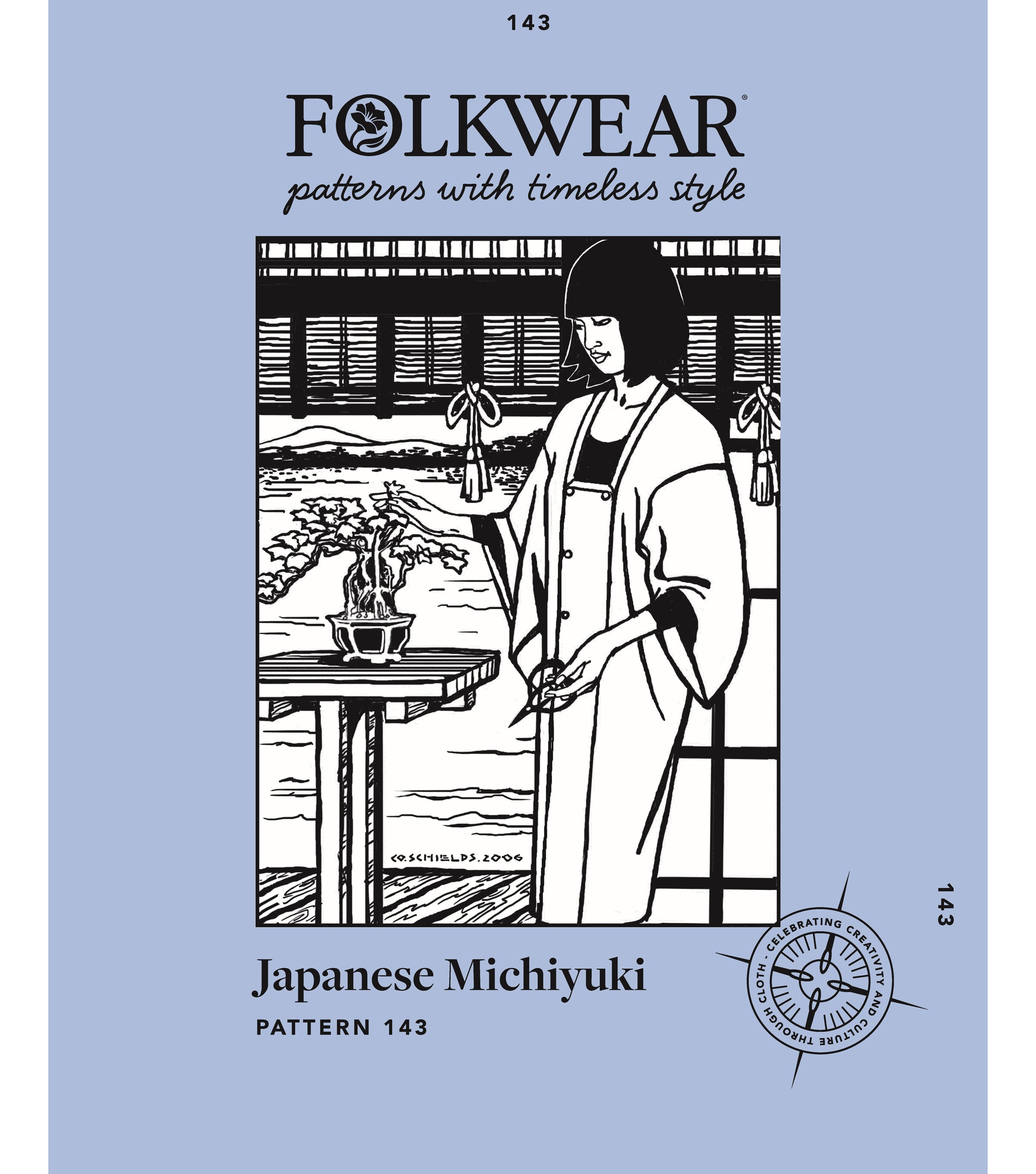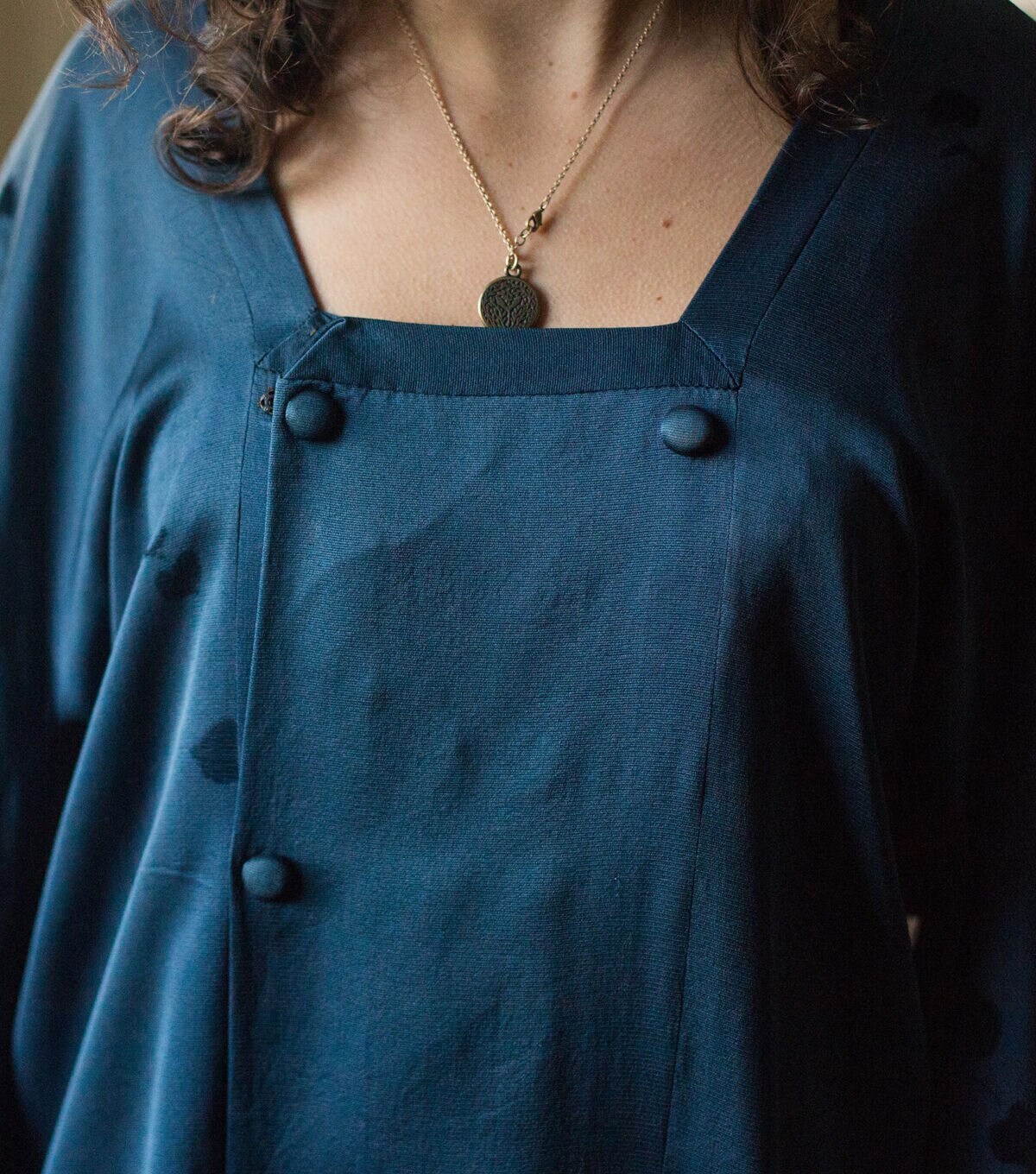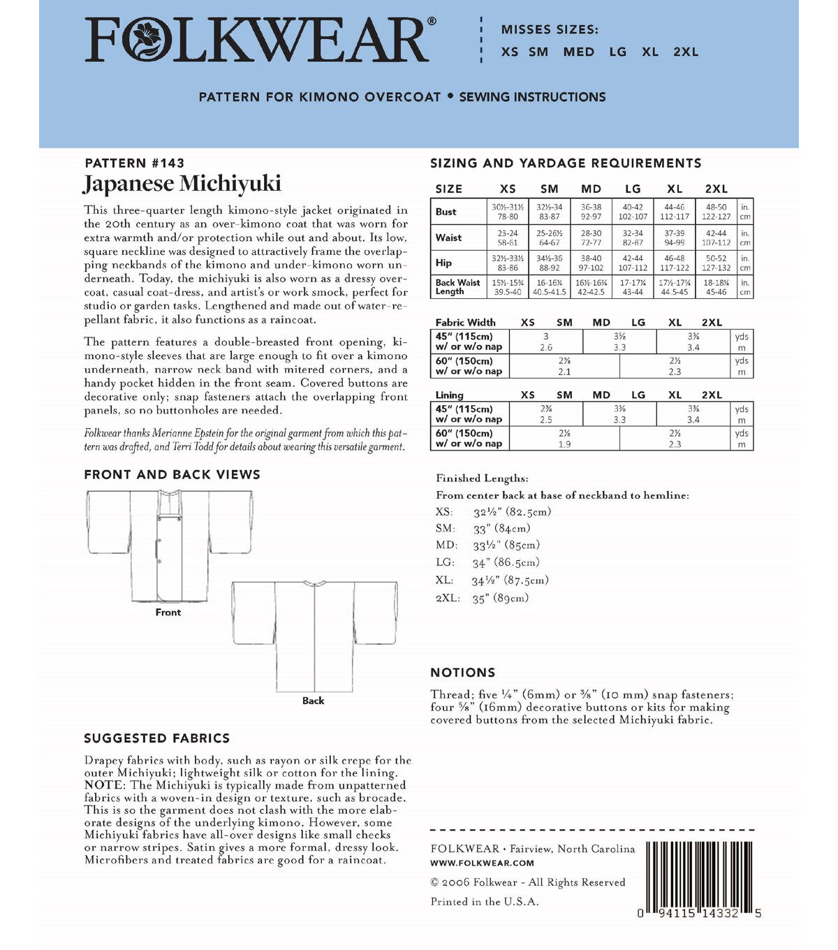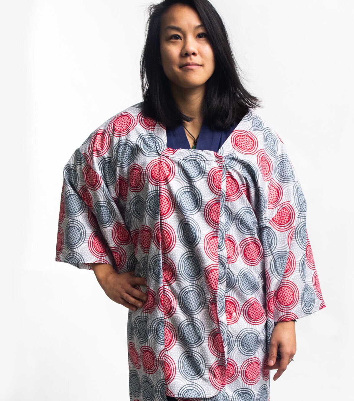 This three-quarter length kimono-style jacket originated in the 20th century as an over-kimono coat that was worn for extra warmth and/or protection while out and about. Its low, square neckline was designed to attractively frame the overlapping neckbands of the kimono and under-kimono worn underneath. Today, the Michiyuki is worn as a dressy overcoat, casual coat-dress, and artist's or work smock, perfect for studio or garden tasks. Lengthened and made out of water-repellent fabric, it also functions as a raincoat. This sewing pattern features a double-breasted front opening, kimono style sleeves that are large enough to fit over a kimono underneath, narrow neck band with mitered corners, and a handy pocket hidden in the front seam. Covered buttons are decorative only; snap fasteners attach the overlapping center front panels, so no buttonholes are needed.