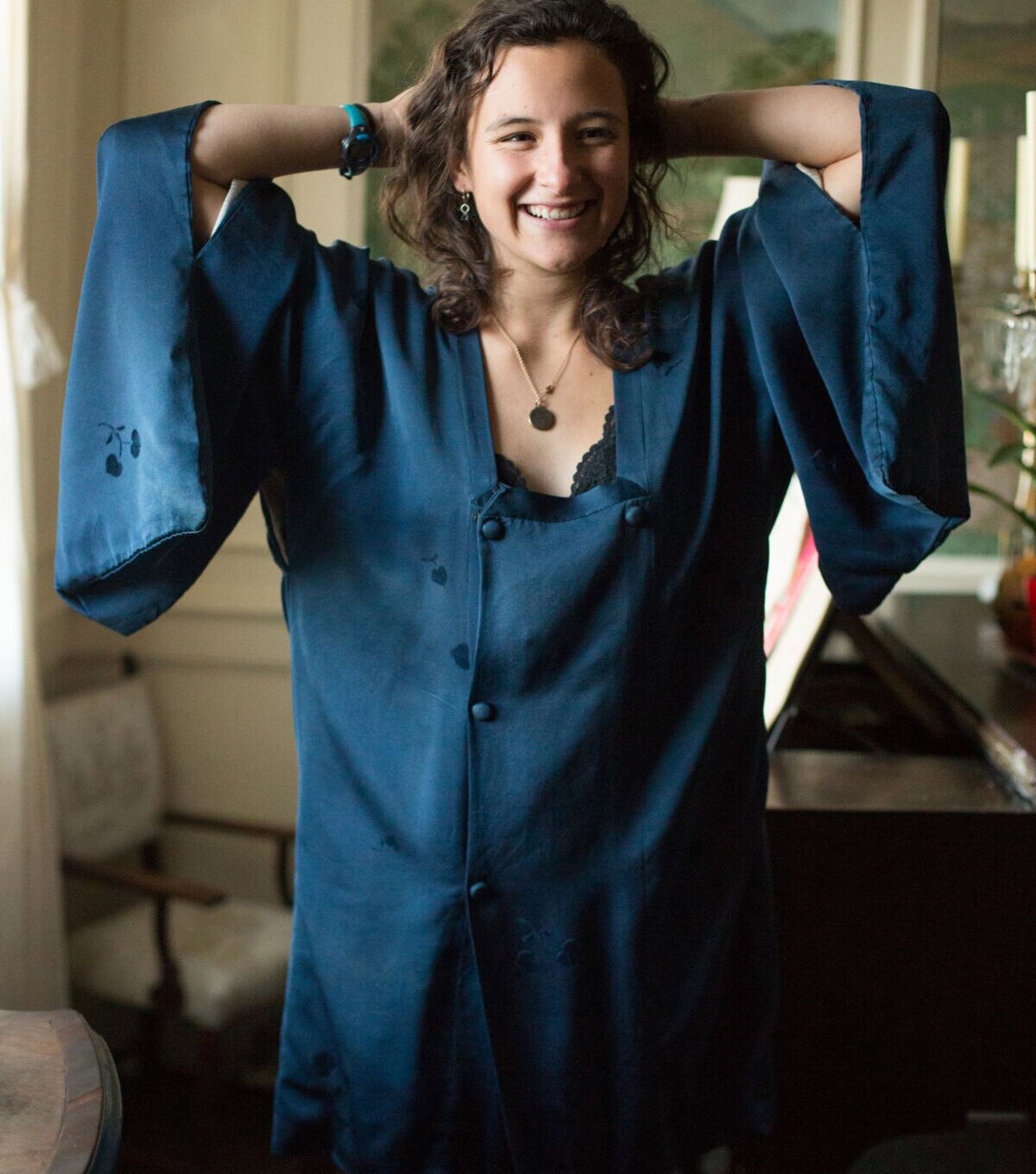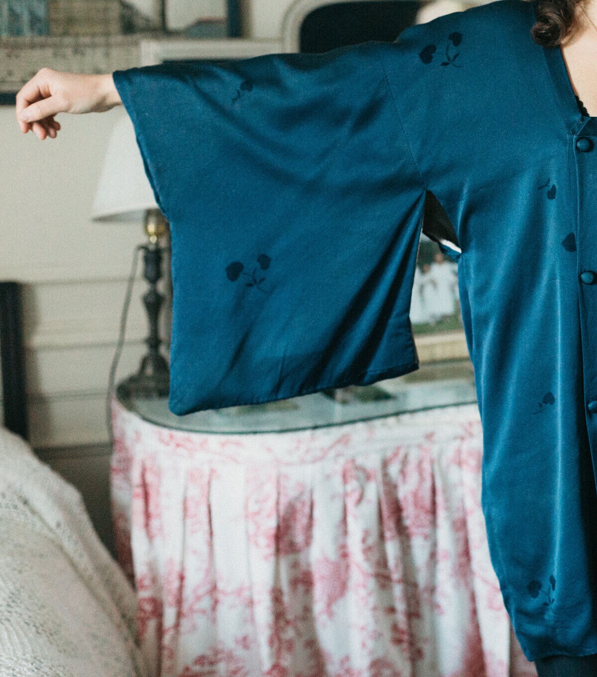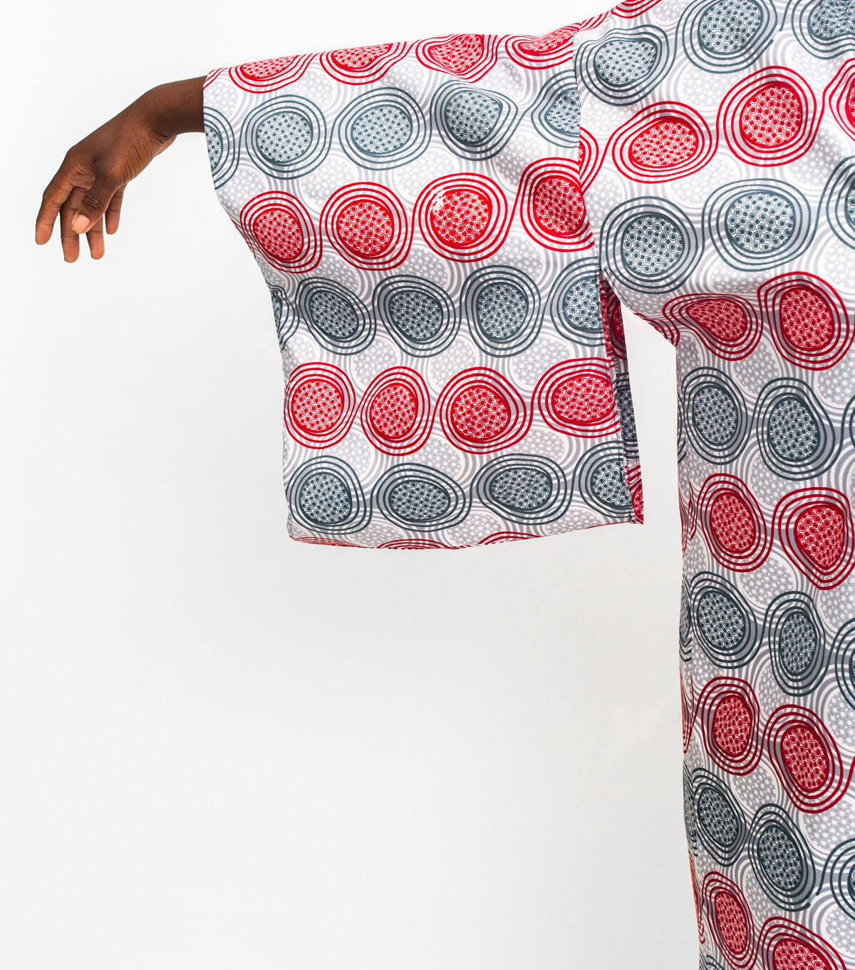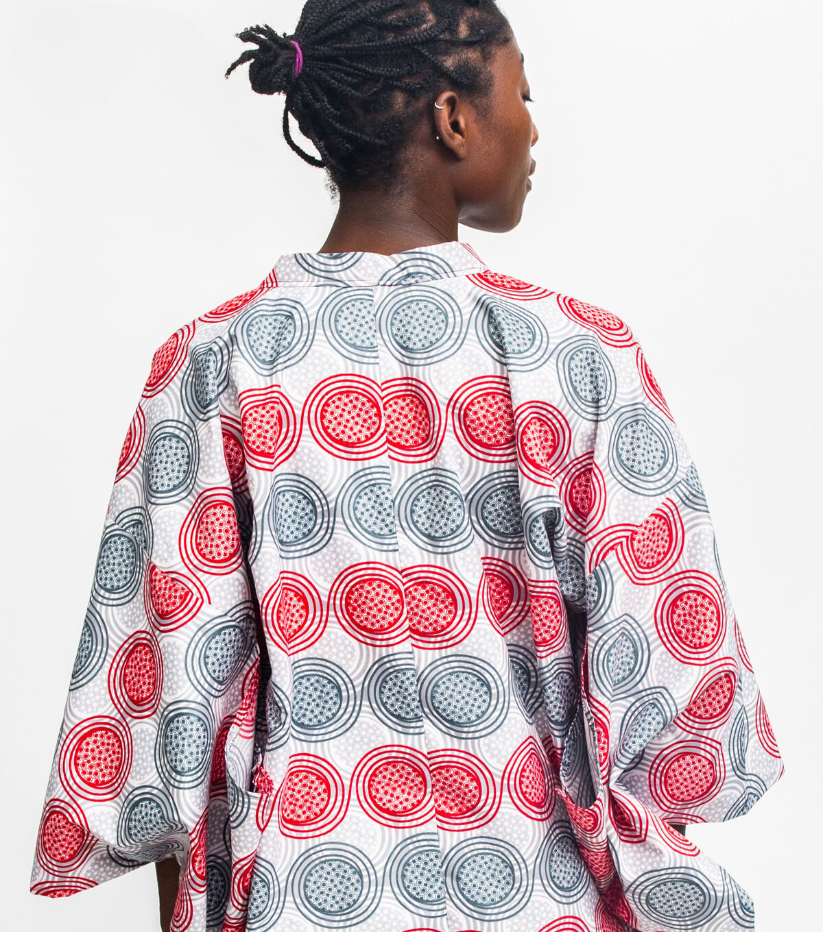 This three-quarter length kimono-style jacket originated in the 20th century as an over-kimono coat that was worn for extra warmth and/or protection while out and about. Its low, square neckline was designed to attractively frame the overlapping neckbands of the kimono and under-kimono worn underneath. Today, the Michiyuki is worn as a dressy overcoat, casual coat-dress, and artist's or work smock, perfect for studio or garden tasks. Lengthened and made out of water-repellent fabric, it also functions as a raincoat. This sewing pattern features a double-breasted front opening, kimono style sleeves that are large enough to fit over a kimono underneath, narrow neck band with mitered corners, and a handy pocket hidden in the front seam. Covered buttons are decorative only; snap fasteners attach the overlapping center front panels, so no buttonholes are needed.