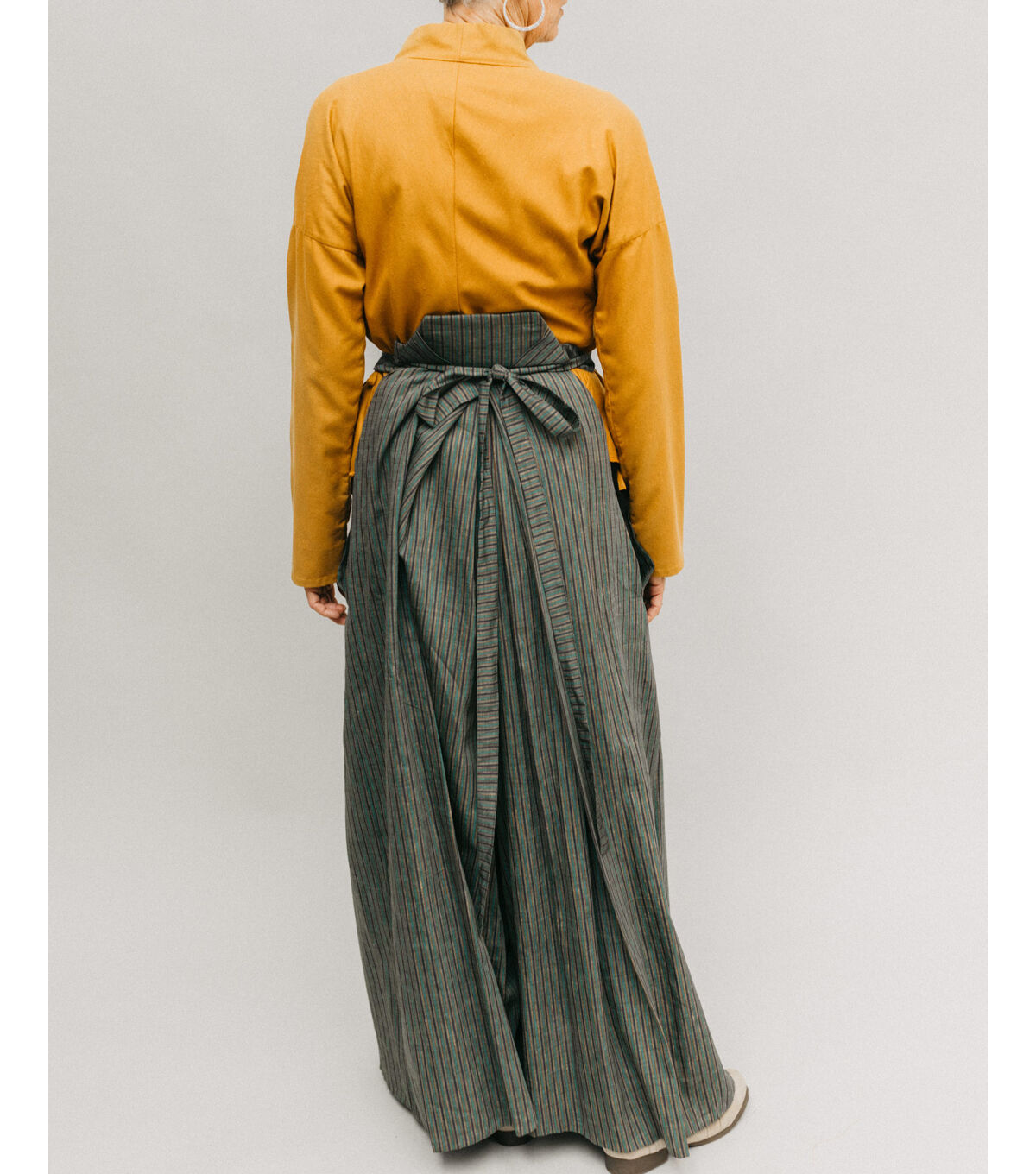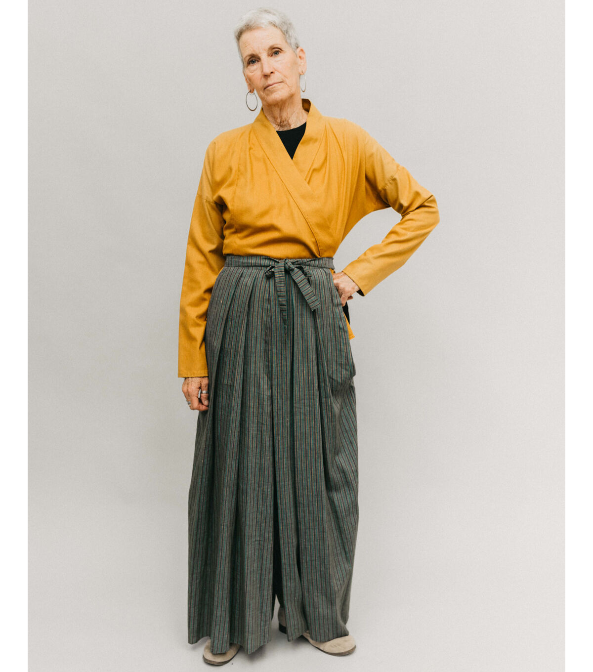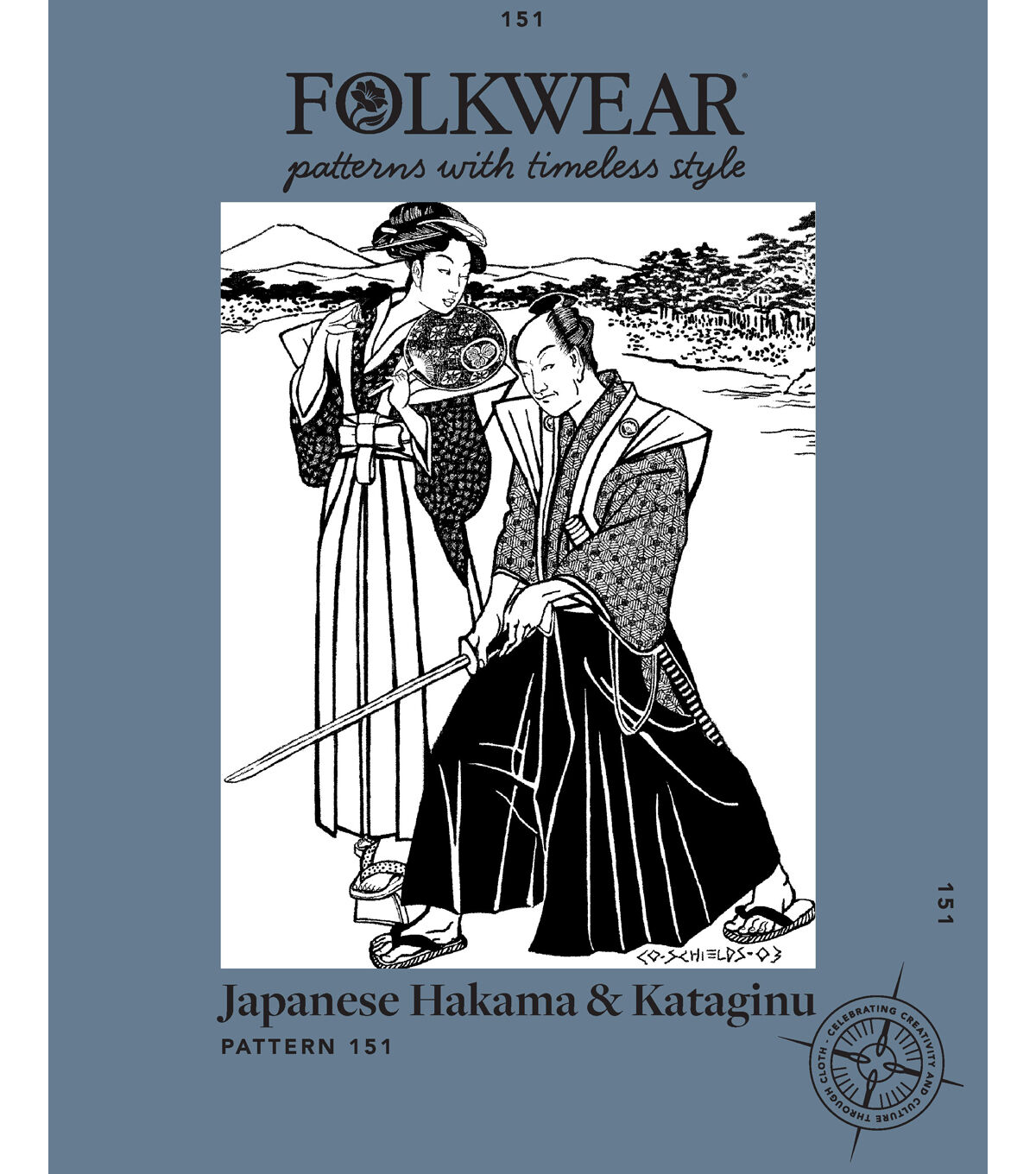 During the Edo period in Japan (1615-1868), members of the samurai or warrior class wore the Kamishimo, a traditional costume made up of the Kataginu, or pleated-front vest, and Hakama, or pleated pants/skirt. The two garments were typically worn over a knee-length kimono for formal occasions. Today, the garments are frequently worn for official occasions, martial arts, and historic reenactment. Since the Hakama is simply a large rectangle of fabric that is pleated to fit your body, the pattern does not have a large rectangle pattern piece (waste of paper!). Instead, there are complete instructions for measuring, cutting, and pleating the traditional Hakama skirt/pant in any size. The pattern does include actual pattern pieces for Small, Medium-Large, and Sumo-Size Koshiita (Backboard) and Koshiita Triangles. For contemporary sportswear, pattern also includes instructions for optional side panels to fill in the side-seam gaps that expose the underlying kimono in traditional wear. The wide-shoulder Kataginu can be made to match the Hakama for a traditional samurai appearance or as a contrasting wearable art accent. Easy to pleat and sew, it completes a dramatic outfit.