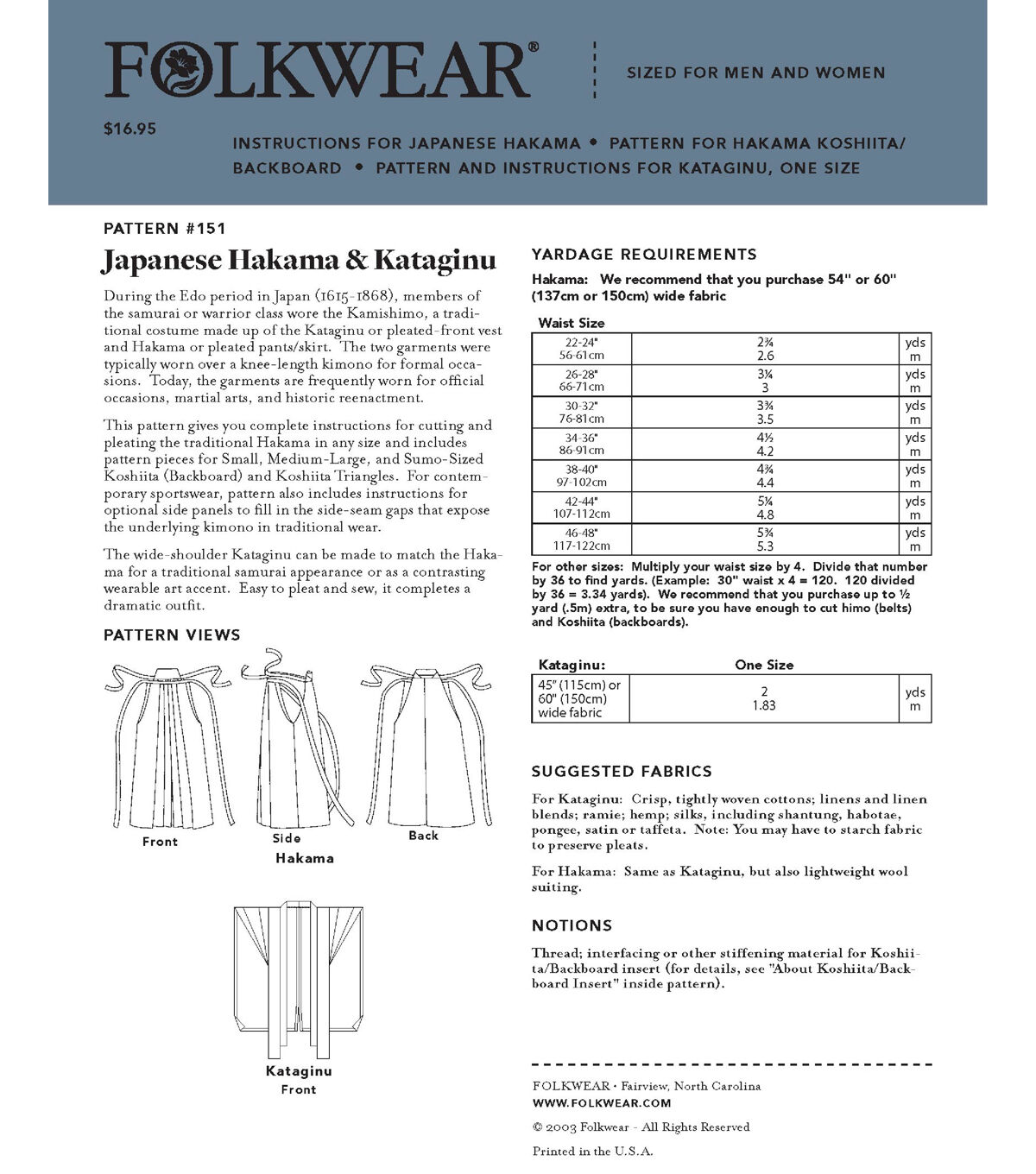 - Suggested Fabrics: For Kataginu: Crisp, tightly woven cottons; linens and linen blends; ramie; hemp; silks, including shantung, habotai, pongee, satin, or taffeta. Note: You may have to starch fabric to preserve pleats. For Hakama: Same as Kataginu, but also lightweight wool suiting.