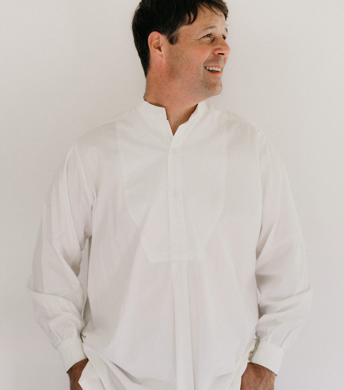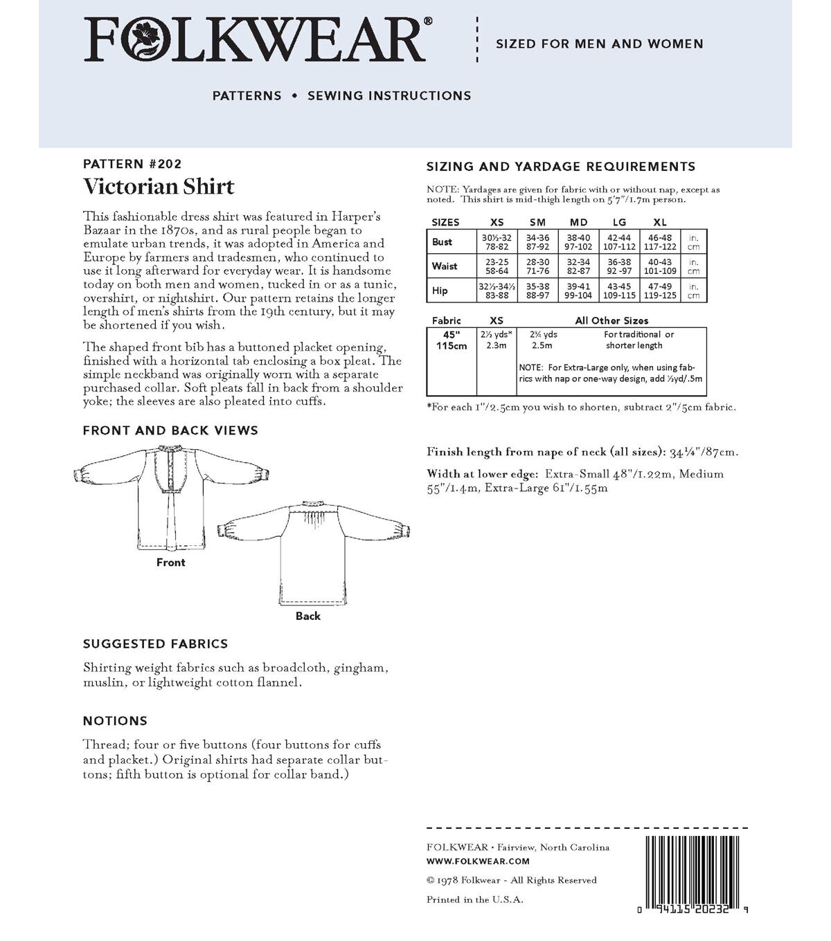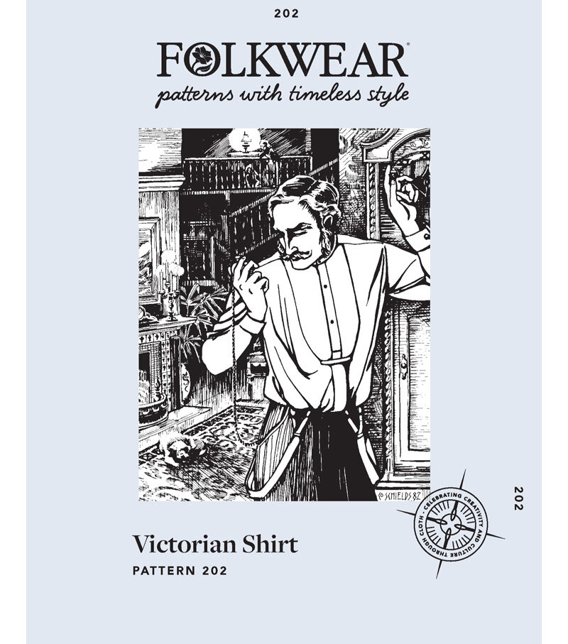 This fashionable dress shirt was featured in Harper’s Bazaar in the 1870s, and as rural people began to emulate urban trends, it was adopted in America and Europe by farmers and tradesmen, who continued to use it long afterward for everyday wear. It is handsome today on both men and women, tucked in or as a tunic, overshirt, or nightshirt. Our pattern retains the longer length of men’s shirts from the 19th century, but it may be shortened if you wish. The shaped front bib has a buttoned placket opening, finished with a horizontal tab enclosing a box pleat. The simple neckband was originally worn with a separate purchased collar. Soft pleats fall in back from a shoulder yoke; the sleeves are also pleated into cuffs.