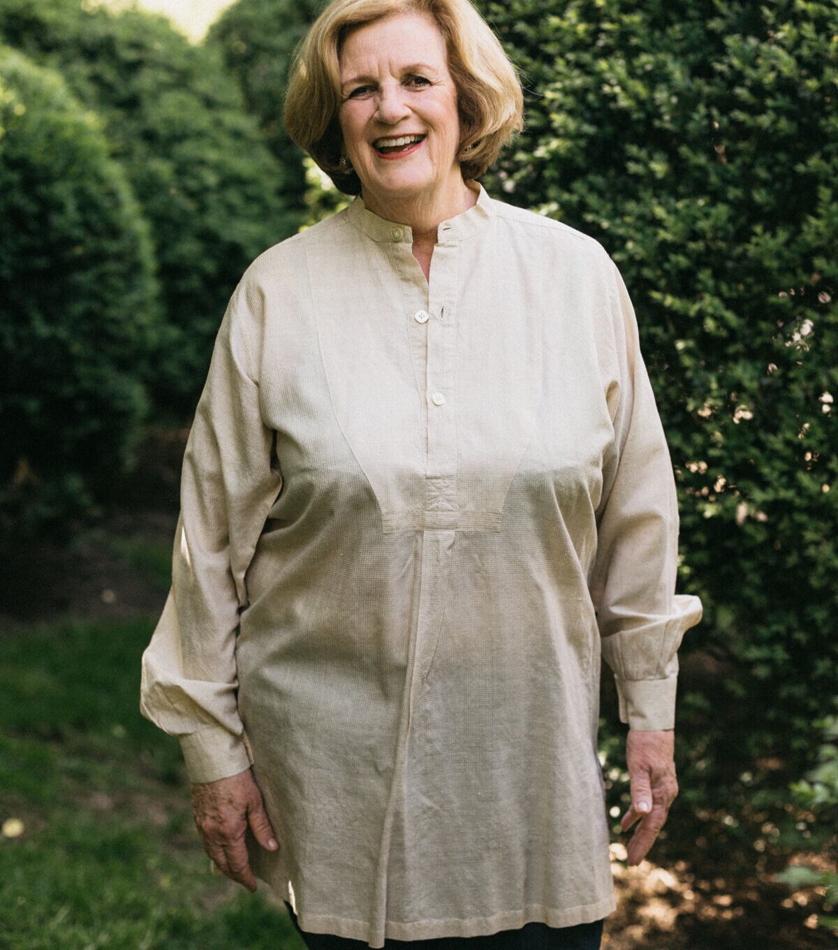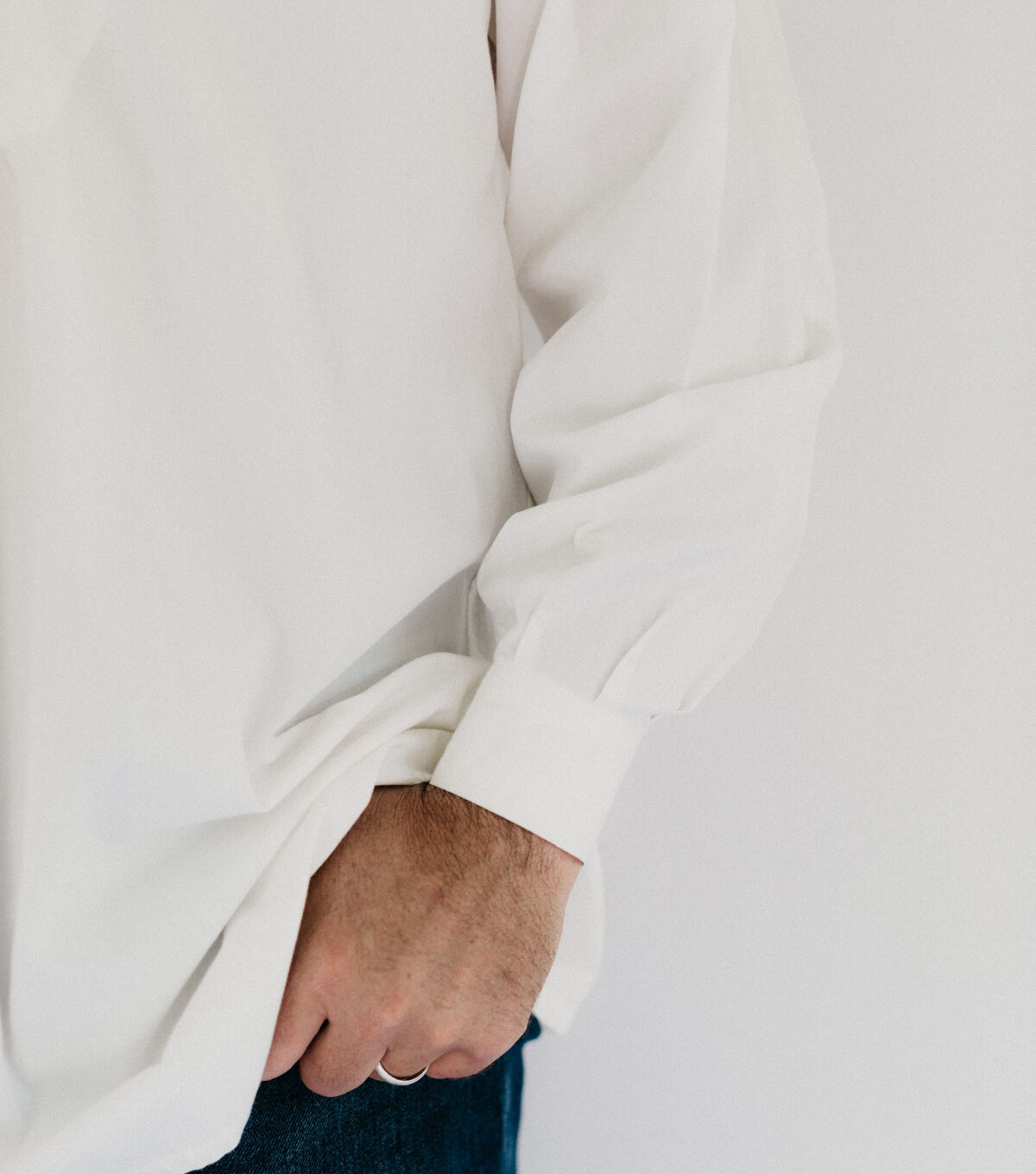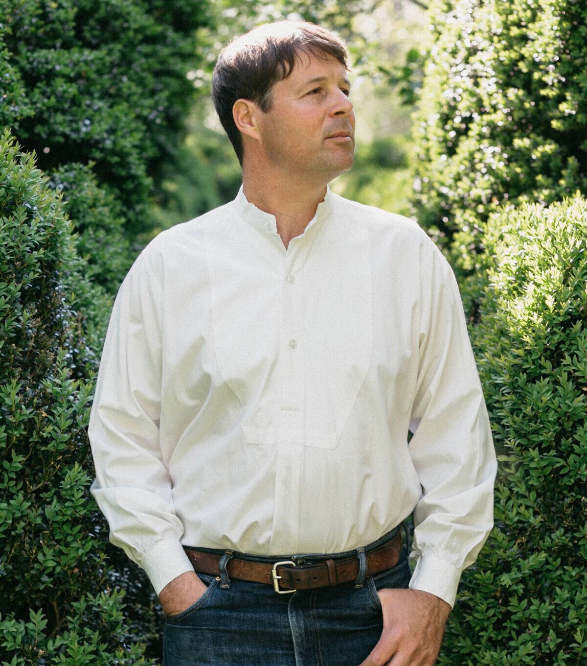 This fashionable dress shirt was featured in Harper’s Bazaar in the 1870s, and as rural people began to emulate urban trends, it was adopted in America and Europe by farmers and tradesmen, who continued to use it long afterward for everyday wear. It is handsome today on both men and women, tucked in or as a tunic, overshirt, or nightshirt. Our pattern retains the longer length of men’s shirts from the 19th century, but it may be shortened if you wish. The shaped front bib has a buttoned placket opening, finished with a horizontal tab enclosing a box pleat. The simple neckband was originally worn with a separate purchased collar. Soft pleats fall in back from a shoulder yoke; the sleeves are also pleated into cuffs.