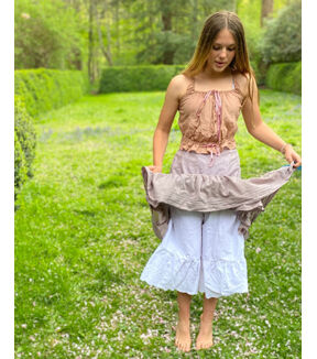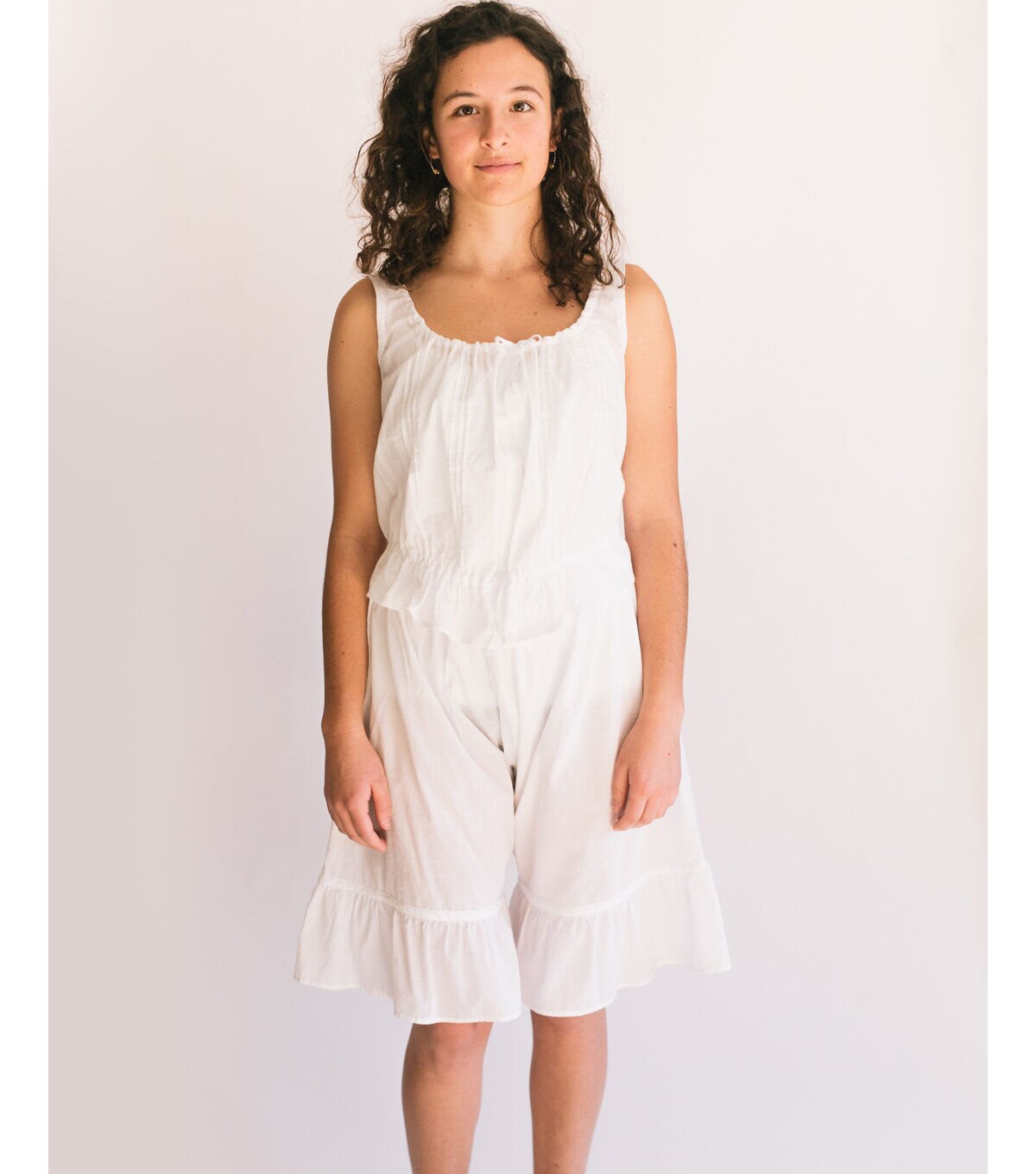 Three charming sewing patterns for "unmentionables" from the Edwardian bride's trousseau. The camisole, petticoat, and drawers make lovely undergarments or the prettiest summer outerwear. The Camisole's bodice is accentuated by clusters of tucks and optional lace insertions. Slightly high-waisted and fitted in back, it is bloused in front, with soft gathers falling from ribbon beading of lace or eyelet edging. The camisole closes with drawstrings at the neck and waist, and a buttoned front opening. The gored Petticoat falls to a wide flounce over a dust ruffle at the hemline. The drawstring waist ties at a back placket opening. The petticoat may easily be shortened for contemporary wear. The knee-length Drawers, or "knickers", gathered at the curved waistband, are constructed with a front gusset and two buttoned side plackets. They are finished with ruffles at the knees. Petticoat and drawers are also decorated with tucking and/or lace or eyelet. Pattern includes instructions for crocheted edging, lace insertion, and decorative embroidery stitches.