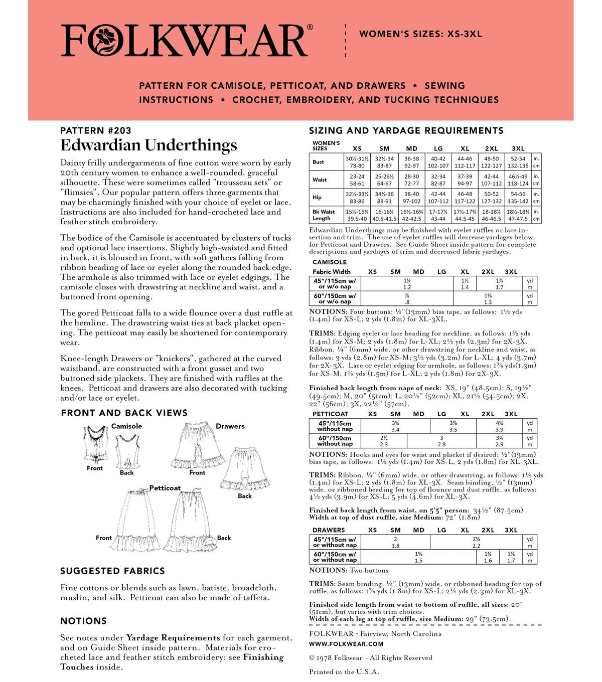 - Included: pattern and sewing instructions for camisole, petticoat, and drawers; patterns and instructions for crocheted lace edging and insertion; embroidery instructions.