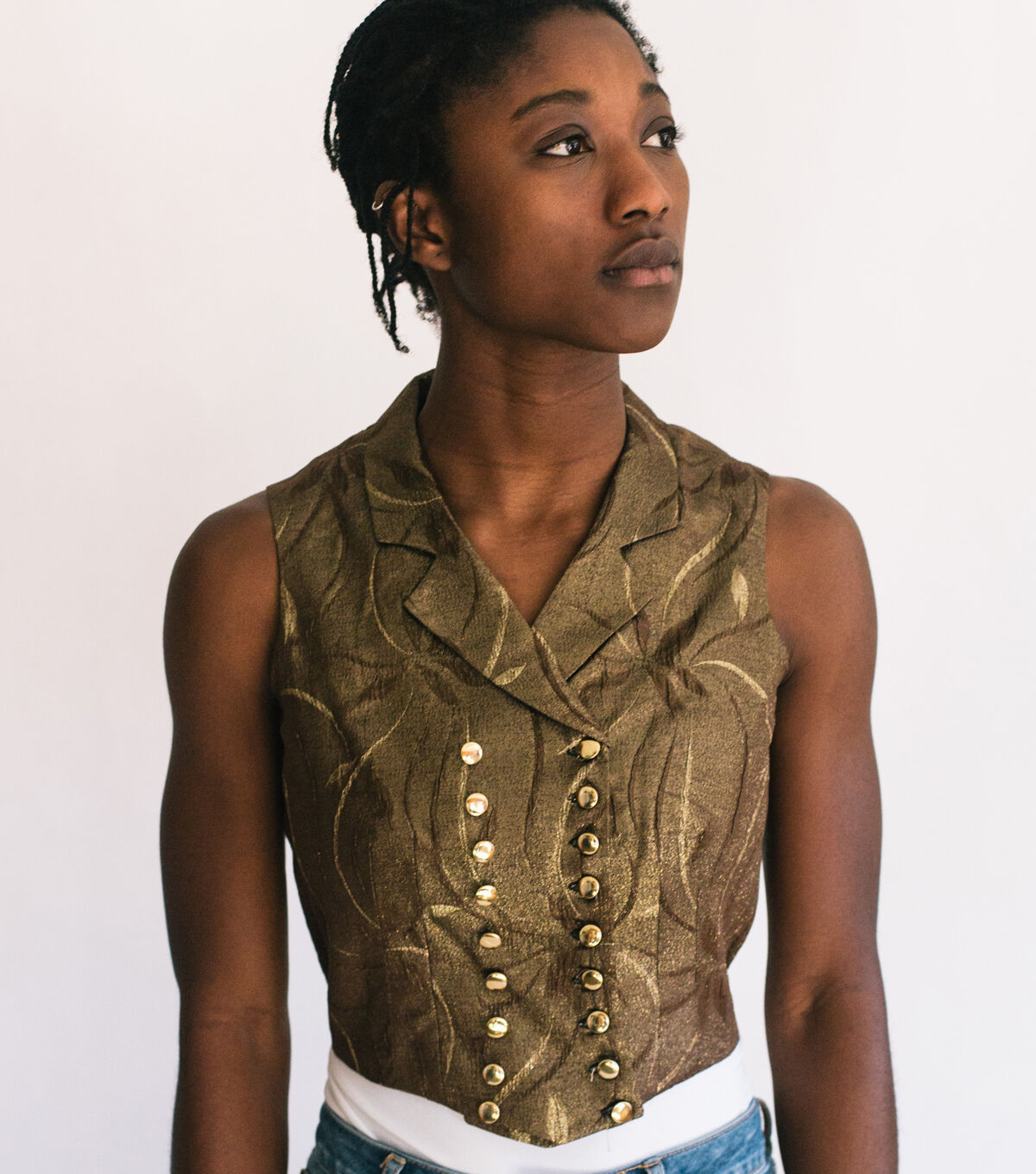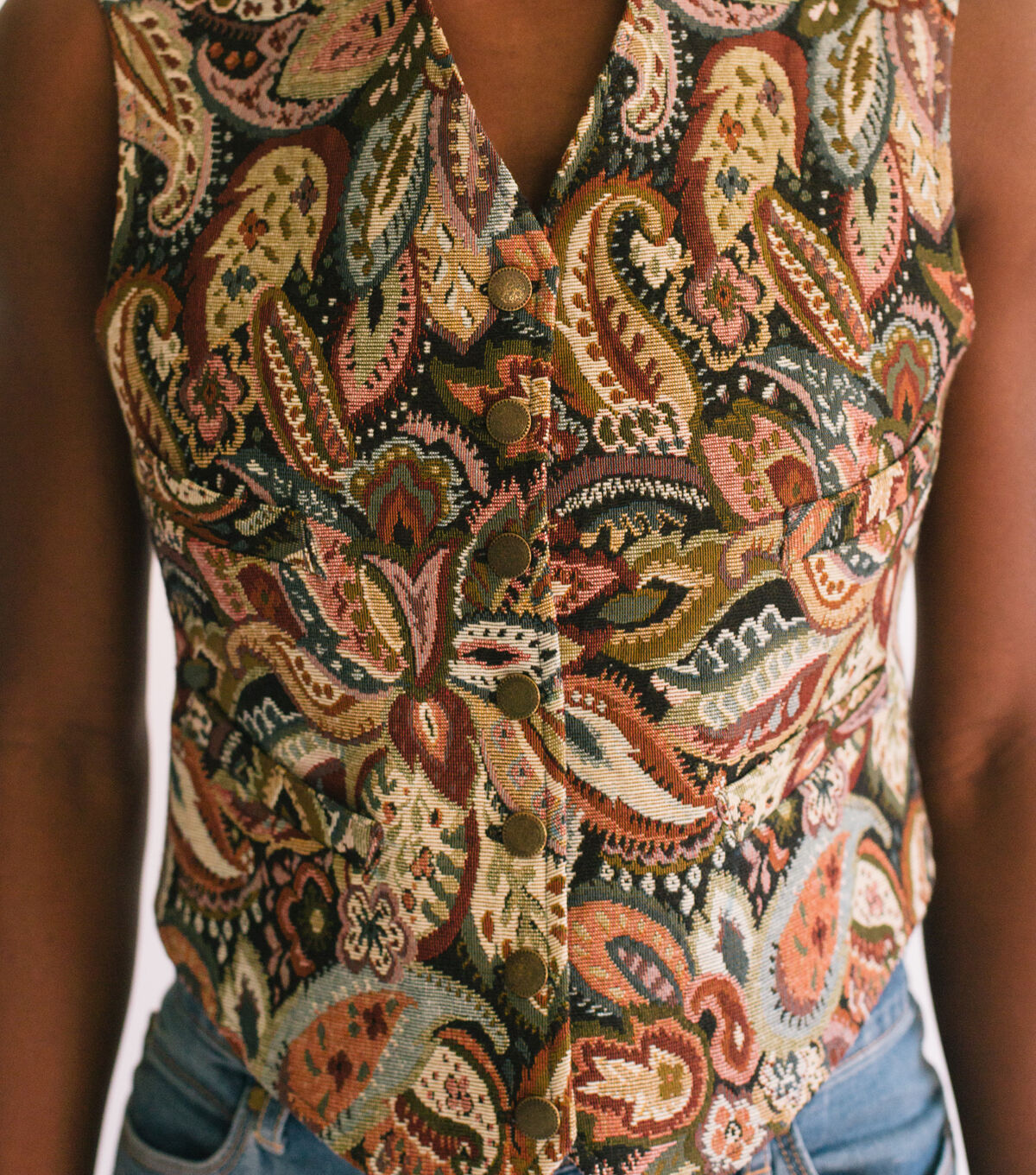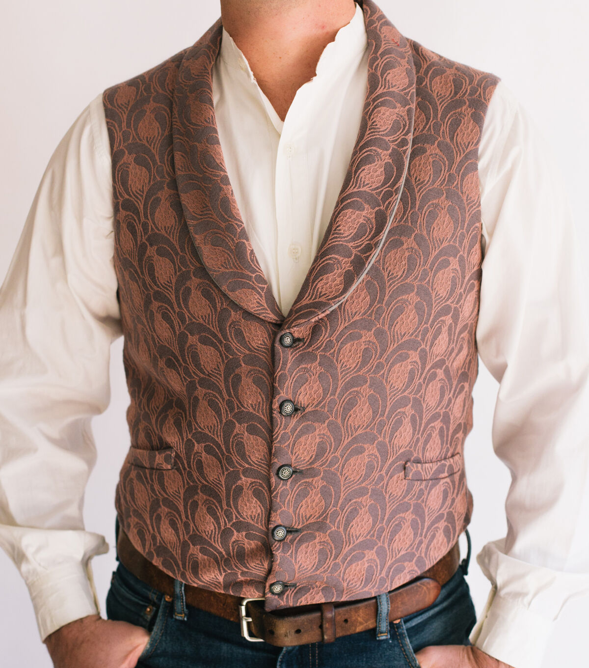 - Suggested fabrics: Medium to heavyweight fabrics of cotton, silk, wool, linen, synthetics or blends with or without nap, such as brocade, velvet, corduroy, canvas, pique, velveteen, or synthetic suede. The bias cut of the shawl-collar vest is especially suitable for stripes or plaids.