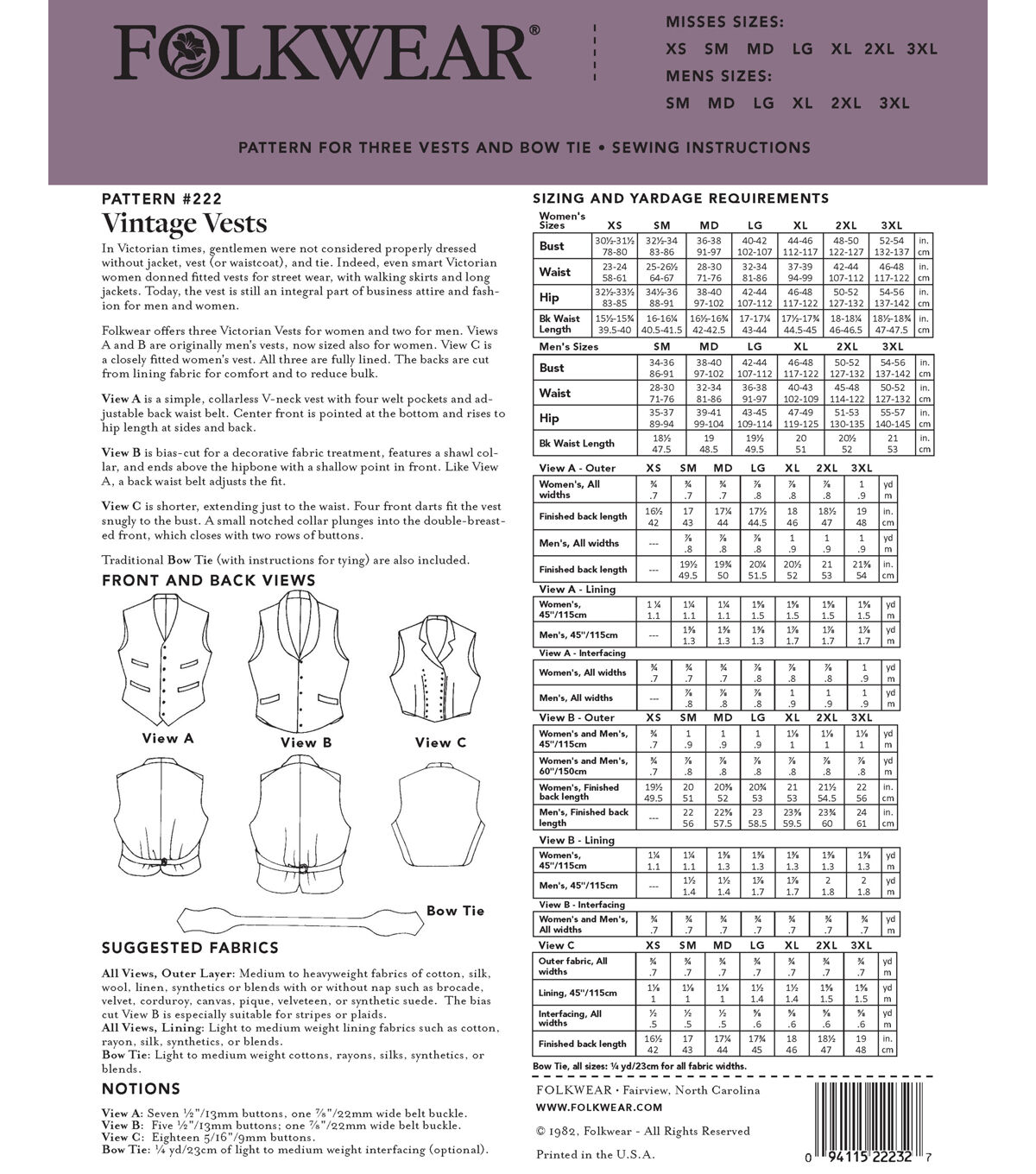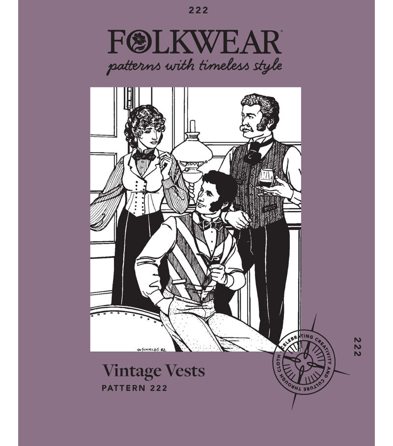 In Victorian times, gentlemen were not considered properly dressed without a jacket, vest (or waistcoat), and tie. Indeed, even smart Victorian women donned fitted vests for street wear, with walking skirts and long jackets. Today, the vest is still an integral part of business attire and fashion for men and women. Folkwear offers sewing patterns for three Victorian Vests for women and two for men. Views A and B are originally men's vests, now sized also for women. View C is a closely fitted women's vest. All three are fully lined; the backs are cut from lining fabric for comfort and to reduce bulk. View A is a simple, collarless V-neck vest with four welt pockets and adjustable back waist belt. Center front is pointed at the bottom and rises to high hip length at sided and back. View B is bias-cut for a decorative fabric treatment, featured a shawl collar, and ends above the hipbones with a shallow point in front. Like View A, a back waist belt adjusts the fit. View C is shorter, extending just to the waist. Four front darts fit the vest snugly to the bust. A small notched collar plunges into the double-breasted front, which closes with two rows of buttons. Traditional Bow Tie (with instructions for tying) are also included.