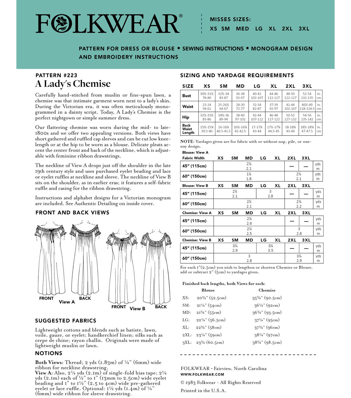 - Suggested Fabrics: Light-weight cottons and blends such as batiste, lawn, voile, gauze, or eyelet; handkerchief linen; silks such as crepe de chine; rayon challis. Originals were made of lightweight muslin or linen.