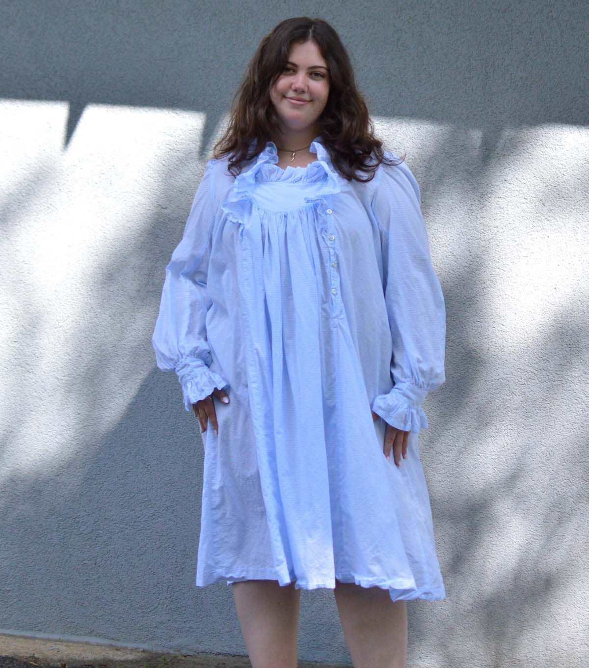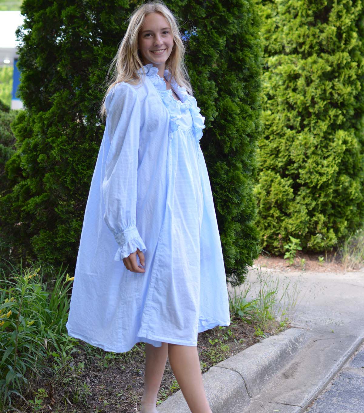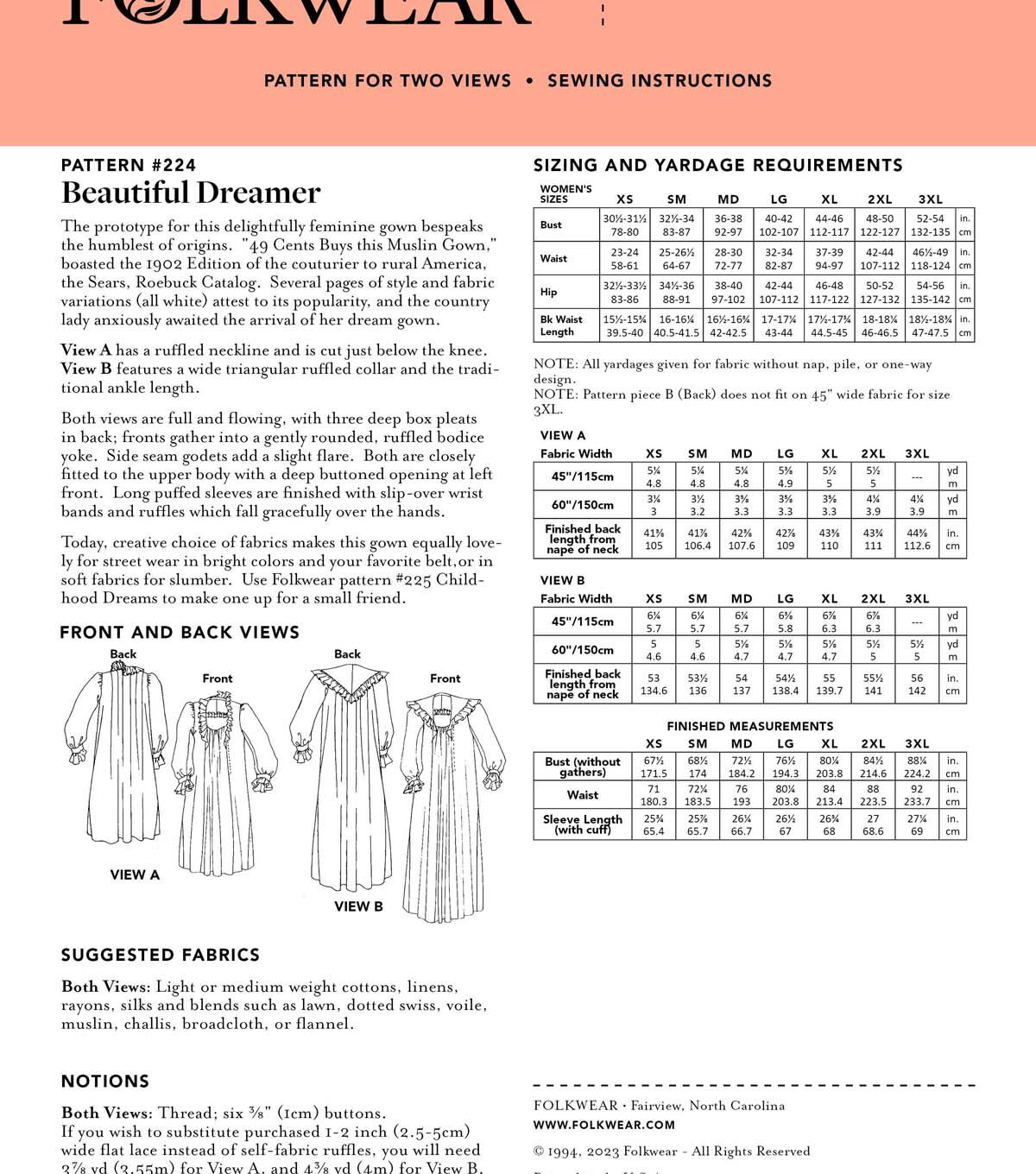 The prototype for the sewing pattern of this delightfully feminine gown bespeaks the humblest of origins. “49 Cents Buys this Muslin Gown,” boasted the 1902 Edition of the couturier of rural America—the Sears, Roebuck Catalog. Several pages of style and fabric variations (all white) attest to its popularity, and the country lady anxiously awaited the arrival of her dream gown. View A has a ruffled neckline and is cut just below the knee. View B features a wide triangular ruffled collar and the traditional ankle-length. Both views are full and flowing, with three deep box pleats in back; fronts gather into a gently rounded, ruffled bodice yoke. Side seam godets add a slight flare. Both are closely fitted to the upper body with a deep buttoned opening at left front (which can also be omitted). Long puffed sleeves are finished with slip-over wristbands and ruffles that fall gracefully over the hands. Today, creative choice of fabric makes this beauty equally lovely for street wear in bright colors and your favorite belt, or in soft fabrics for slumber.