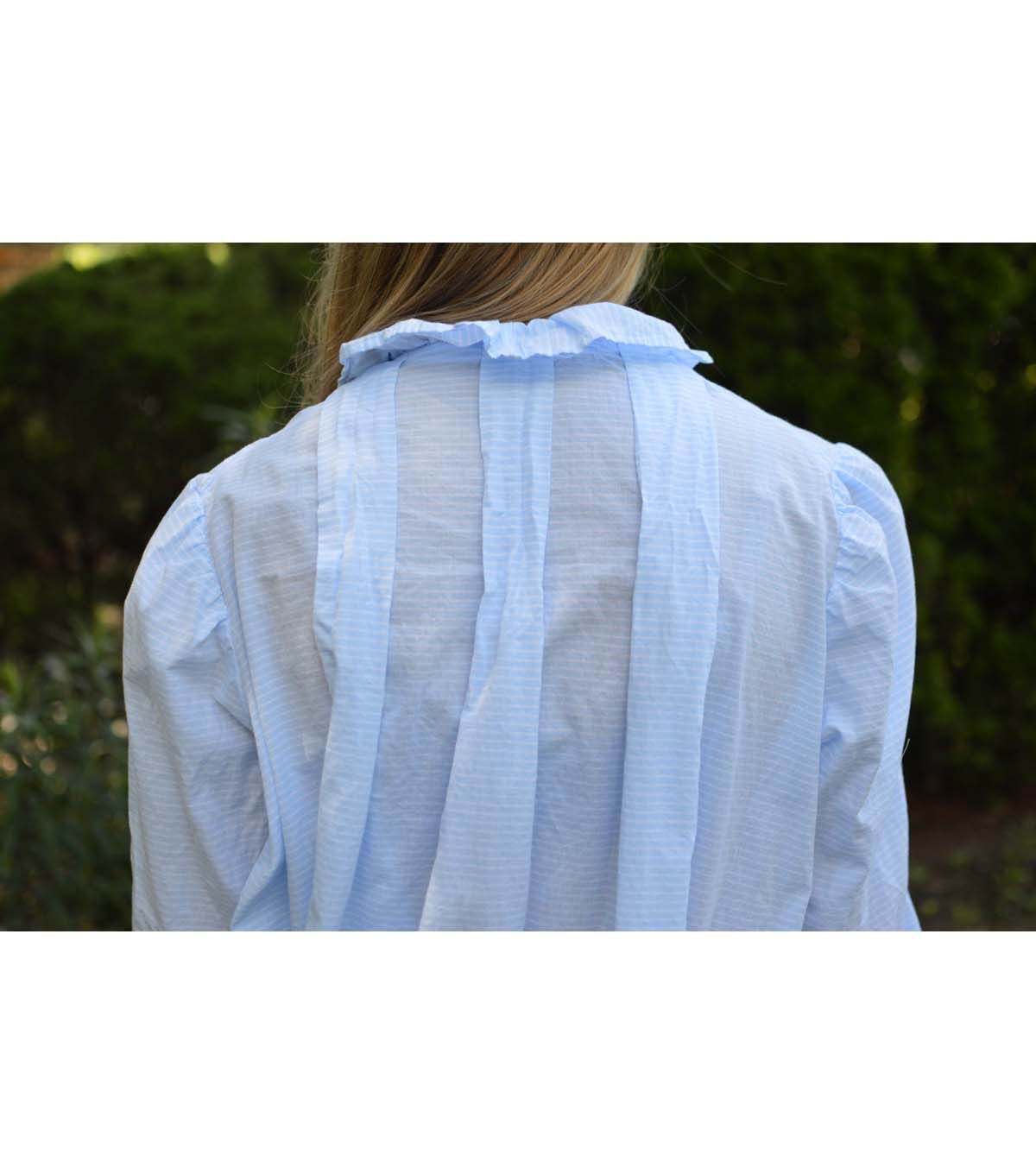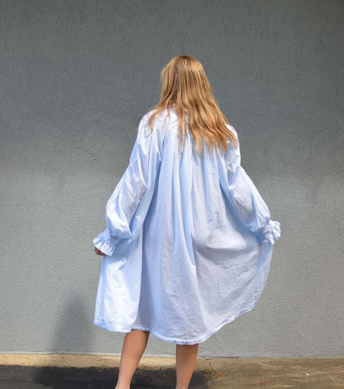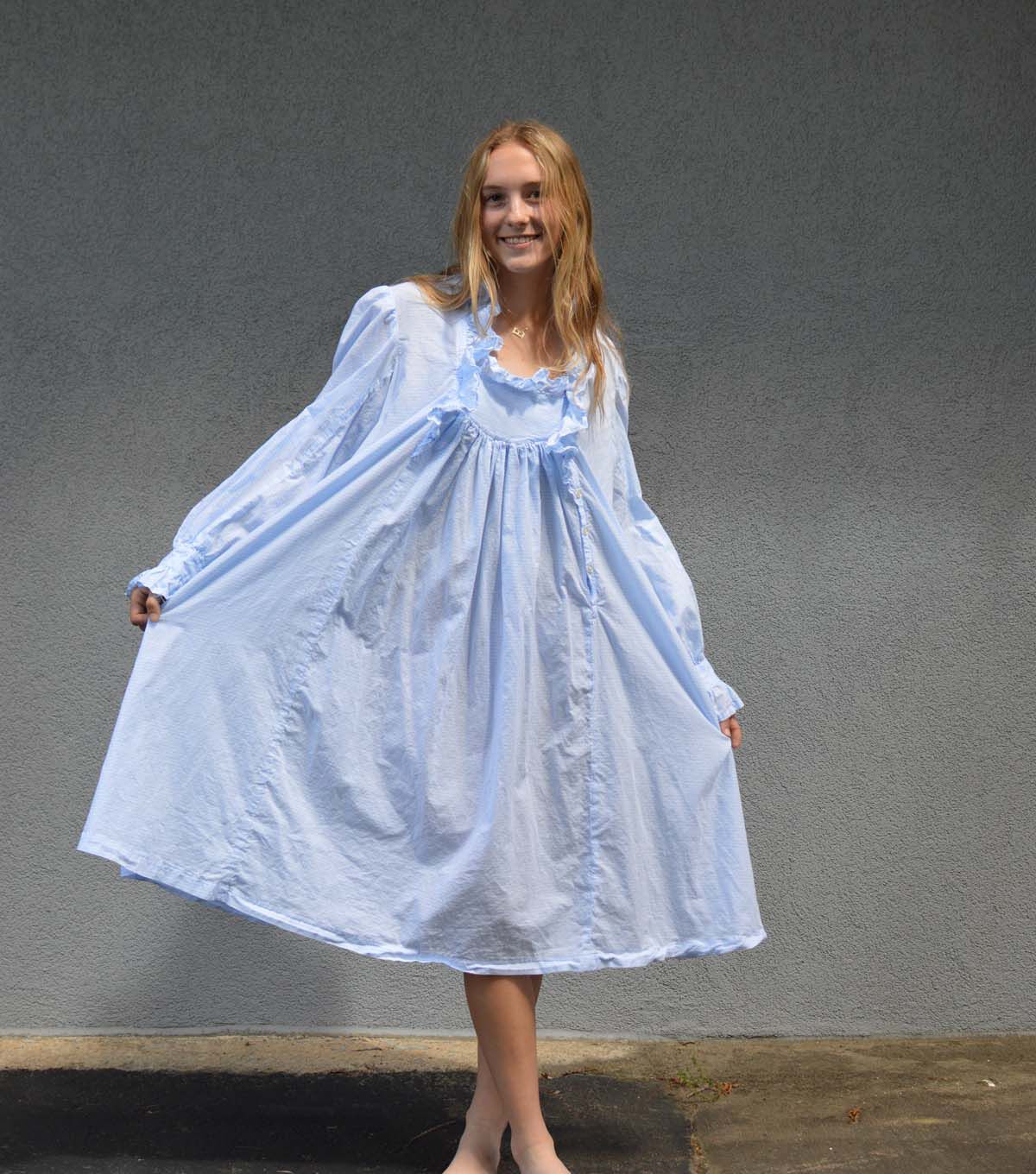 The prototype for the sewing pattern of this delightfully feminine gown bespeaks the humblest of origins. “49 Cents Buys this Muslin Gown,” boasted the 1902 Edition of the couturier of rural America—the Sears, Roebuck Catalog. Several pages of style and fabric variations (all white) attest to its popularity, and the country lady anxiously awaited the arrival of her dream gown. View A has a ruffled neckline and is cut just below the knee. View B features a wide triangular ruffled collar and the traditional ankle-length. Both views are full and flowing, with three deep box pleats in back; fronts gather into a gently rounded, ruffled bodice yoke. Side seam godets add a slight flare. Both are closely fitted to the upper body with a deep buttoned opening at left front (which can also be omitted). Long puffed sleeves are finished with slip-over wristbands and ruffles that fall gracefully over the hands. Today, creative choice of fabric makes this beauty equally lovely for street wear in bright colors and your favorite belt, or in soft fabrics for slumber.