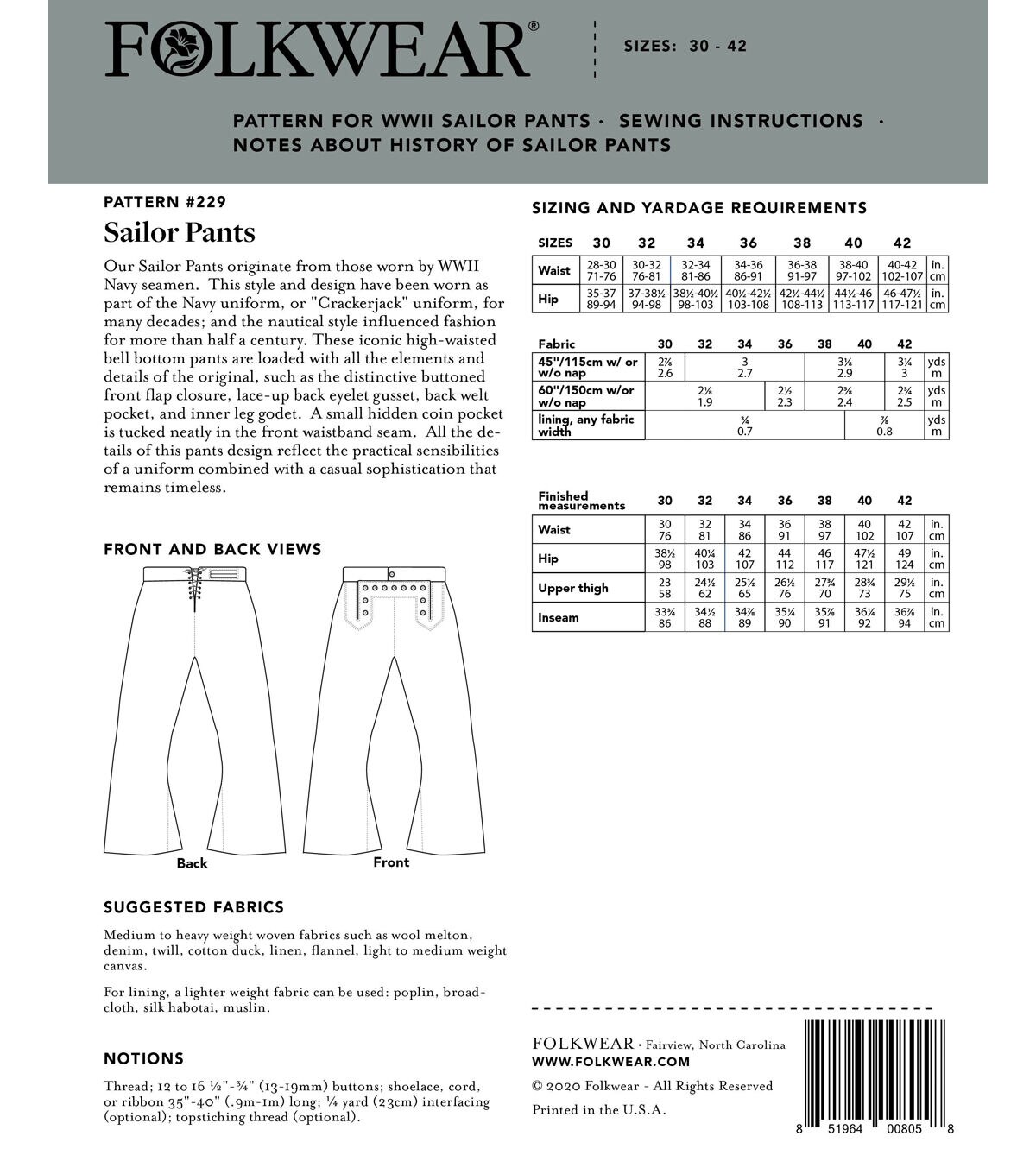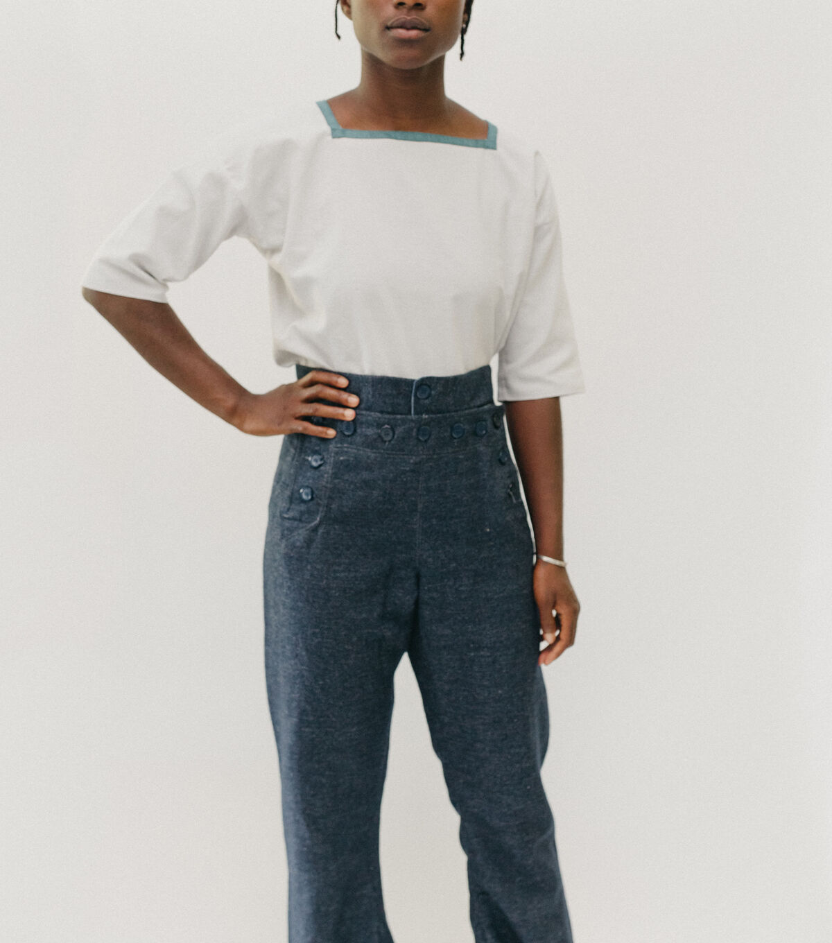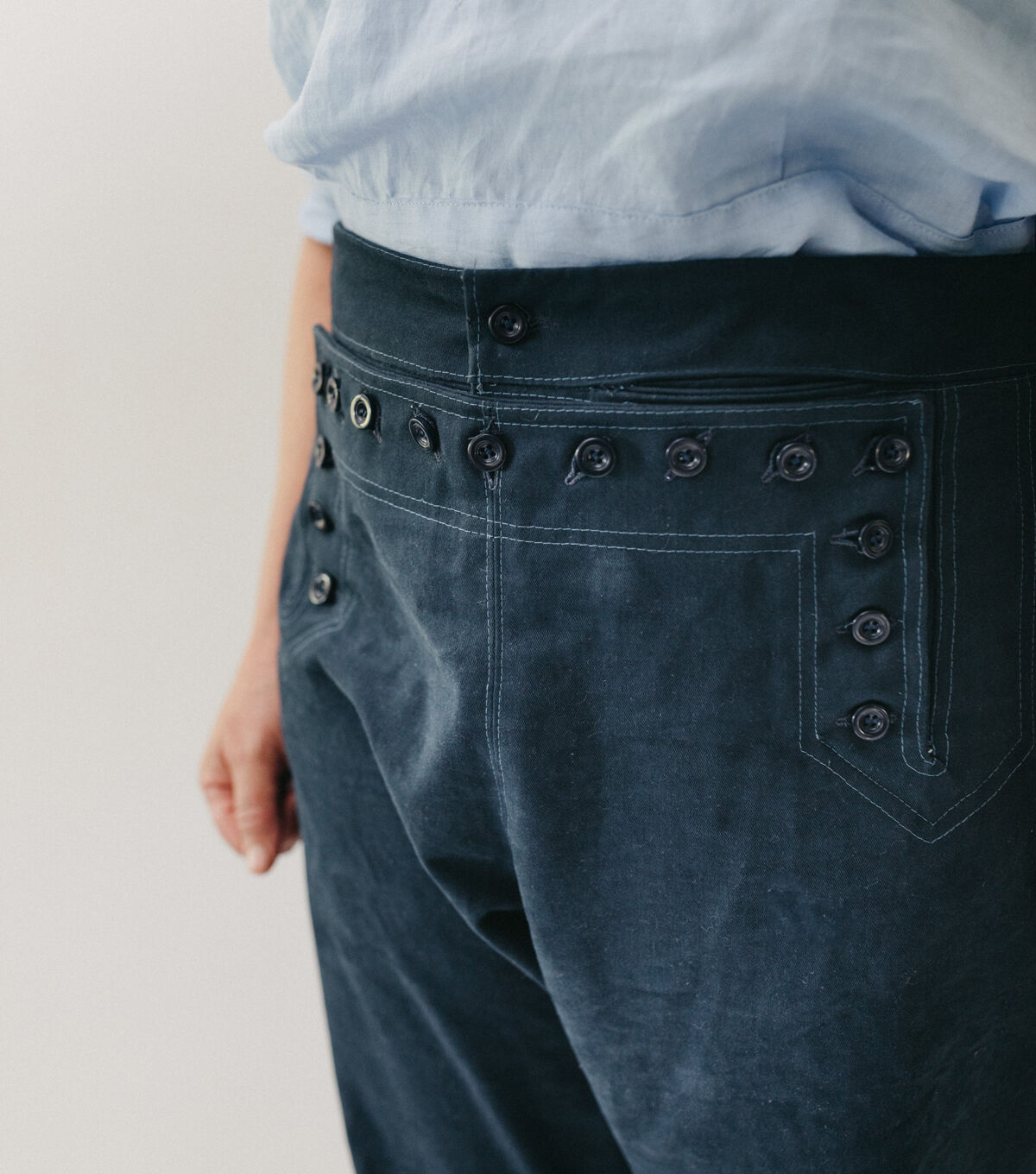 These Sailor Pants originate from those worn by WWII Navy seamen. This style and design have been worn as part of the Navy uniform, or "Crackerjack" uniform, for many decades; and the nautical style influenced fashion for more than half a century. These iconic high-waisted bell bottom pants are loaded with all the elements and details of the original, such as the distinctive buttoned front flap closure, lace-up back eyelet gusset, back welt pocket, and inner leg godet. A small hidden coin pocket is tucked neatly in the front waistband seam. All the details of this pants design reflect the practical sensibilities of a uniform combined with a casual sophistication that remains timeless.