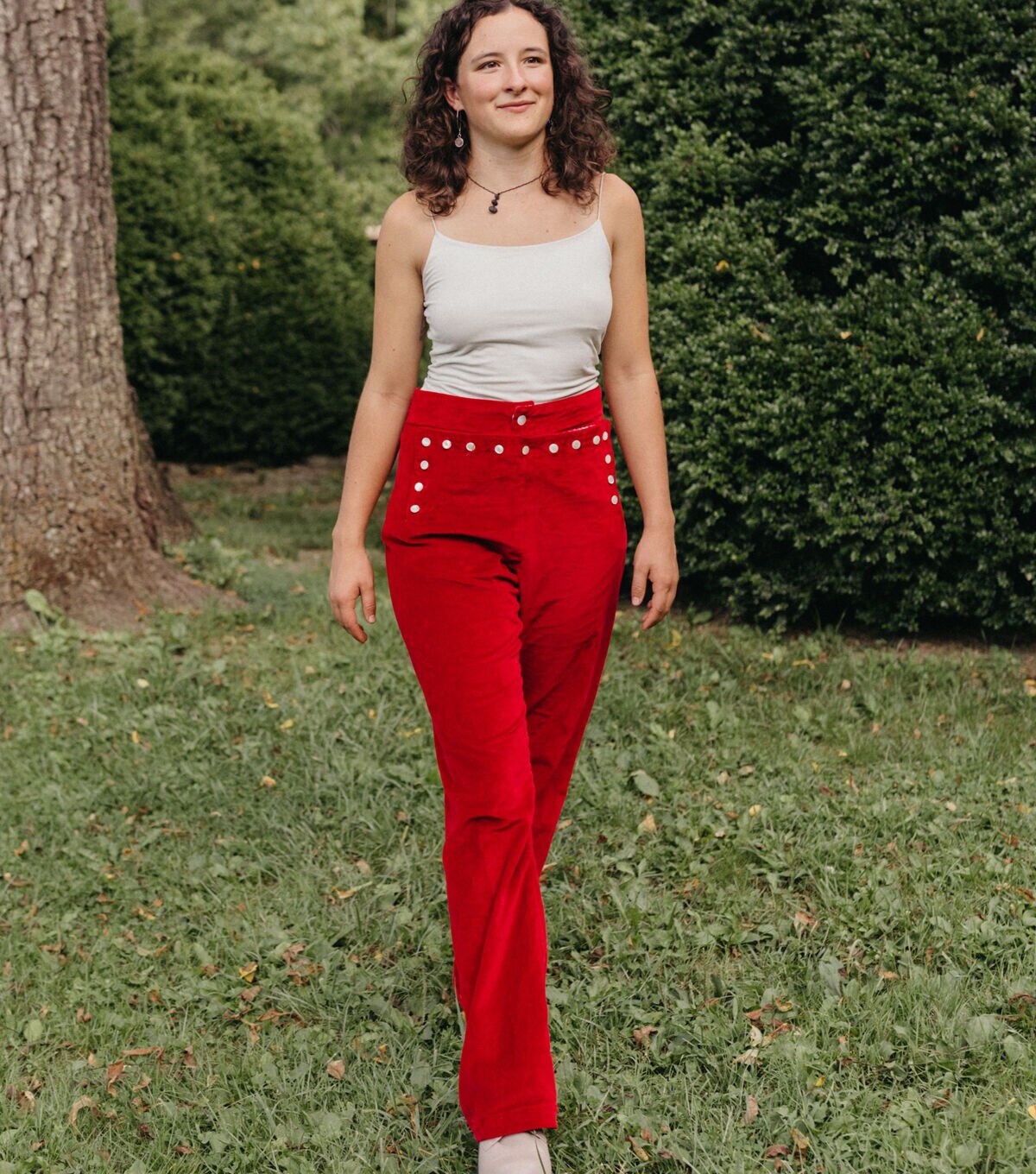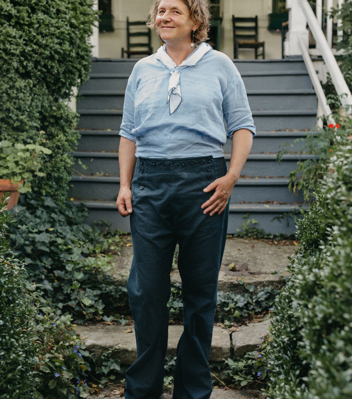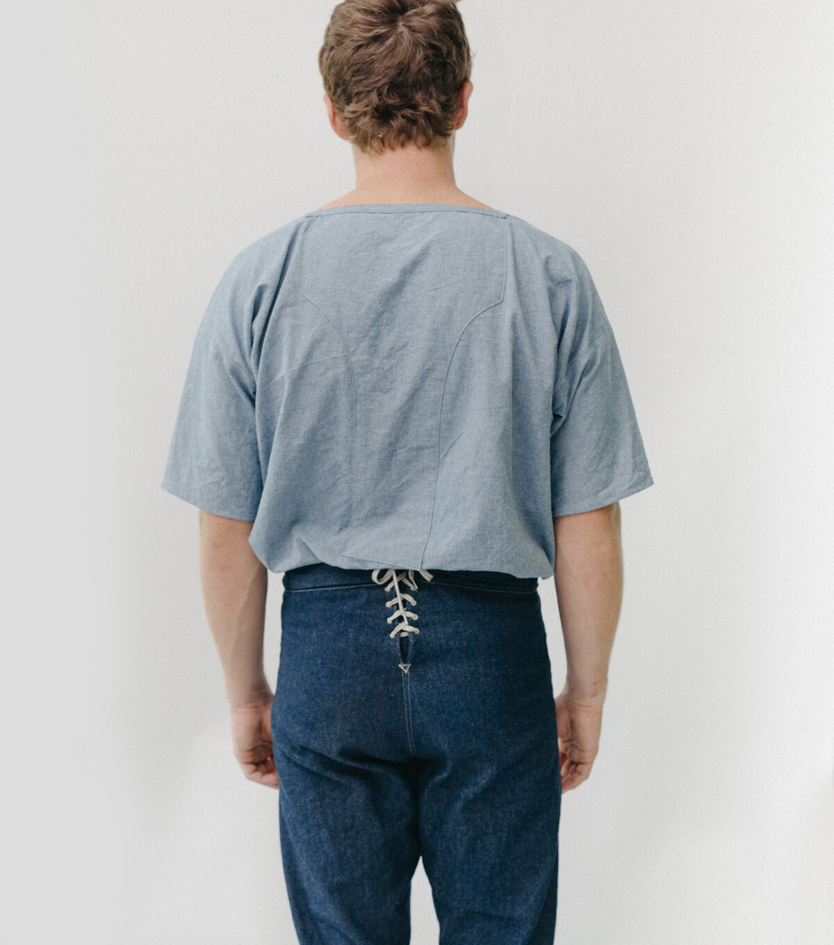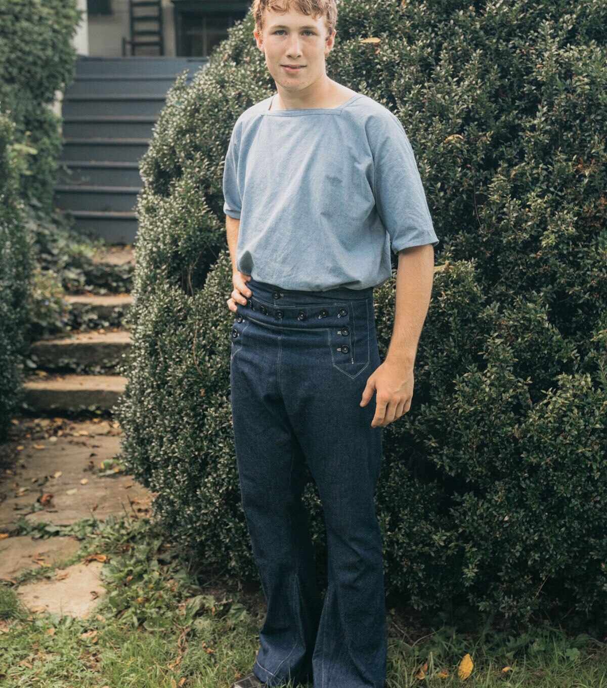 These Sailor Pants originate from those worn by WWII Navy seamen. This style and design have been worn as part of the Navy uniform, or "Crackerjack" uniform, for many decades; and the nautical style influenced fashion for more than half a century. These iconic high-waisted bell bottom pants are loaded with all the elements and details of the original, such as the distinctive buttoned front flap closure, lace-up back eyelet gusset, back welt pocket, and inner leg godet. A small hidden coin pocket is tucked neatly in the front waistband seam. All the details of this pants design reflect the practical sensibilities of a uniform combined with a casual sophistication that remains timeless.