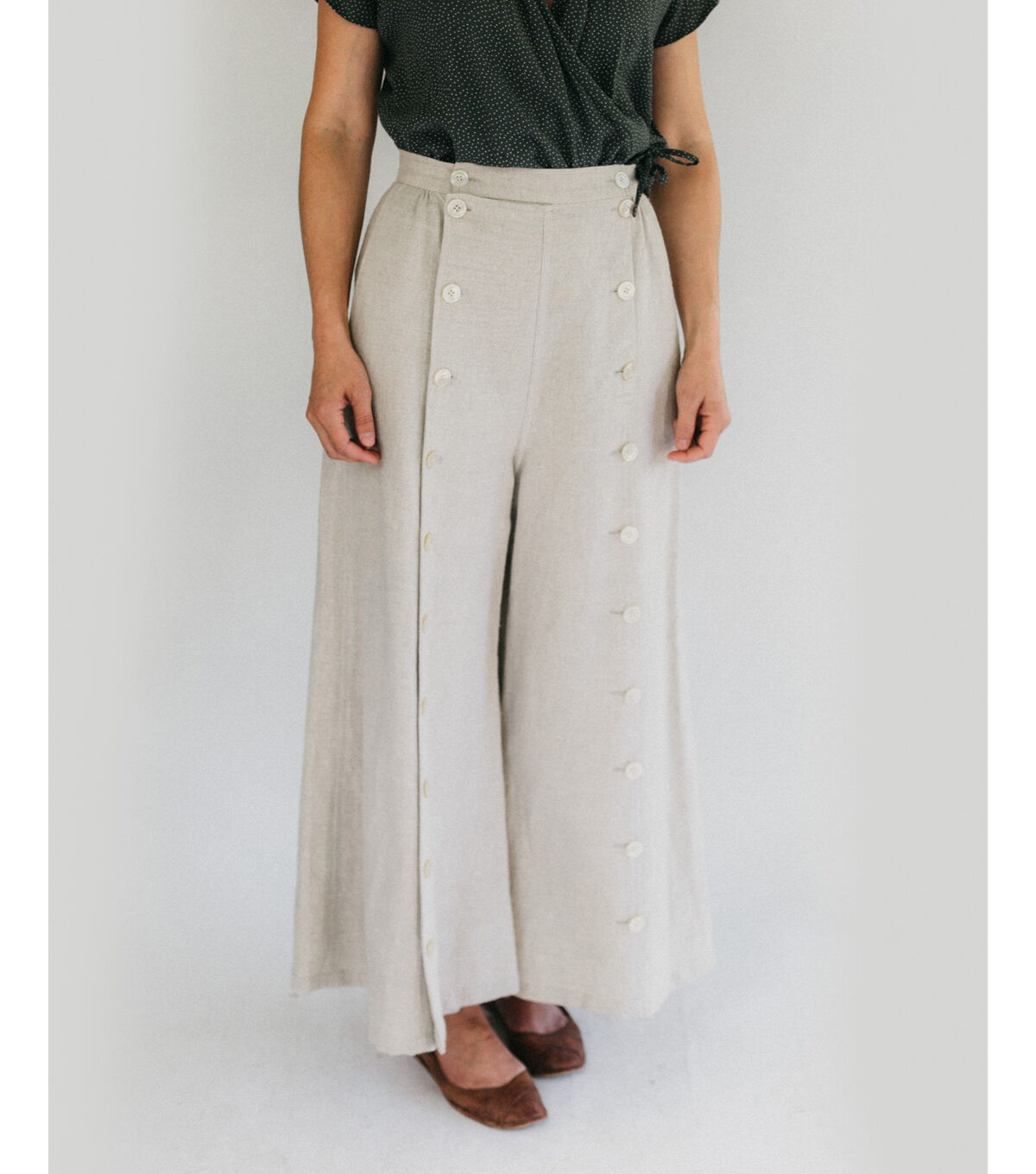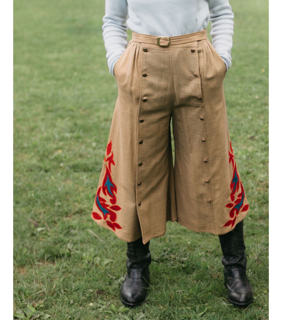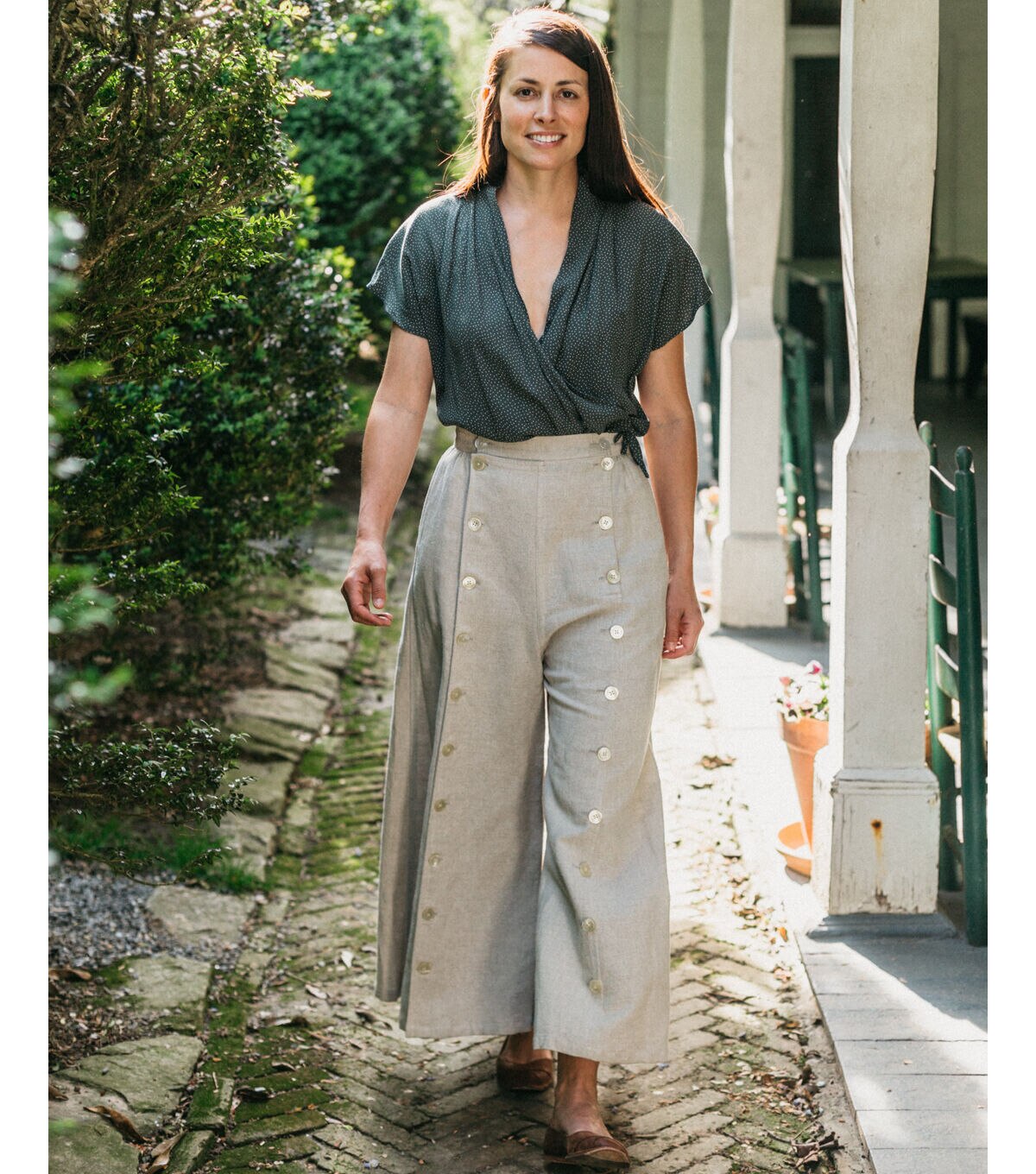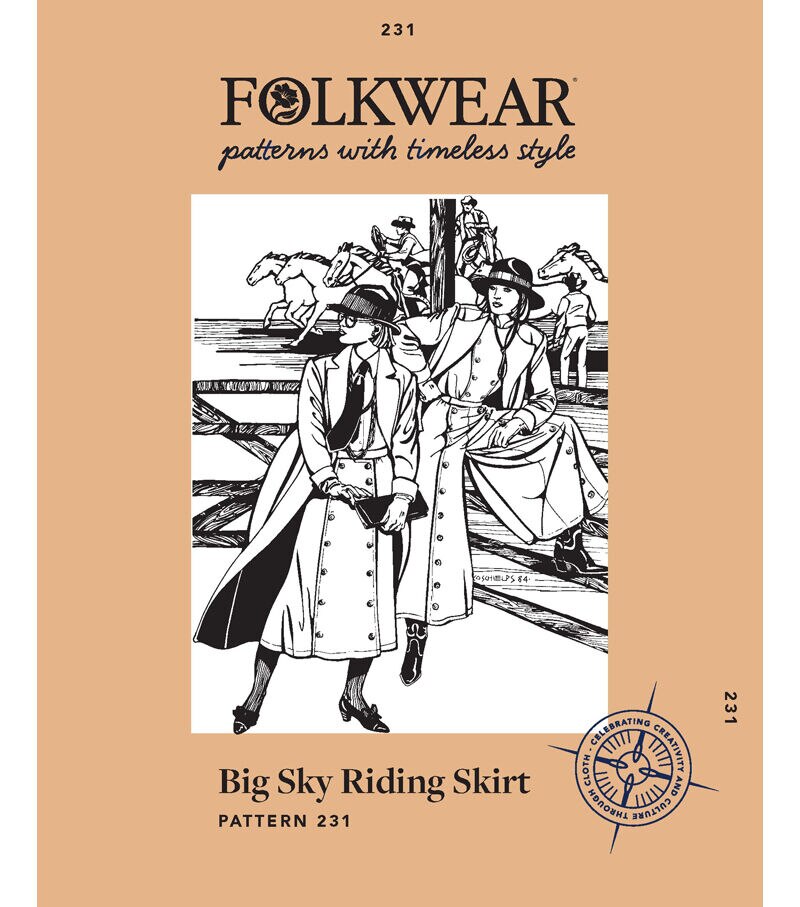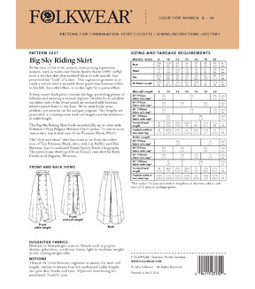 At the turn of the 20th century enterprising equestrian women, such as rodeo star Fanny Sperry Steele (1887-1983), wore a divided skirt, or split skirt, that enabled them to ride astride, but preserved the "look" of a skirt. This garment is actually a culotte with a movable front panel that buttons either to the left, for a skirt effect, or to the right for a pant effect. This sewing pattern has a deep center back pleat conceals the legs, providing plenty of fullness and assuring a smooth hipline. Double front plackets on either side of the front panel are secured with buttons, which extend down to the hem. We've added side seam pockets, not provided on the antique original. Two lengths are presented: a contemporary mid-calf length and the traditional ankle-length.