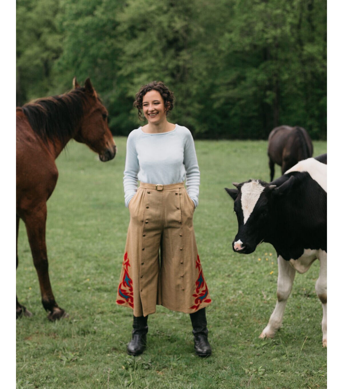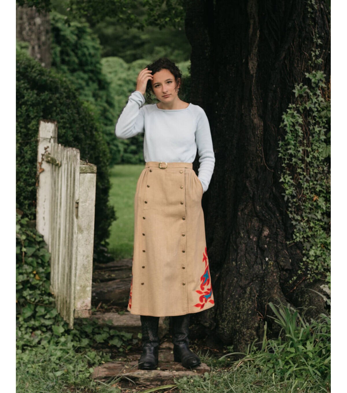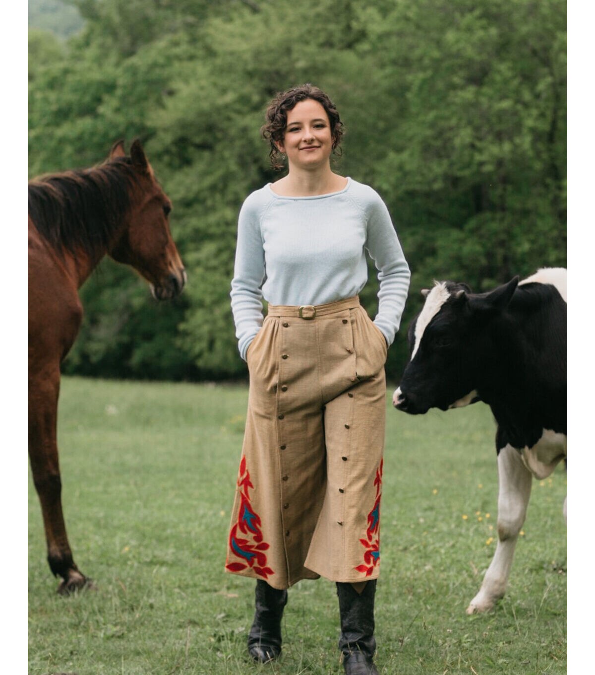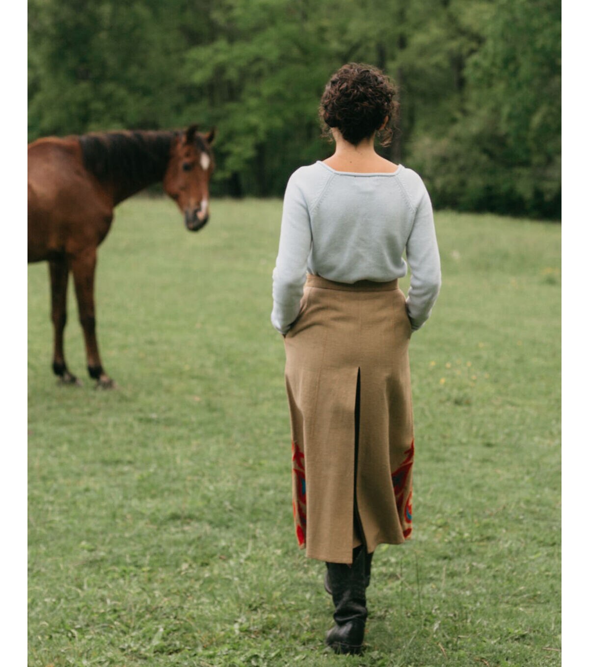 At the turn of the 20th century enterprising equestrian women, such as rodeo star Fanny Sperry Steele (1887-1983), wore a divided skirt, or split skirt, that enabled them to ride astride, but preserved the "look" of a skirt. This garment is actually a culotte with a movable front panel that buttons either to the left, for a skirt effect, or to the right for a pant effect. This sewing pattern has a deep center back pleat conceals the legs, providing plenty of fullness and assuring a smooth hipline. Double front plackets on either side of the front panel are secured with buttons, which extend down to the hem. We've added side seam pockets, not provided on the antique original. Two lengths are presented: a contemporary mid-calf length and the traditional ankle-length.