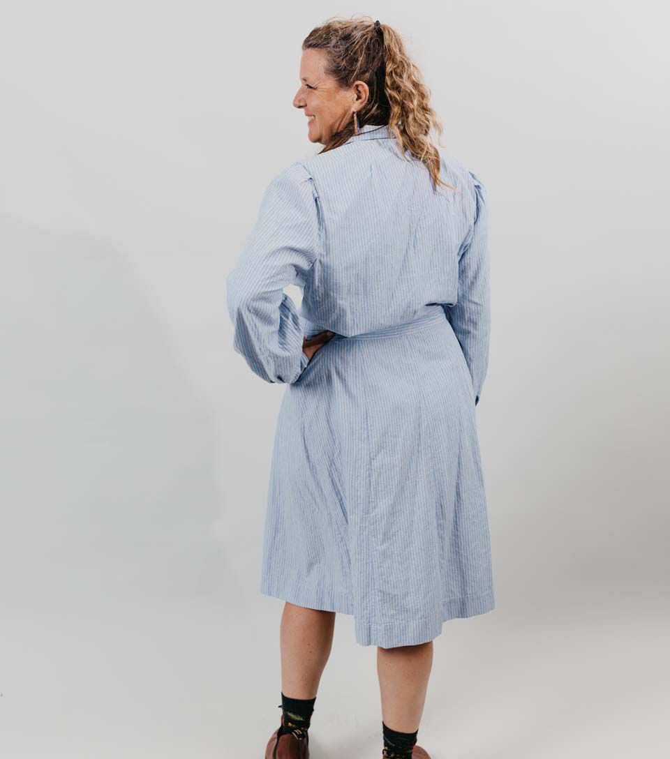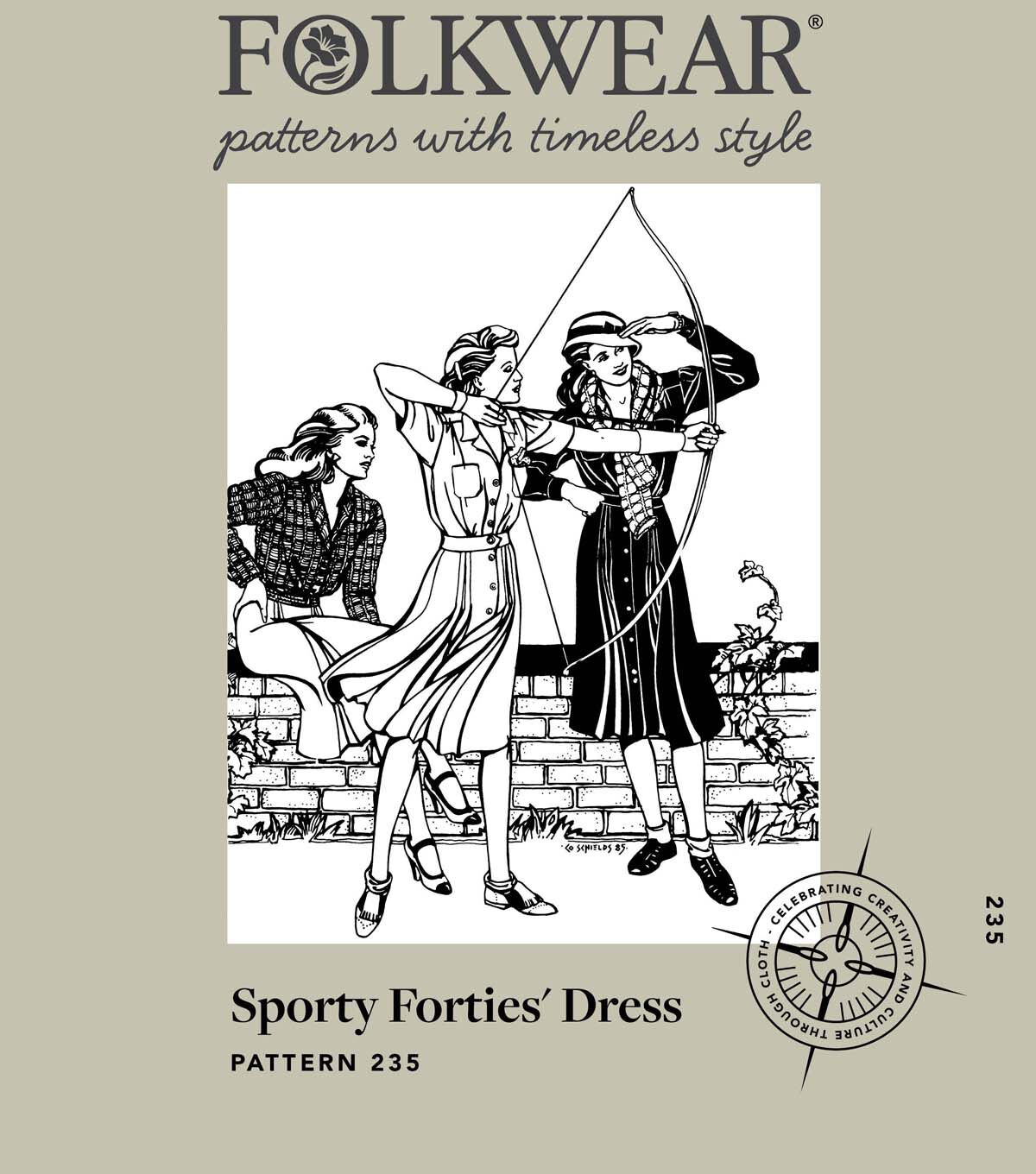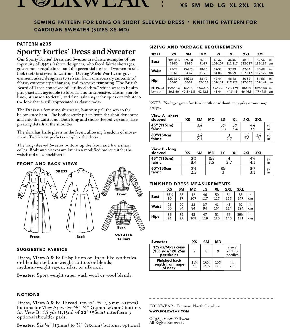 Folkwear's Sporty Forties' Dress and Sweater patterns are classic examples of the ingenuity of the 1940s fashion designers. They faced fabric shortages, government regulations, and the perennial desire of women to still look their best even in wartime. There was a sense of patriotism, even in fashion. The government asked designers not to use unnecessary amounts of fabric, not to make extreme changes, and not to indulge in excessive trimming. The British Board of Trade conceived of "utility clothes", which were to be simple, practical, agreeable to look at, and inexpensive. The clever results are a tribute to the designers' art. Clean simple lines and fine tailoring techniques contribute to the look that is still appreciated as classic today. Our Sporty Forties' Dress sewing pattern is a shirtwaist, buttoning all the way to just-below-the-knee hem. The bodice softly pleats from the shoulder seams and into the waistband. Both long (View B) and short sleeved versions (View A) have pleating detail at the shoulder. The skirt sports knife pleats in the front allowing freedom of movement. Two breast pockets complete the dress. To compliment this dress, a Sporty Forties' Sweater included in this pattern, with complete knitting instructions for this cardigan. The long-sleeved sweater buttons up the front and has a shawl collar. Body and sleeves are knit in a modified basket stitch; the waistband uses stockinette.