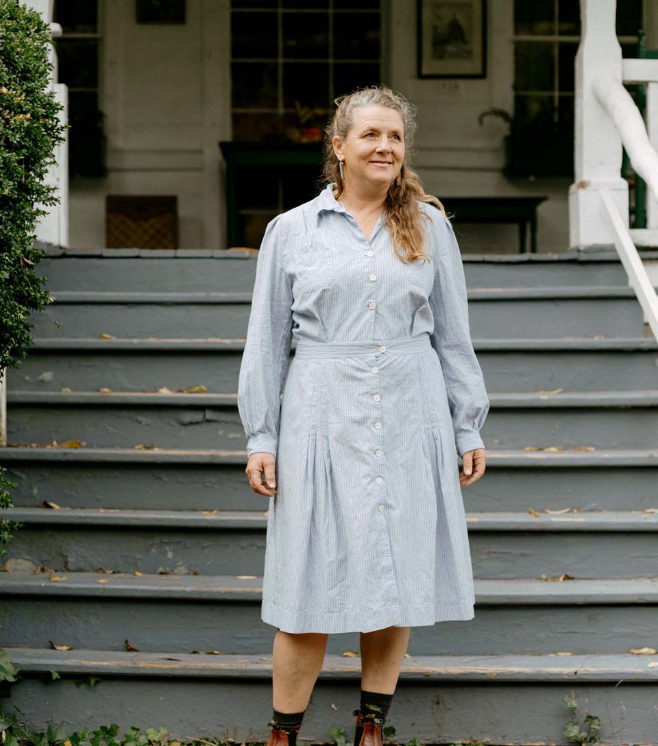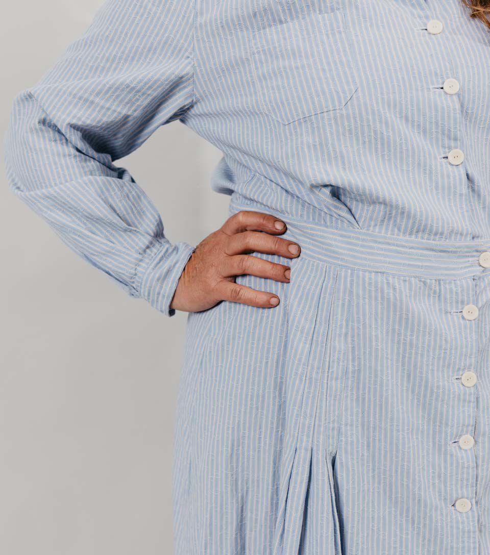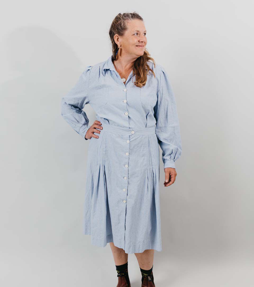 Folkwear's Sporty Forties' Dress and Sweater patterns are classic examples of the ingenuity of the 1940s fashion designers. They faced fabric shortages, government regulations, and the perennial desire of women to still look their best even in wartime. There was a sense of patriotism, even in fashion. The government asked designers not to use unnecessary amounts of fabric, not to make extreme changes, and not to indulge in excessive trimming. The British Board of Trade conceived of "utility clothes", which were to be simple, practical, agreeable to look at, and inexpensive. The clever results are a tribute to the designers' art. Clean simple lines and fine tailoring techniques contribute to the look that is still appreciated as classic today. Our Sporty Forties' Dress sewing pattern is a shirtwaist, buttoning all the way to just-below-the-knee hem. The bodice softly pleats from the shoulder seams and into the waistband. Both long (View B) and short sleeved versions (View A) have pleating detail at the shoulder. The skirt sports knife pleats in the front allowing freedom of movement. Two breast pockets complete the dress. To compliment this dress, a Sporty Forties' Sweater included in this pattern, with complete knitting instructions for this cardigan. The long-sleeved sweater buttons up the front and has a shawl collar. Body and sleeves are knit in a modified basket stitch; the waistband uses stockinette.