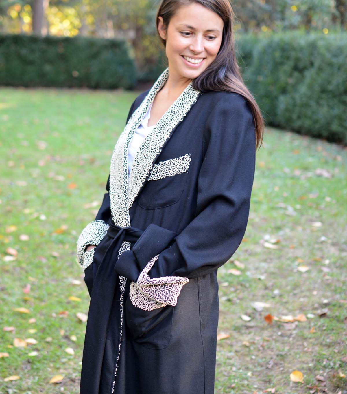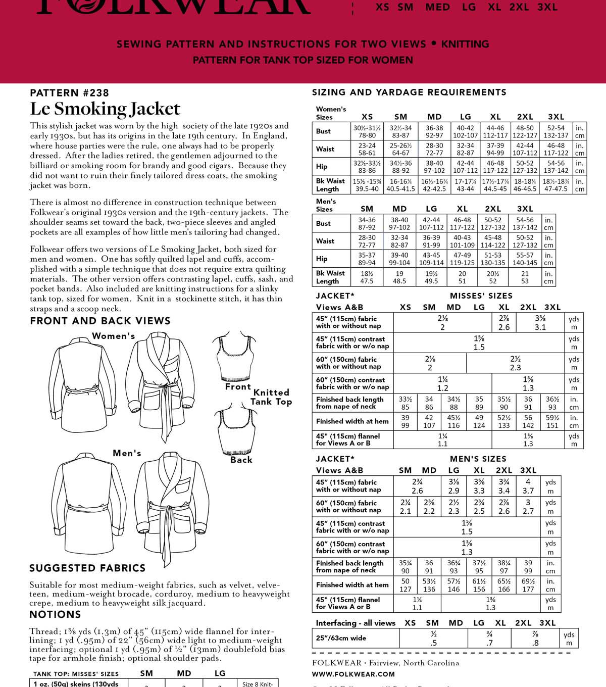 This is a sewing pattern for the stylish jacket worn by the high society of the late 1920s and early 1930s, but has its origins in the late 19th century. In England, where house parties were the rule, one always had to be properly dressed. After the ladies retired, the gentlemen adjourned to the billiard or smoking room for brandy and good cigars. Because they did not want to ruin their finely tailored dress coats, the smoking jacket was born. There is almost no difference in construction technique between Folkwear's original 1930s version and the 19th-century jackets. The shoulder seams set toward the back, two-piece sleeves and angled pockets are all examples of how little men's tailoring had changed. Folkwear offers two versions of Le Smoking Jacker, both sized for men and women. One has softly quilted lapel and cuffs, accomplished with a simple technique that does not require extra quilting materials. The other versions offers contrasting lapel, cuffs, sash, and pocket bands. Also included are knitting instructions for a slinky tank top, sized for women. Knit in a stockinette stitch, it has think straps and a scoop neck.