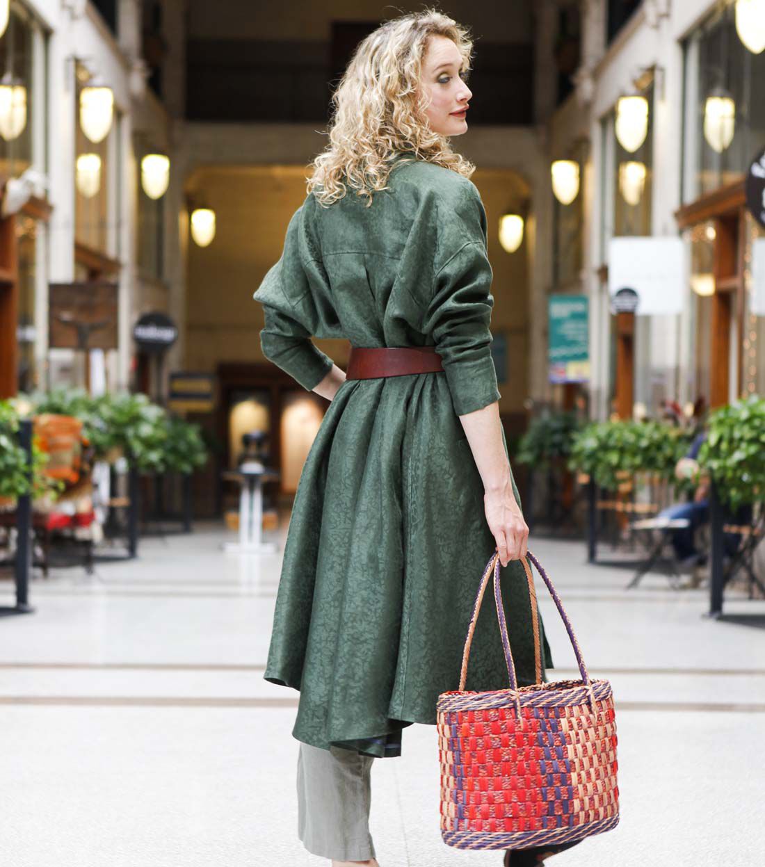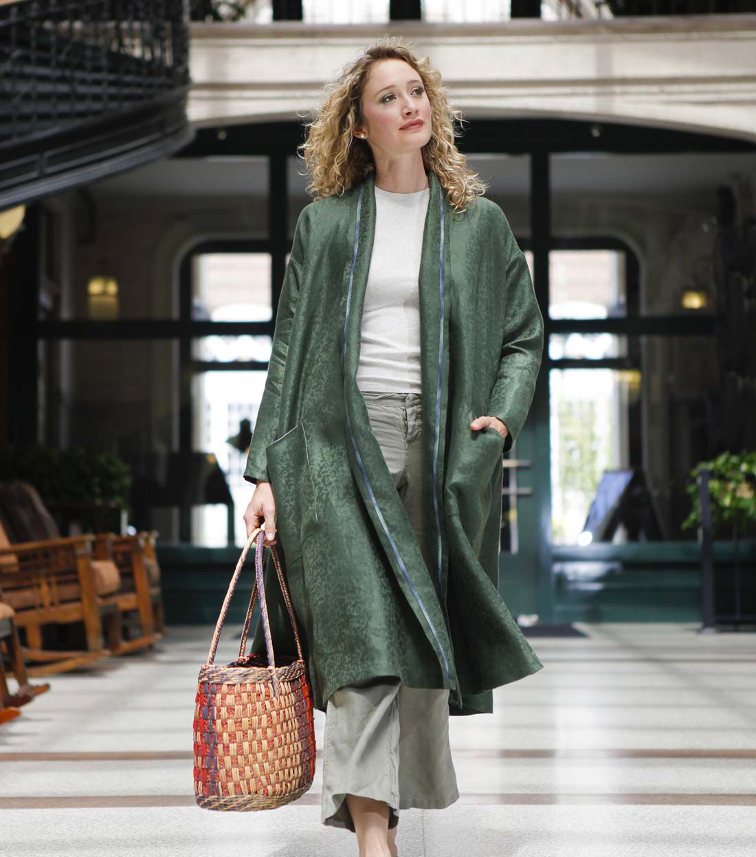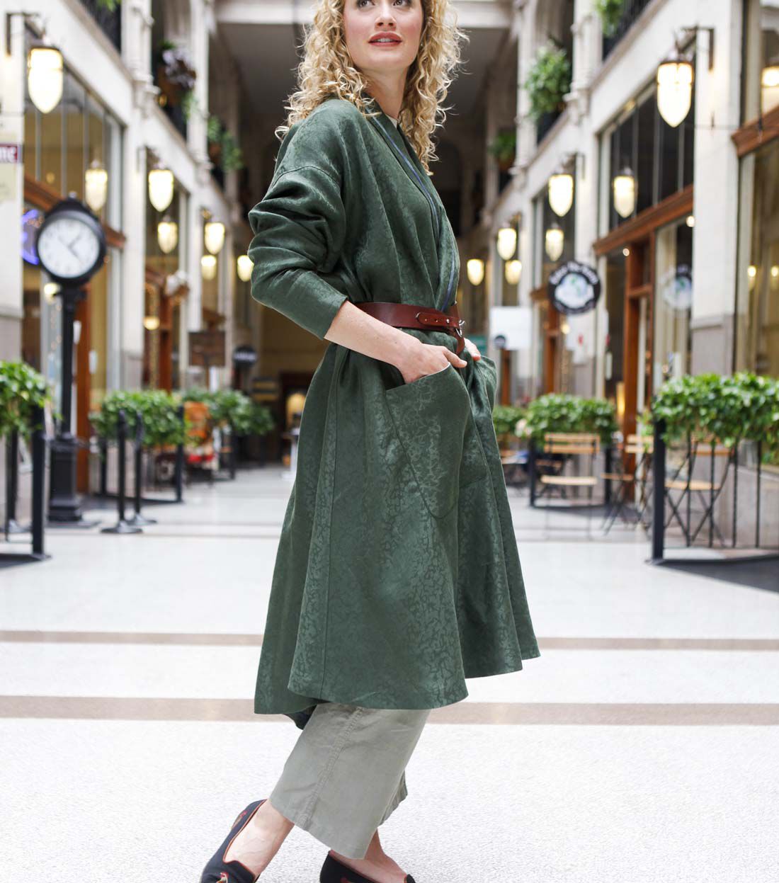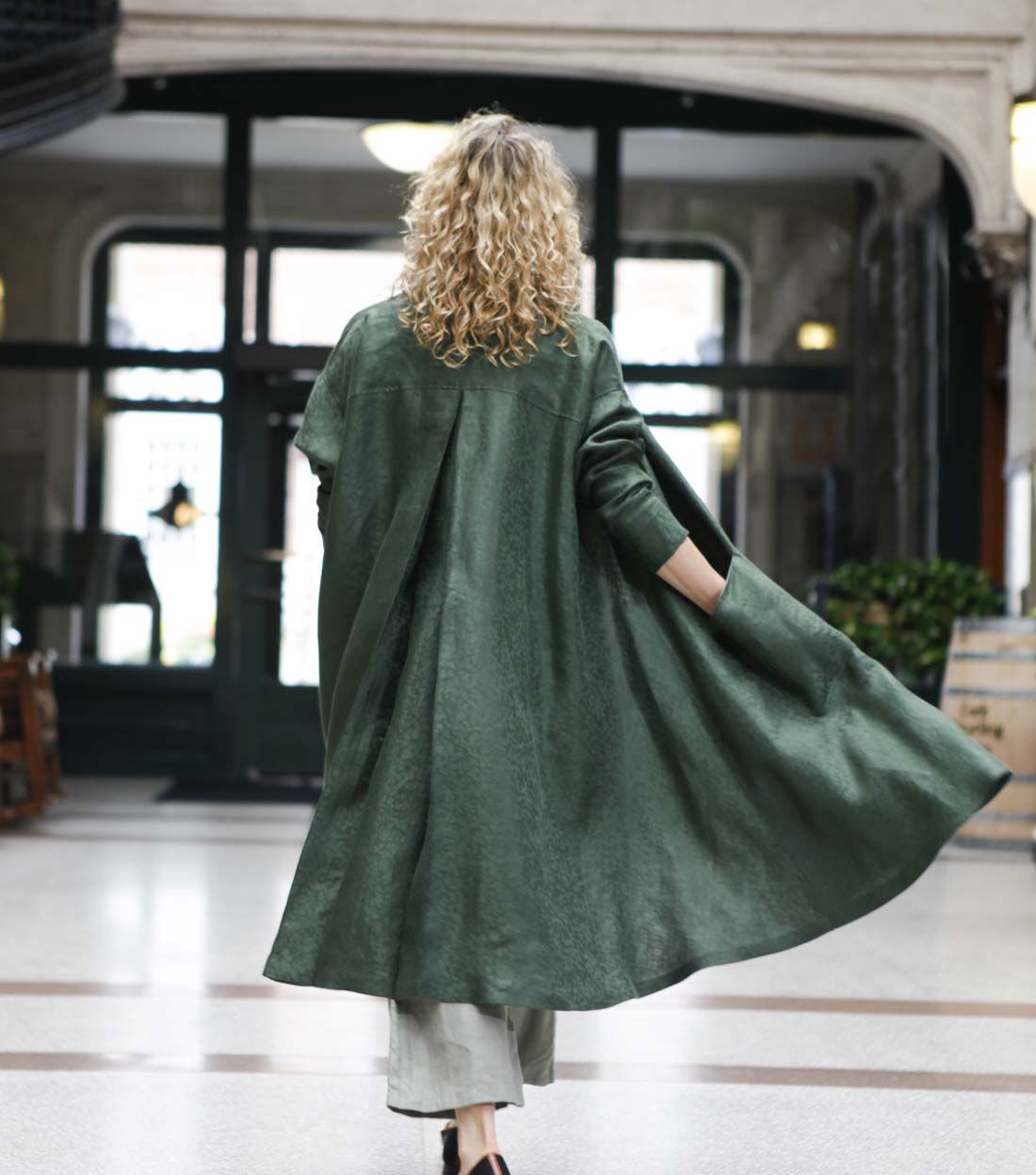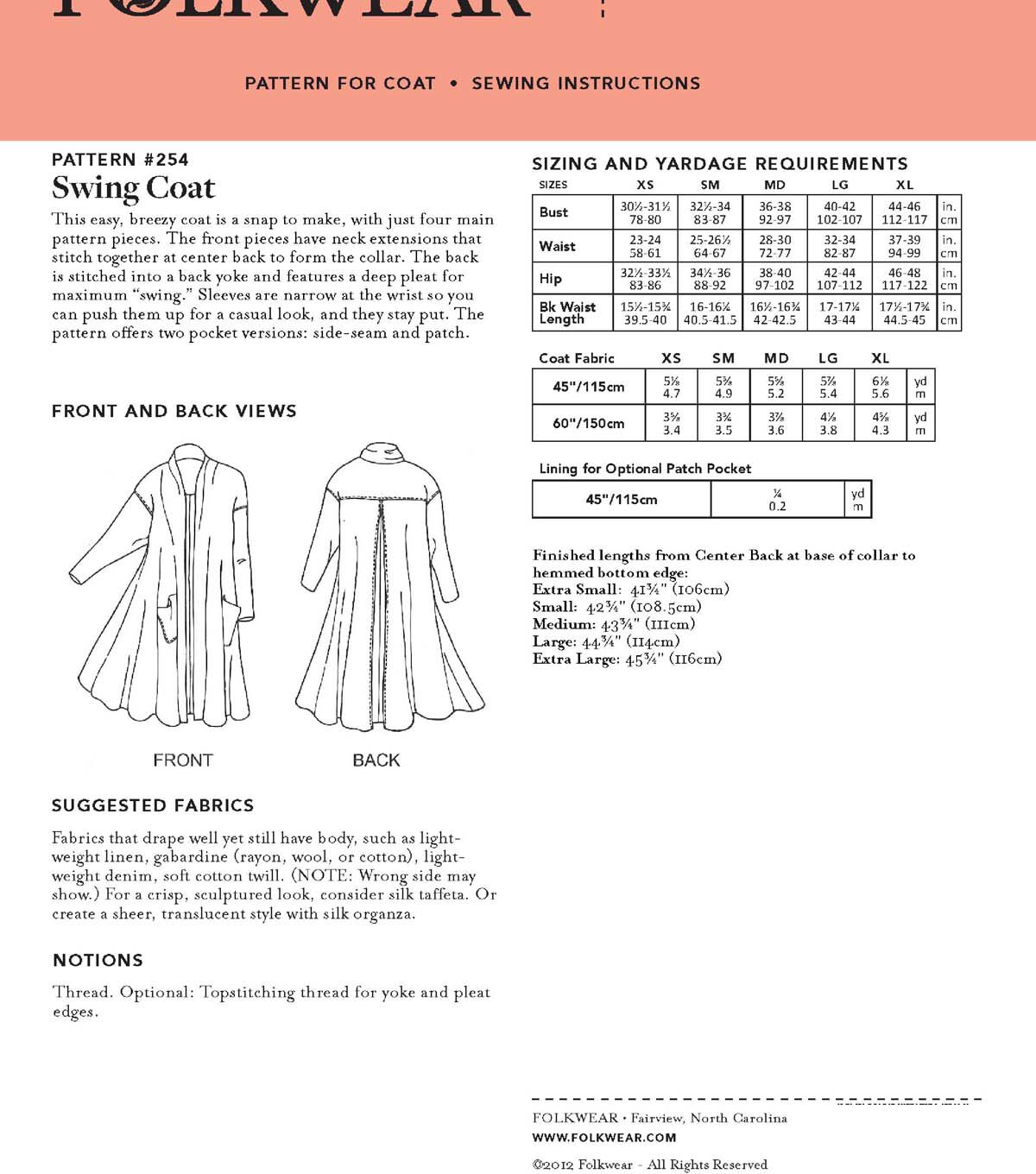 This easy, breezy coat is a snap to make, with just four main pattern pieces. The front pieces have neck extensions that stitch together at center back to form the collar. The back is stitched into a back yoke and features a deep pleat for maximum "swing." Sleeves are narrow at the wrist so you can push them up for a casual look, and they stay put. The pattern offers two pocket versions: side-seam and patch.