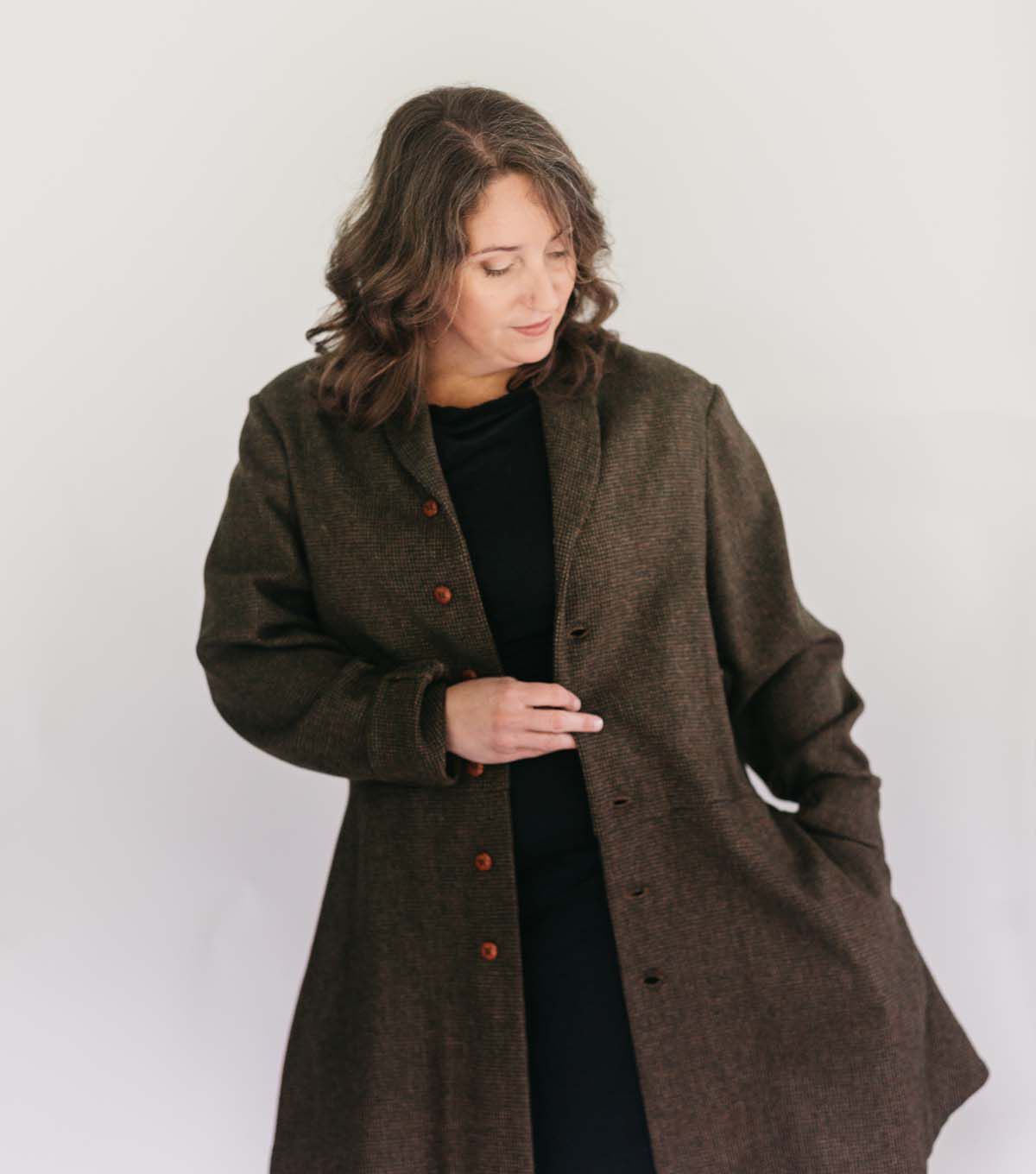 This traditional coat has been a versatile fashion through the ages. It was worn for casual outdoor activities in the English countryside in the 1700's for formal or dress fashion in the 1800's and for business wear until World War I in the early 1900s. Today, it's the perfect choice for historic military or Western reenactment, as well as a very fresh contemporary look. The single-breasted unlined Coat sewing pattern features shawl collar, princess seams in back, waist darts in front (woman's coat only), slightly lowered waistline, long narrow sleeves with banded cuffs, and above-knee peplum with back vent.