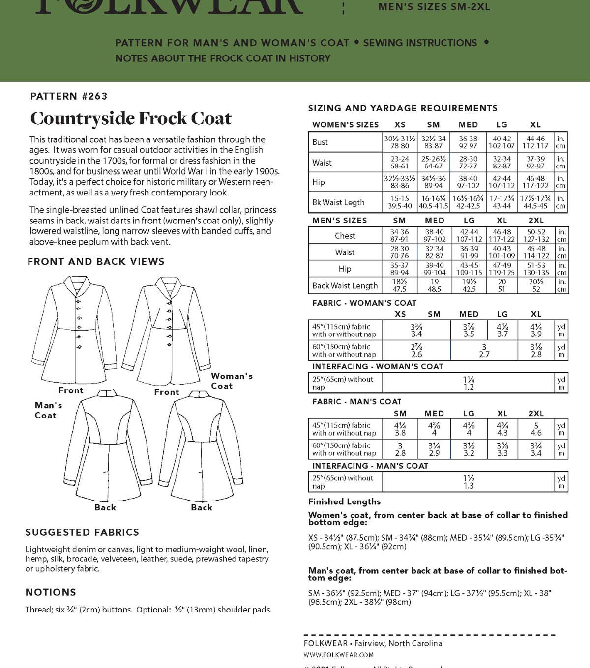 Folkwear 263 Countryside Frock Coat printed pattern