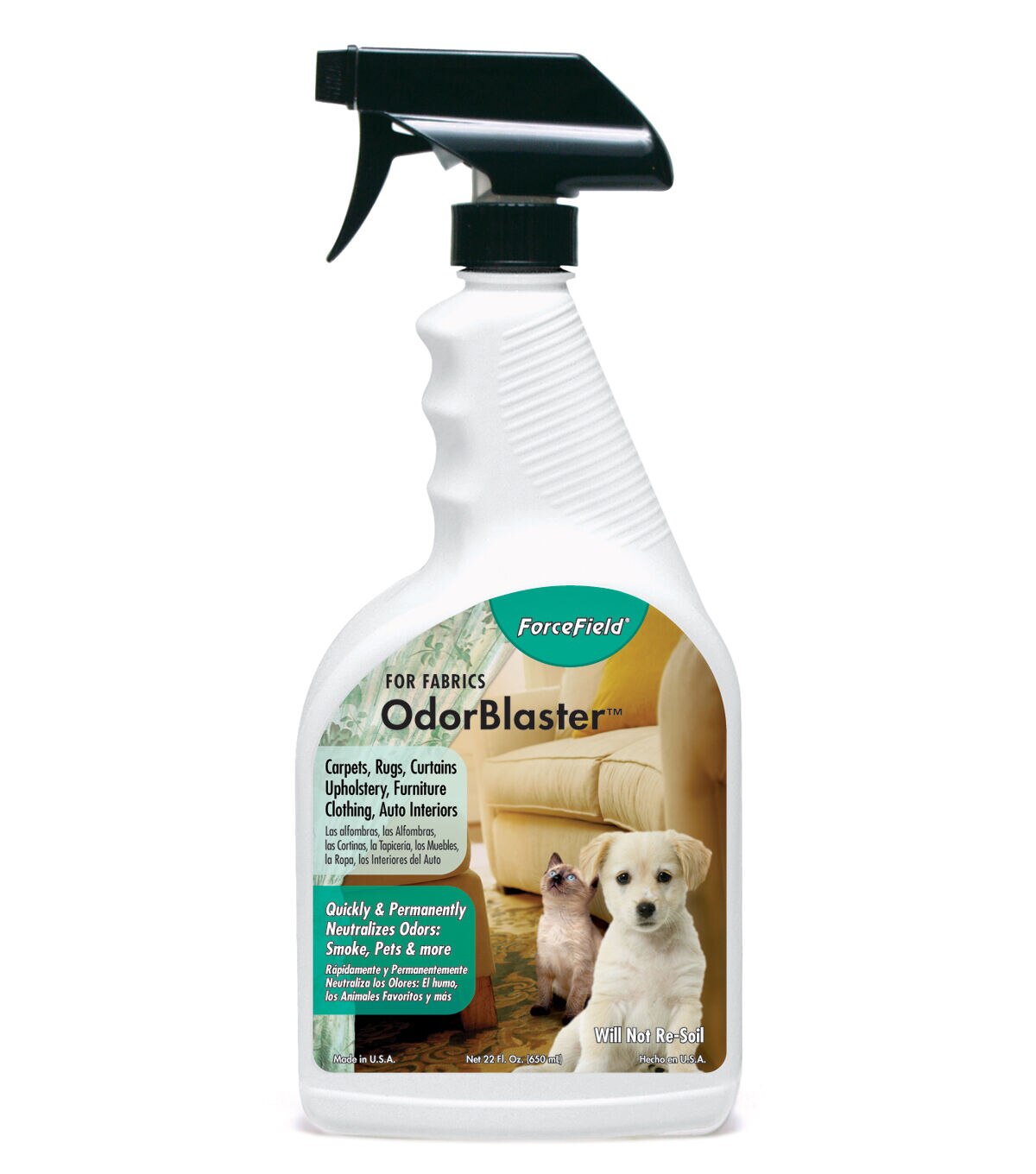 The ForceField OdorBlaster Fabric Deodorizer is perfect for eliminating foul odors from clothing, draperies, furniture, shoes and other areas. It works on contact to destroy odors caused by ammonia, smoke, foods and numerous other sources. Not only does it destroy odors, but unlike other products that can leave soil-attracting residues, it has been specially formulated with soil-fighting polymers to help prevent the re-soiling of treated materials.
