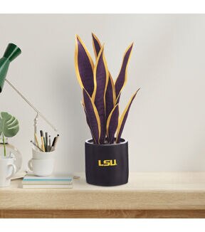 Show your school spirit in your space with our LSU faux Snake Plant. It's a perfectly realistic choice, with its long, slender leaves and life-like appearance. In addition to being a nice decoration for your home or office, this fake potted plant is also a practical option for those with allergies or limited space as its doesn't produce any pollen or require much space. Standing in 17 inches height, it is decked out in accurate purple and gold foliage. The sword-like leaves that extend in different directions are also adjustable and you can fluff them to the shape you want. For easy styling, our unique snake plant comes pre-potted in a 5-inch black ceramic base pot with the LSU logo printed on it. Add some life to your home décor with this beautiful Tiger fan item. Not only is it perfect for game days and tailgates, but it also makes a great addition to any man cave or LSU Tiger merchandise collection. Perfect as a fan gift, give it to any LSU fan, alumni, or football enthusiast that you know.