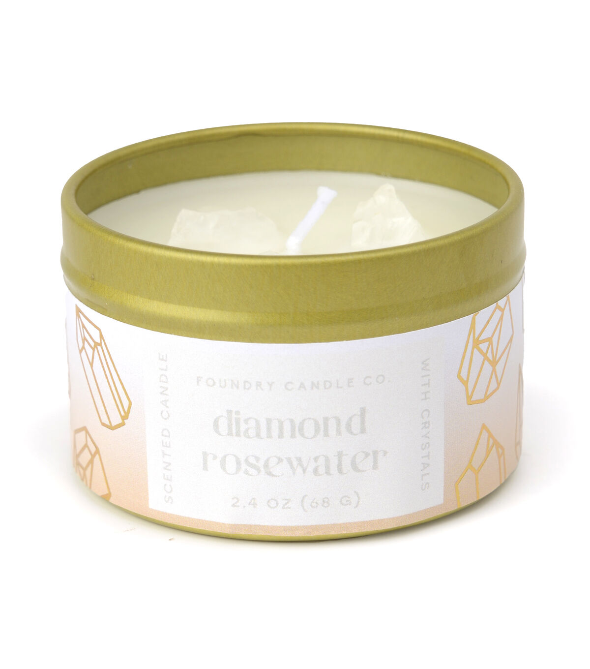Set the vibe with an enchanting Crystal candle from Foundry. This single wick, 2.4 oz candle comes packaged in a gold tin, perfect for gifting, and is adorned with tinted crystal shapes on top of the wax. Inspired by birth gemstones.