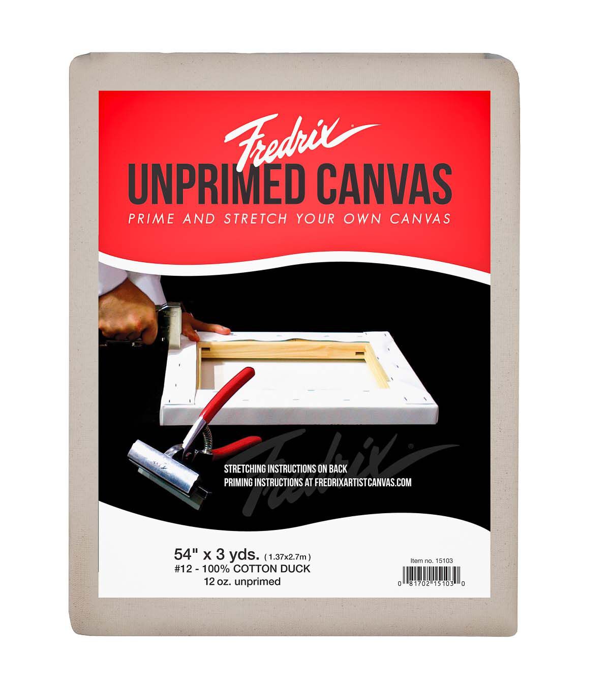 An unprimed 12 oz. raw, 100% cotton duck Canvas Blanket from Fredrix. They are a convenient and easy way to stretch your own canvas. Size and prime to your own specifications for a variety of medias.