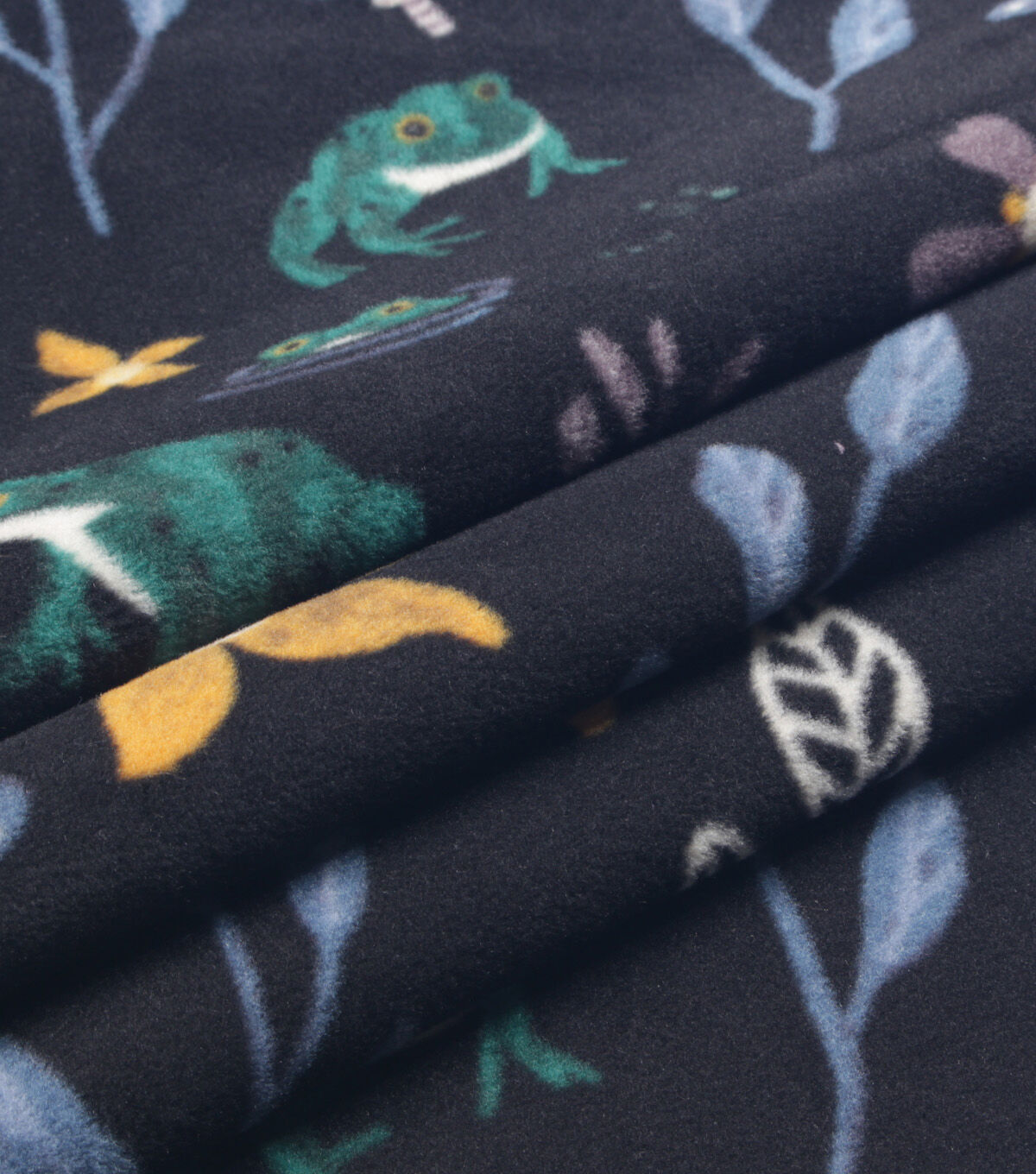 Frogs & Leaves on Black Anti Pill Fleece Fabric