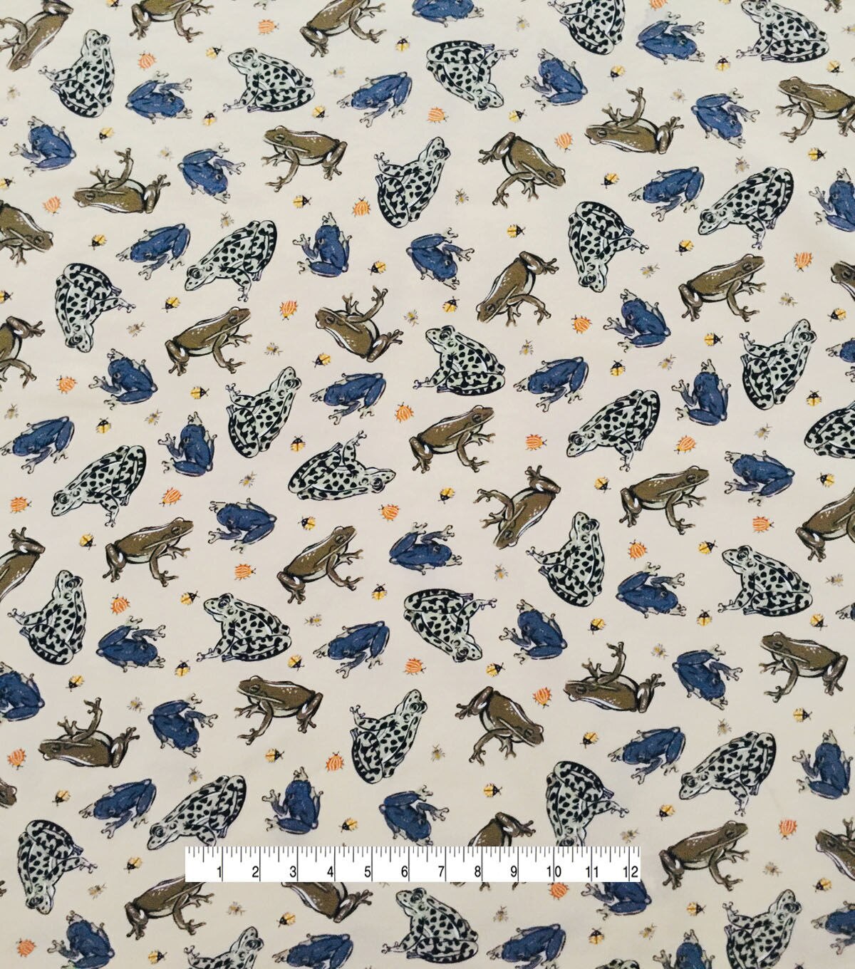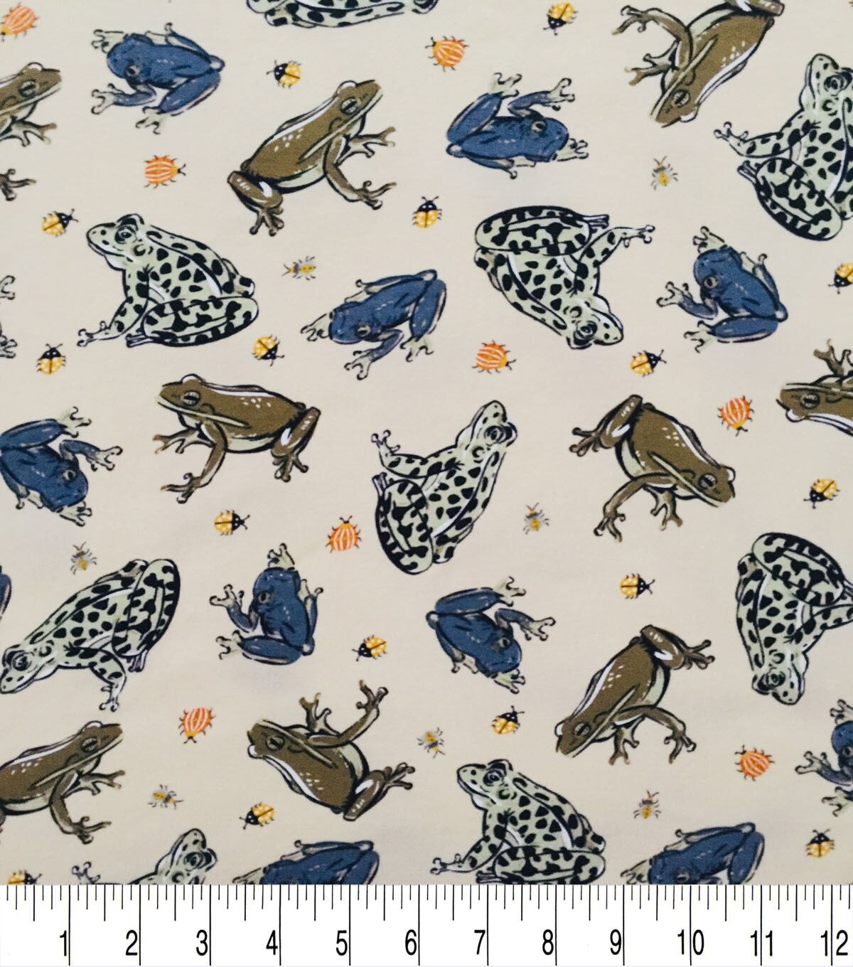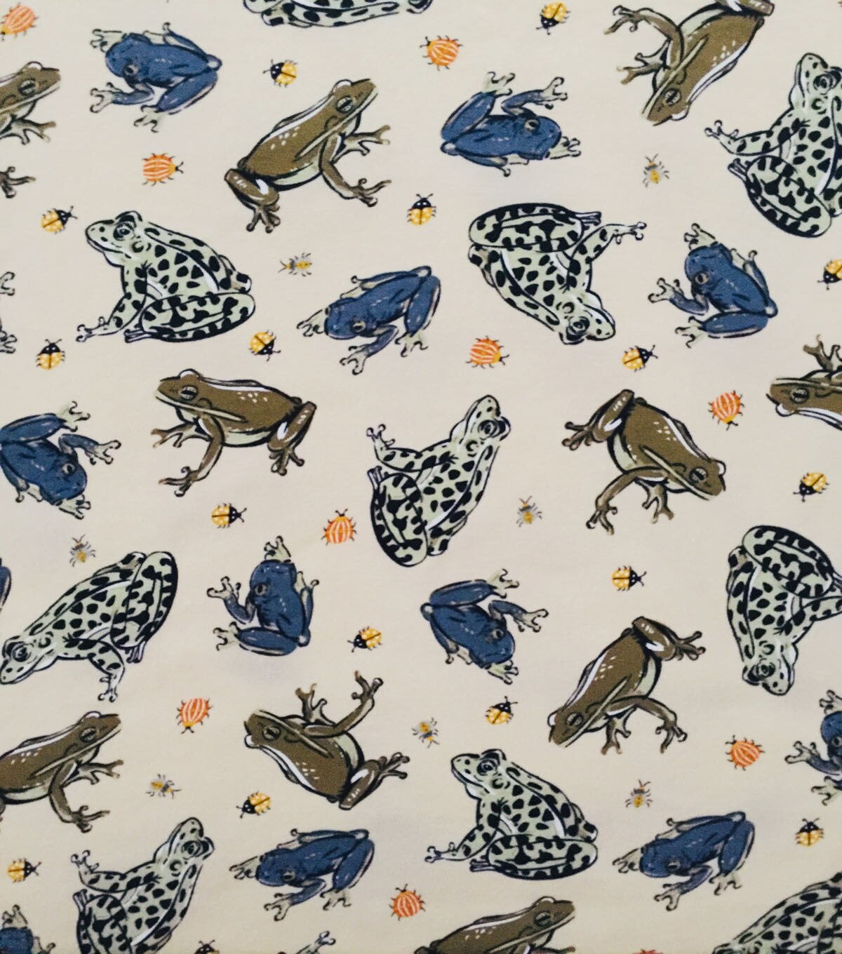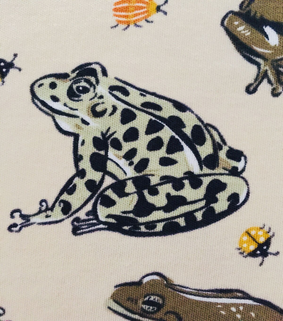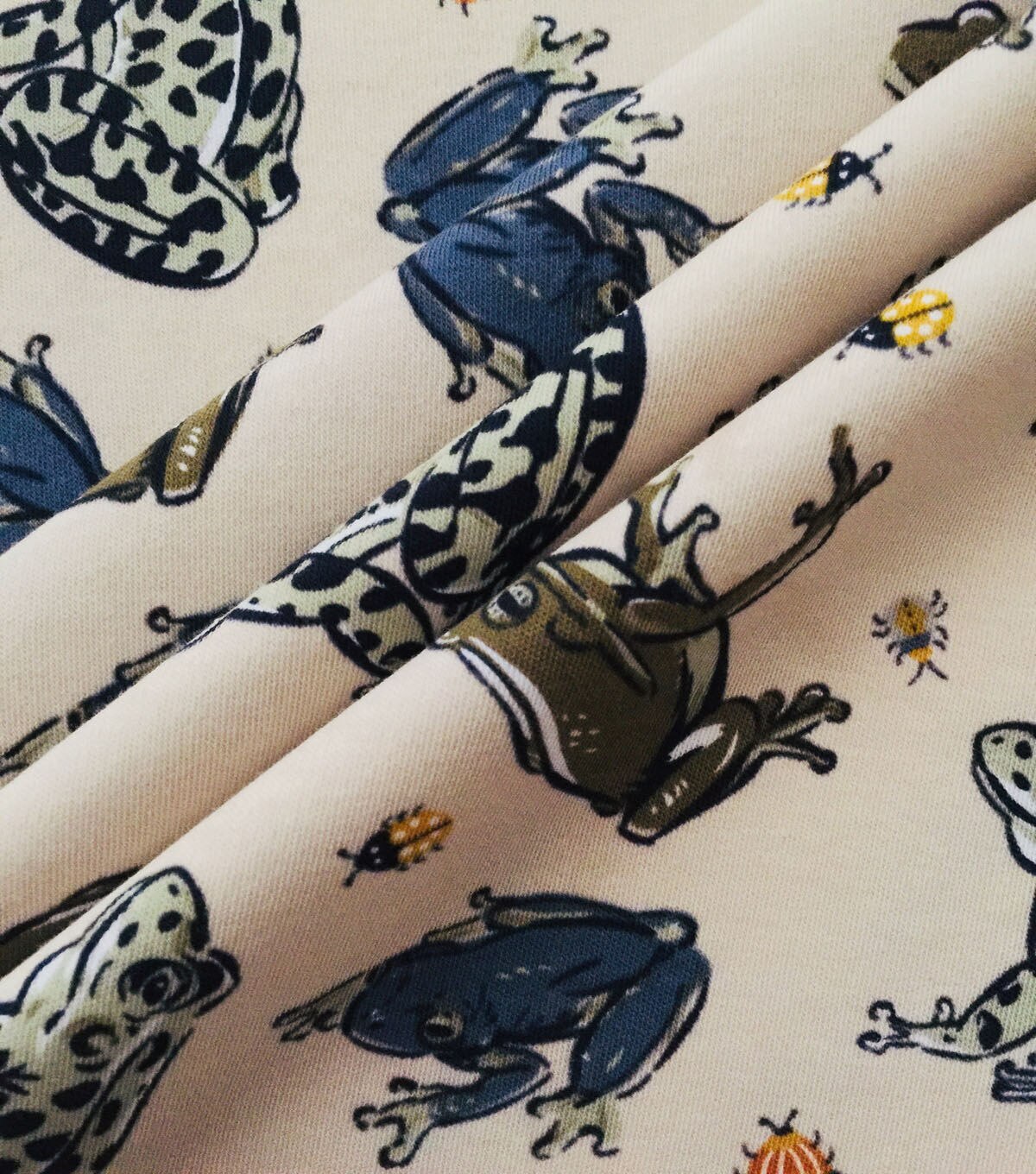The power of cotton is an almighty force for kids attire. Our cotton spandex interlock is a thicker fabric that's durable and naturally comfortable. Plus with breathability and slight stretch, children's tops and dresses are free-moving during play time. Choose from various designs like this muted sketched frog print, and you have a loving sewing project for awesome practicality and personality.