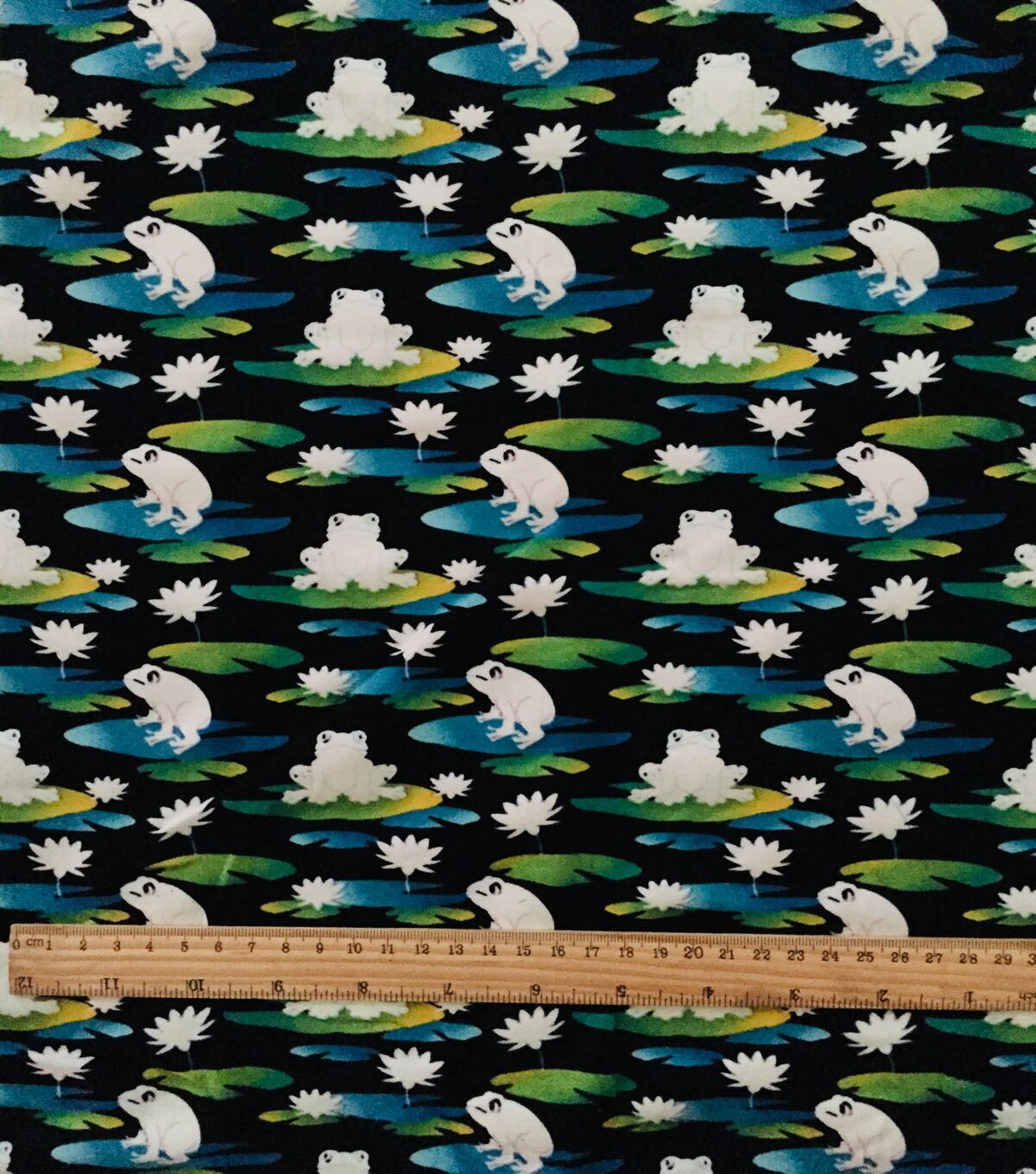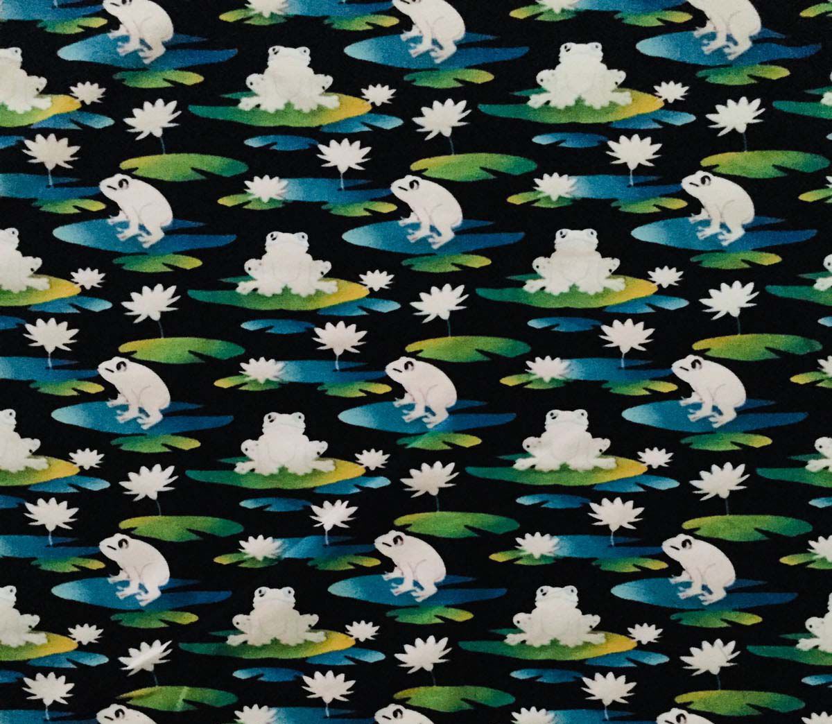 • Frogs on Black Cotton Interlock Knit Fabric by POP!