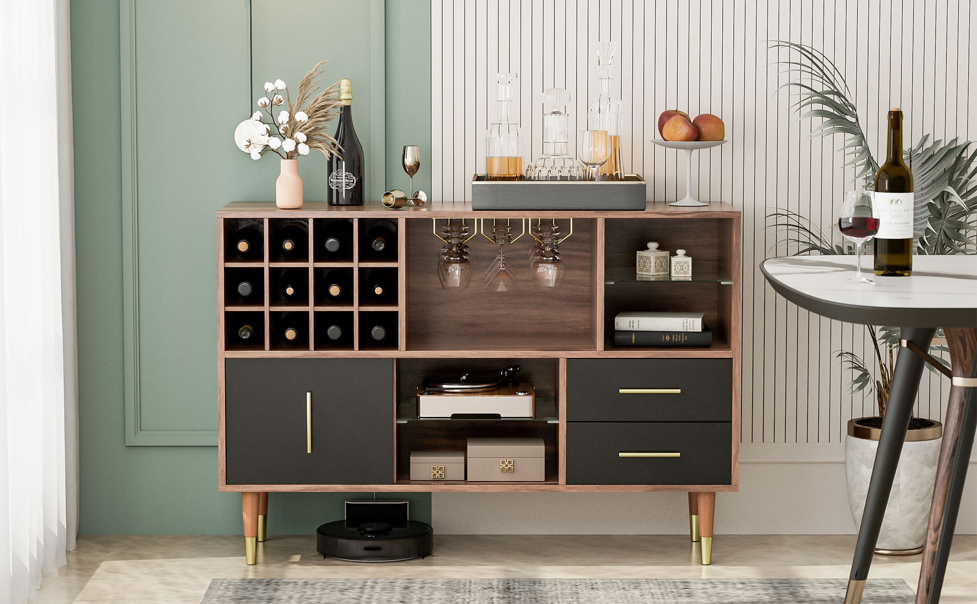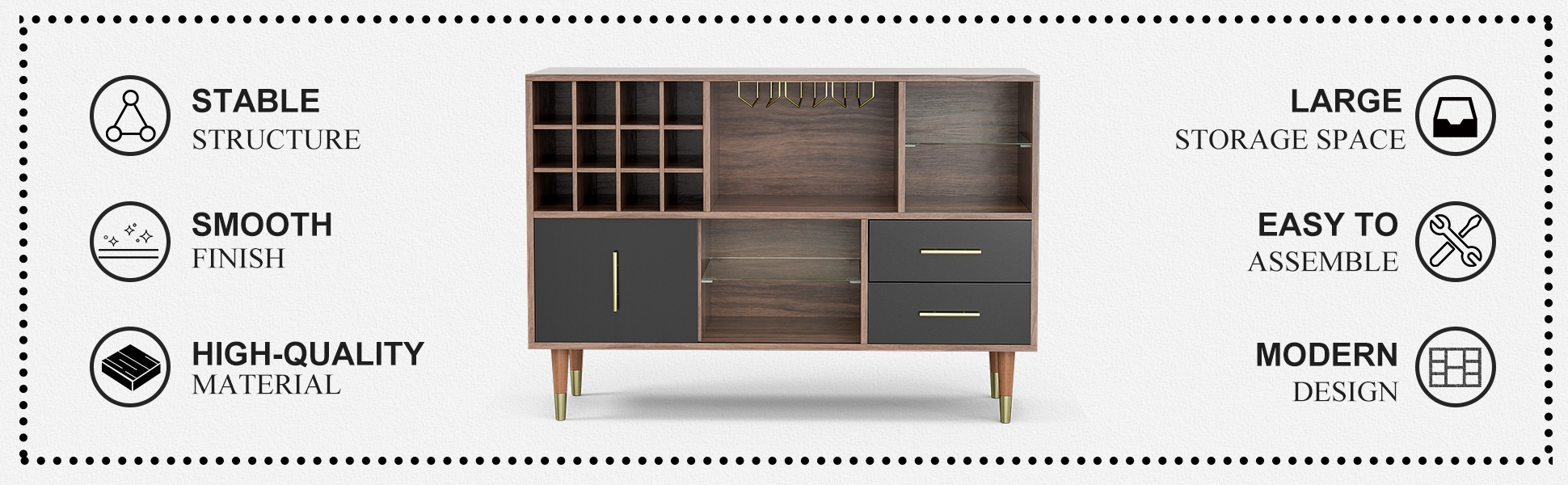 ☕ 【DEDICATED STORAGE SPACE】 - The kitchen buffet specialized wine rack which can hold wine or drinks, 4 stemware holder, 2 open shelves and storage drawers, all in one sideboard, both openness and confidentiality. You can freely place items according to your needs.