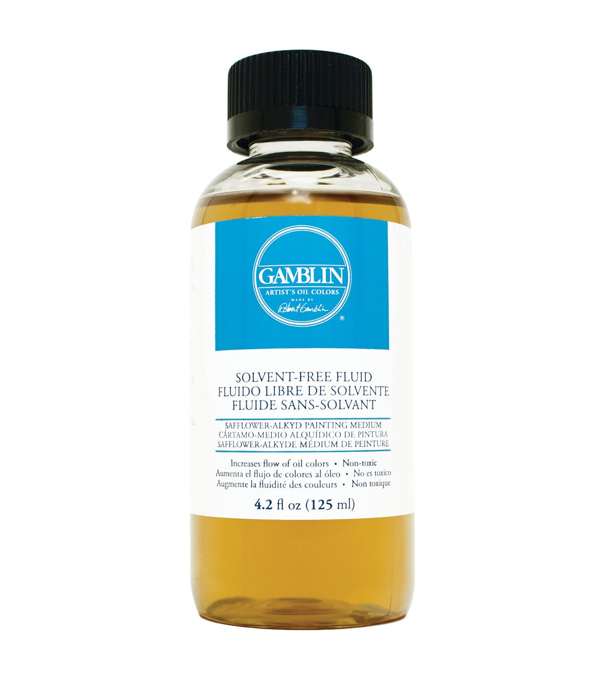 The Gamblin Solvent-Free Fluid Painting Medium gives oil colors more flow and transparency. It has a moderately fast drying rate, and increases gloss. Made from safflower oil and alkyd resin, it is non-toxic and contains no Gamsol or petroleum distillates.
