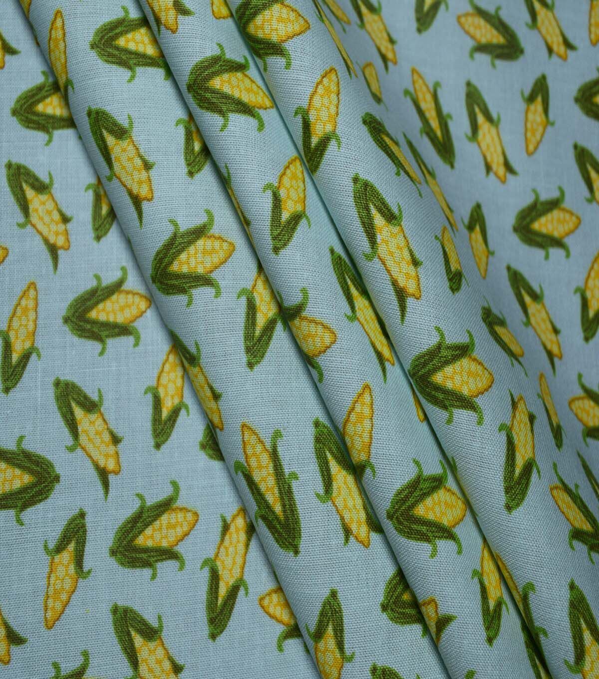 Whether you're creating a new set of curtains for your kitchen or a fun summer dress, this fabric is sure to impress. The possibilities are endless with Garden Corn on the Cob on Blue Cotton Fabric by Quilter's Showcase.