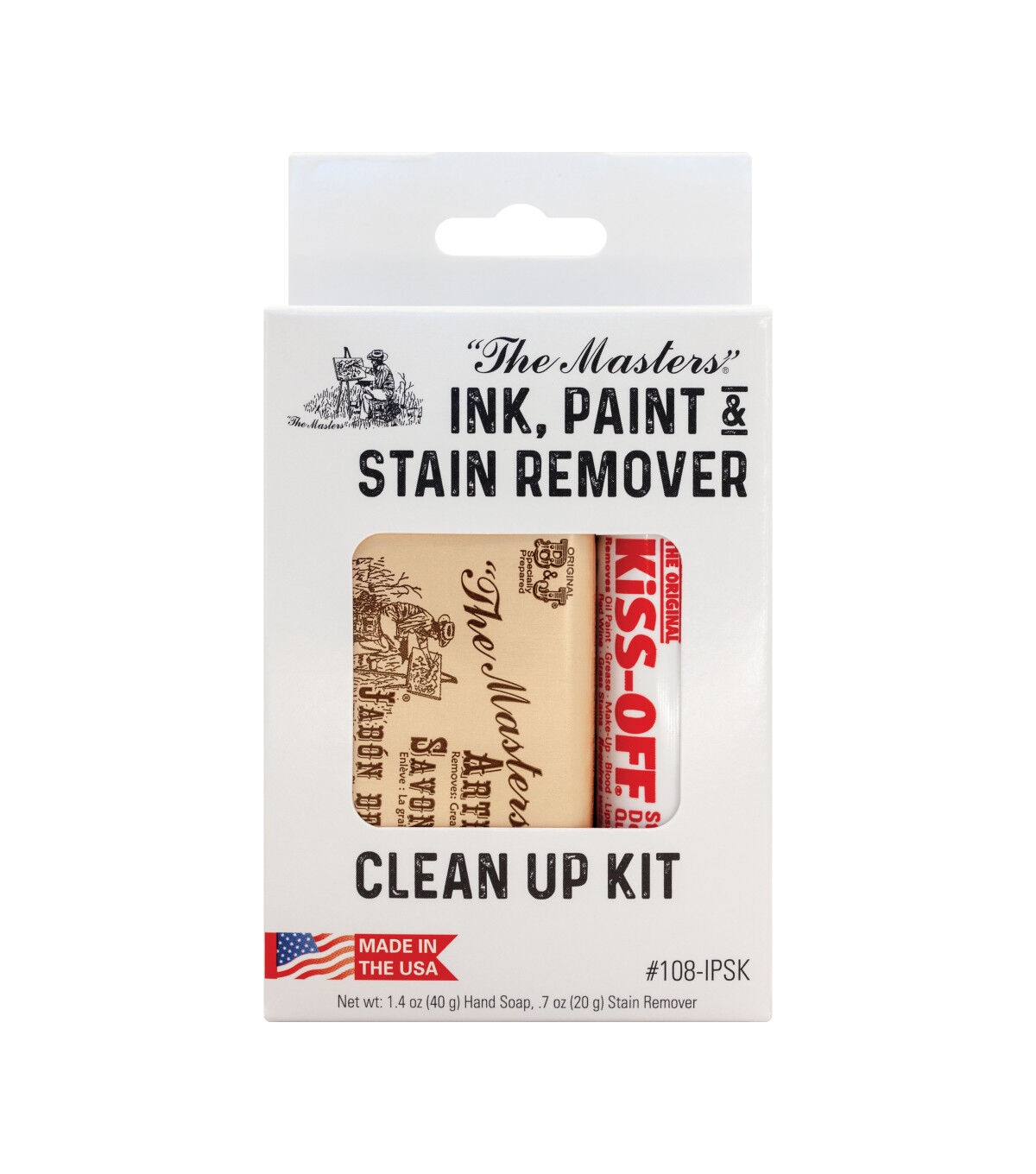 This kit includes one The Masters Hand Soap and one Kiss-Off Stain Remover. Kiss-Off removes dried paint and inks from fabric, cleans rubber stamps and more. Artist Soap washes dye and ink from hands without drying out. This kit is ideal for the crafter, illustrator and artist working with paints, inks and dyes.