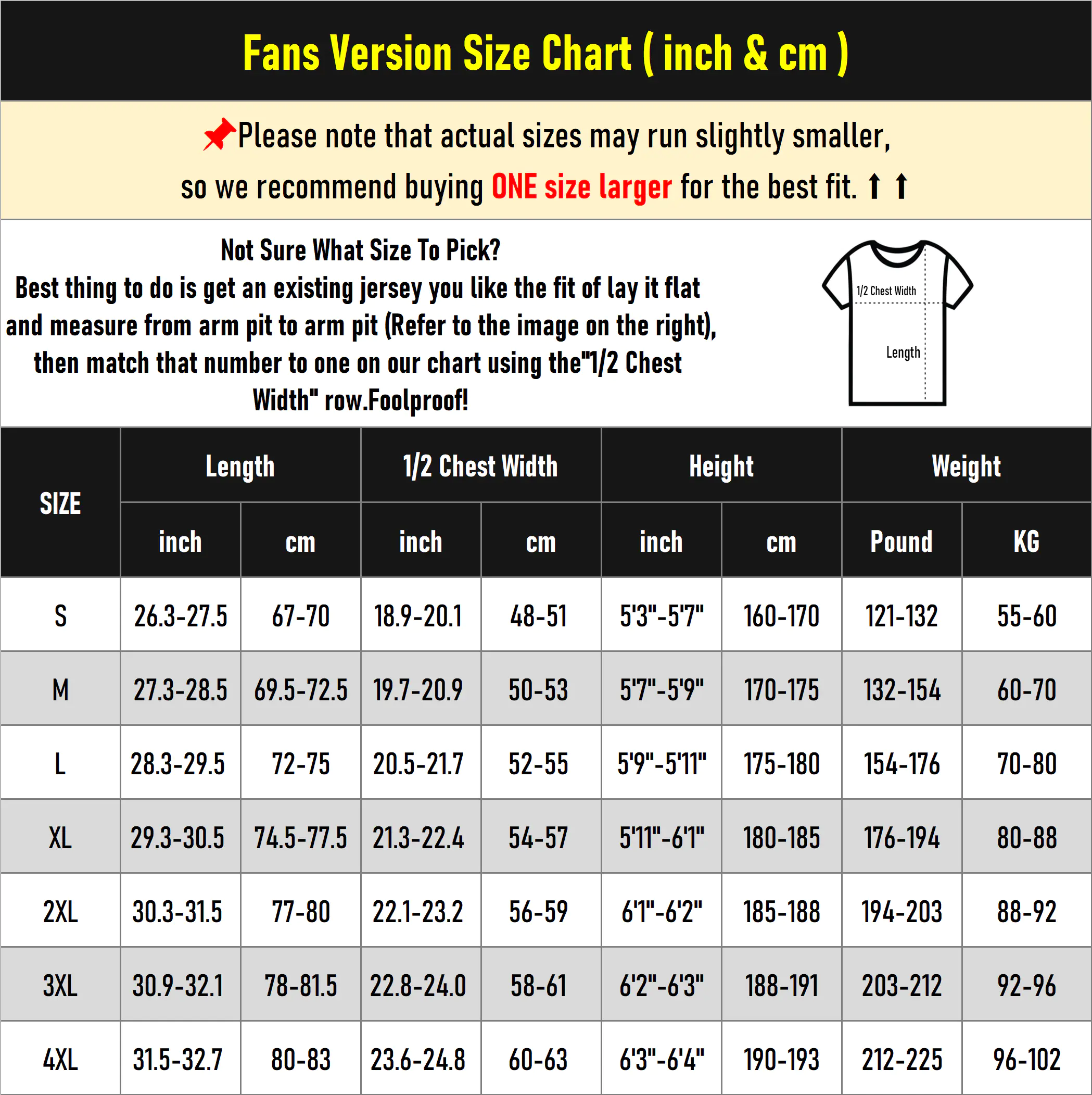 Please note that due to measurement errors, there may be a 1-2 inch discrepancy between the actual jersey size and the size chart, which is considered normal. If your measurements fall between two sizes or if you are overweight or have a muscular build, we highly recommend purchasing a larger size to ensure a more comfortable fit and better wearing experience.