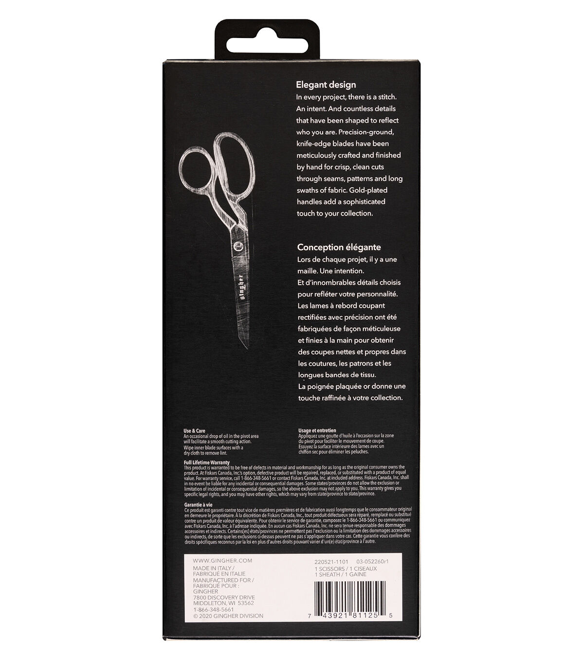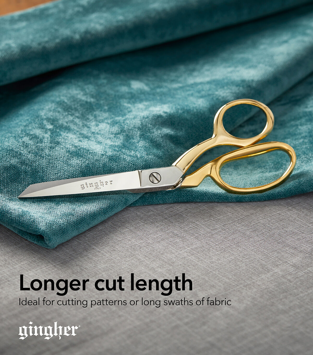 Gingher Gold-handled Dressmaker Shears are meticulously crafted of premium, forged steel with long, precision-ground, knife-edge blades that cut multiple layers of fabric easily, all the way to the tip. Their longer cut is ideal for cutting patterns, trimming seams or cutting long swaths of fabric, and a double-plated chrome-over-nickel blade finish is both striking and durable. A bent handle design helps hold fabric flat on your worksurface for smooth, comfortable, mistake-free cutting. Its gold plating adds an unmistakable touch of sophistication to the handles. These shears also include a protective nylon sheath for storage.