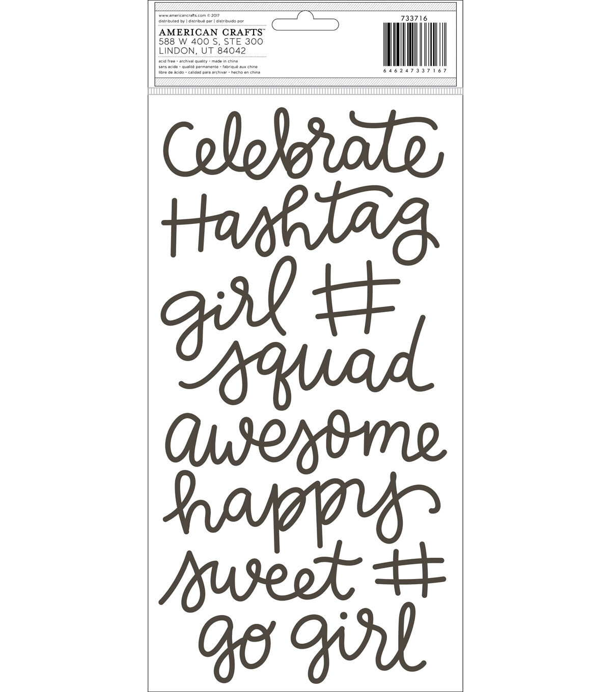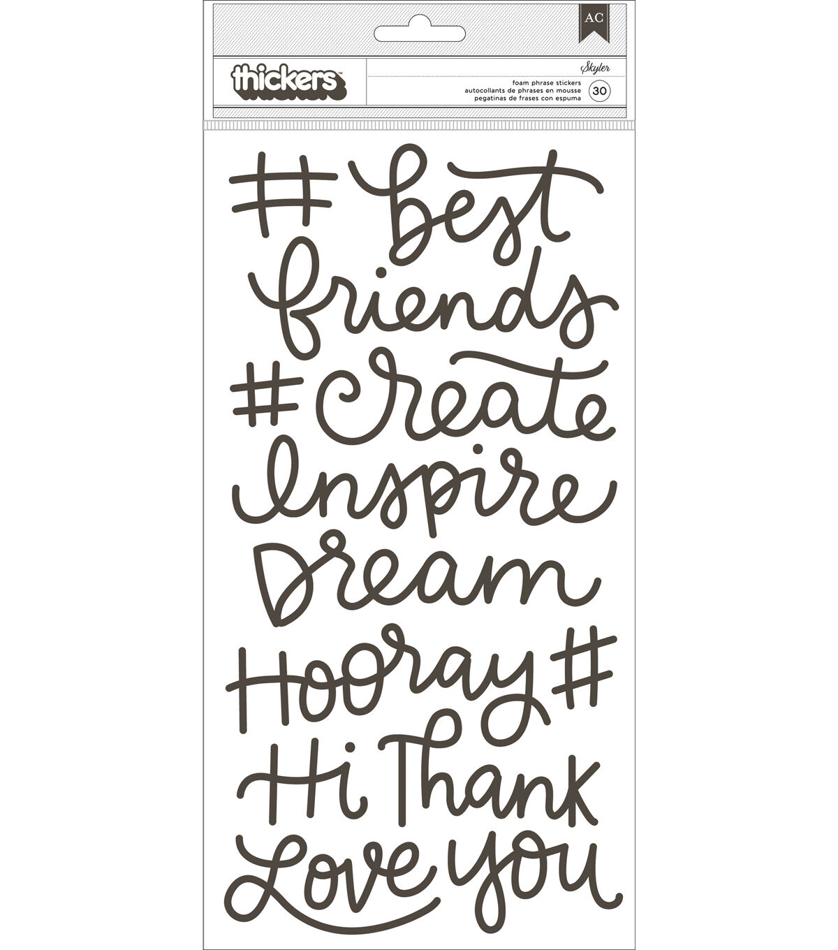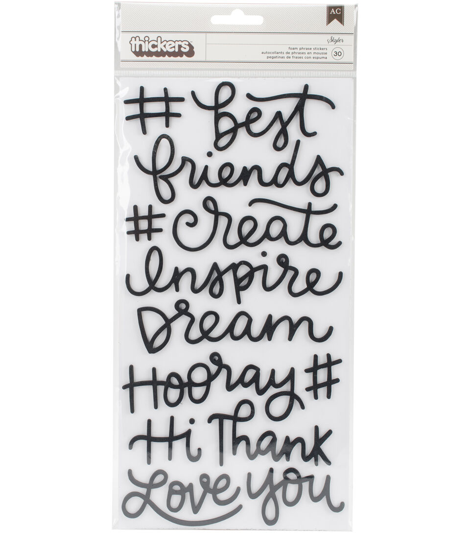 Lend a unique look to handmade cards, scrapbooks, journals and photo frames with the American Crafts Girl Squad Thickers Skyler Foam Stickers - Phrases. This pack contains two 5.5 x 11-inch backing sheets with 30 imported, acid-free, archival-quality foam stickers. Team them with stamps, die cuts and other embellishments for added charm.