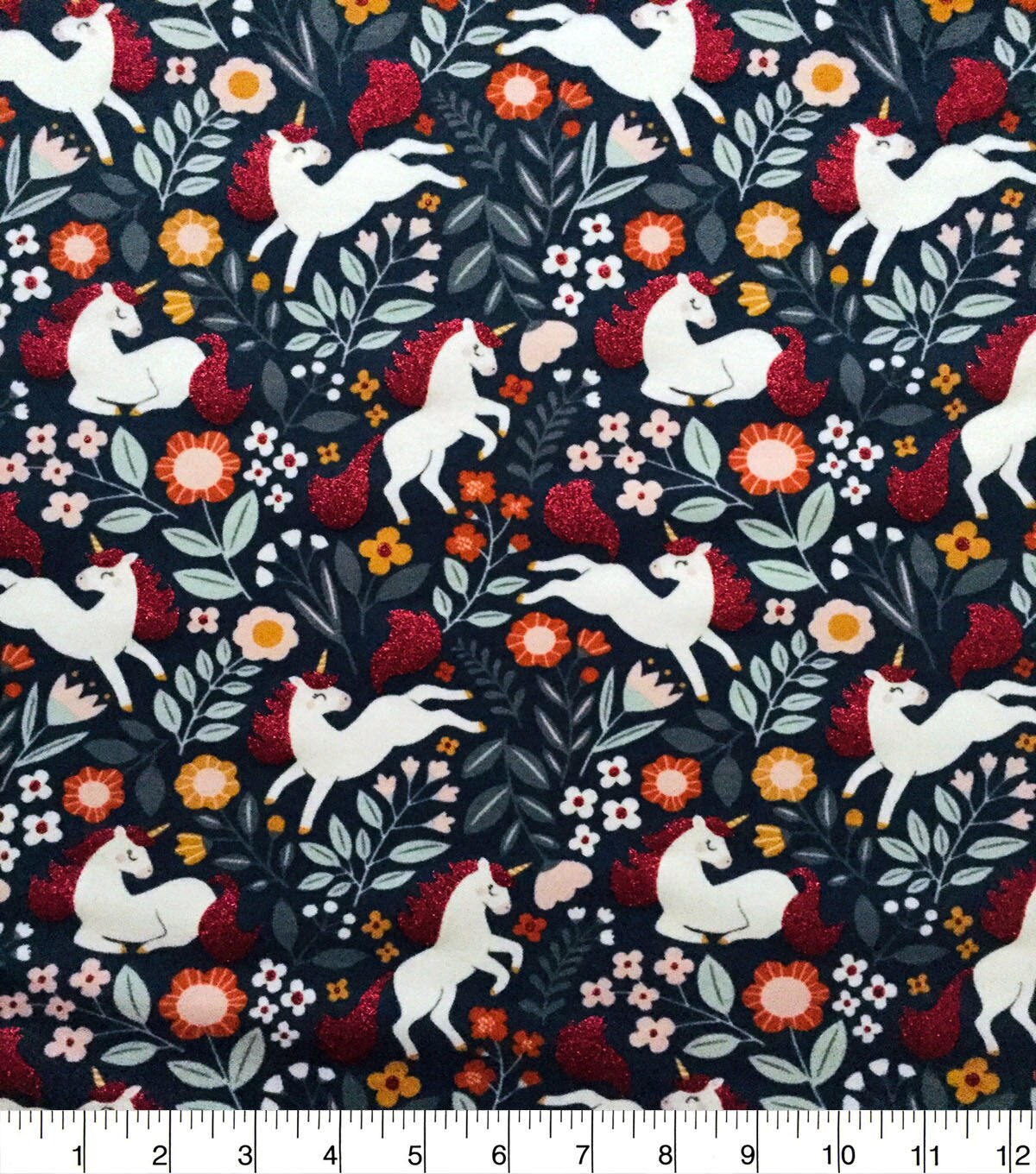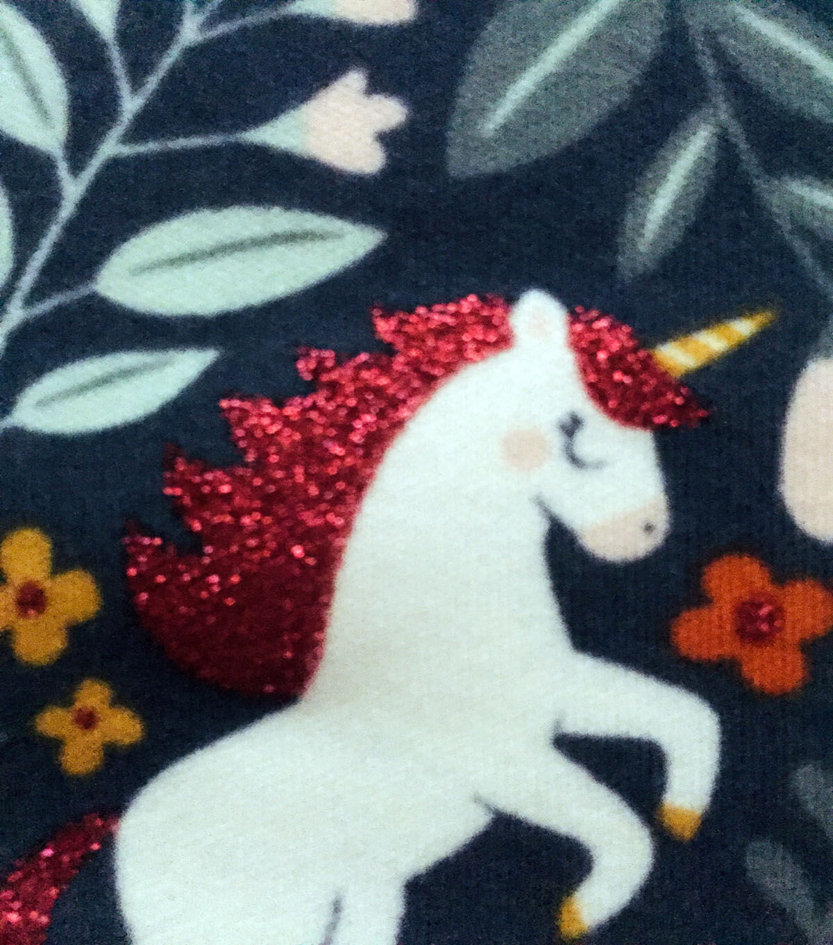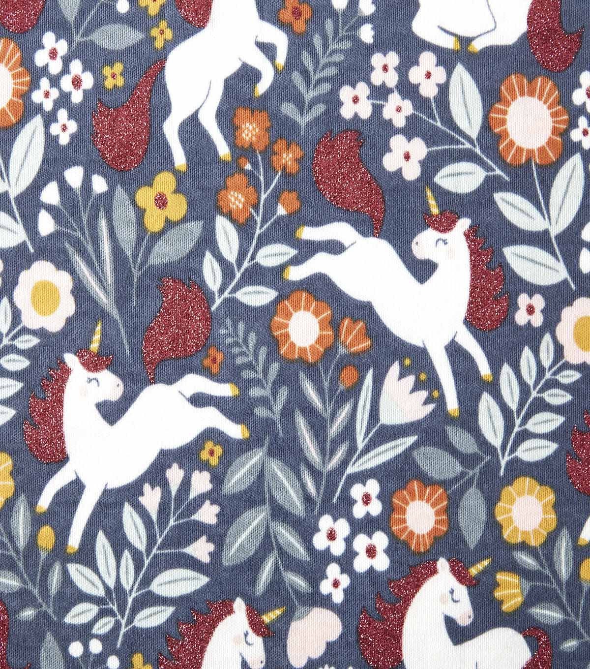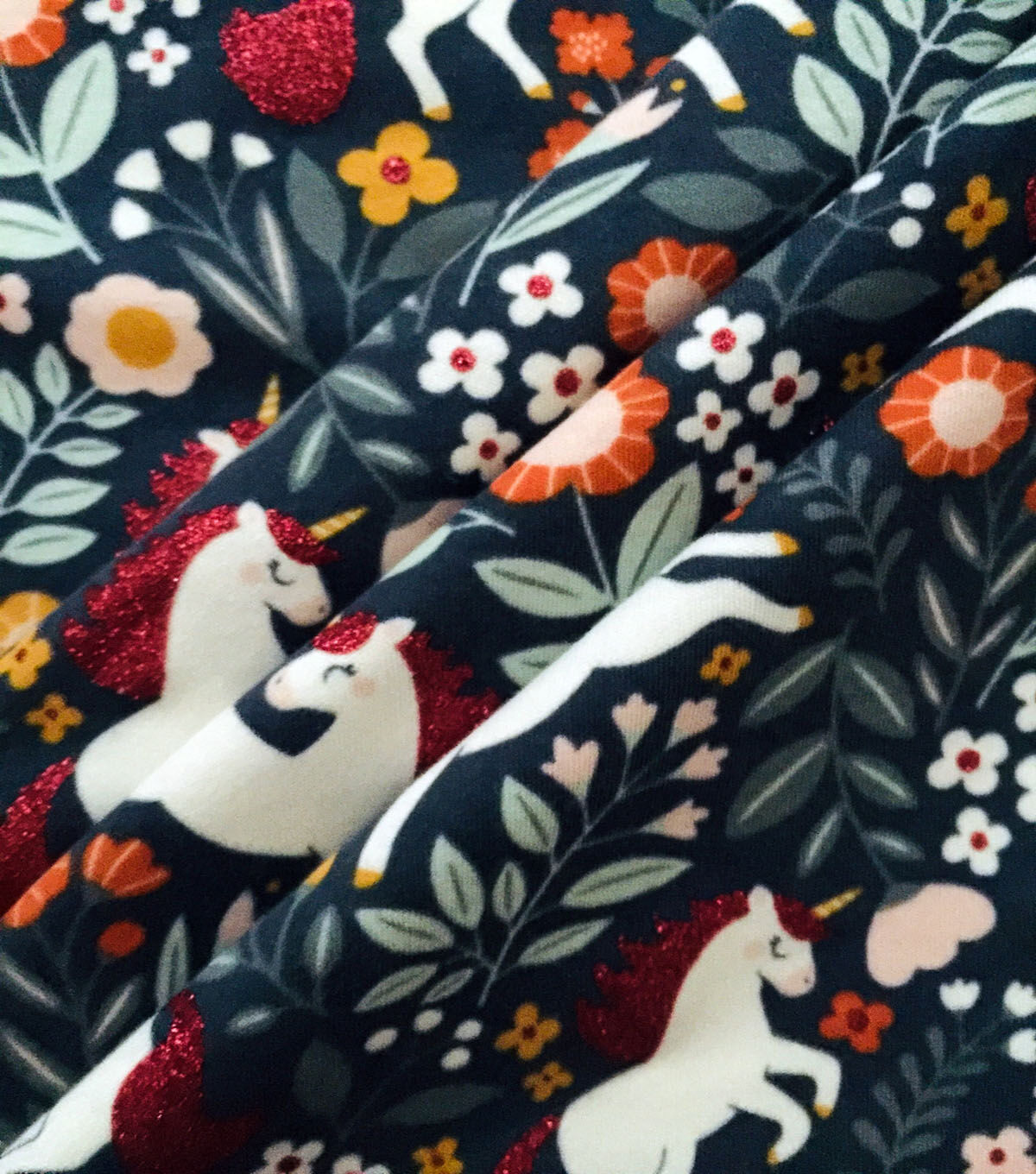 The power of cotton is an almighty force for kids attire. Our cotton spandex interlock is a thicker fabric that's durable and naturally comfortable. Plus with breathability and slight stretch, children's tops and dresses are free-moving during play time. Choose from various designs like this glittery unicorn pattern, and you have a loving sewing project for awesome practicality and personality.