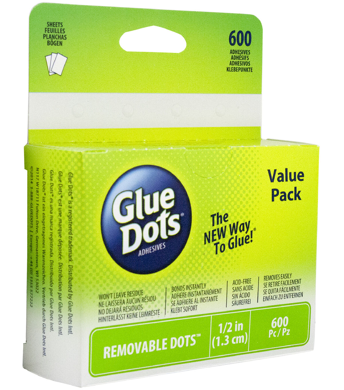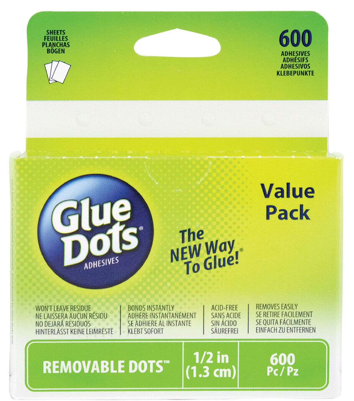 GLUE DOTS-Removable Glue Dots Value Pack. Removable Glue Dots are double-sided adhesives perfect for classroom use. They are repositionable and can be easily removed from most clean, dry surfaces. The perforated sheets tear easily for quick distribution and these dots remove without staining or leaving residue. Ideal for arts, crafts, and school projects or decorations. Always test surface first. This package contains 600 adhesives each measures 1/2 inch (50 perforated sheets). Conforms to ASTM D4236. Acid free and non-toxic. WARNING: CHOKING HAZARD-Small Parts. Not for children under 3 years. Made in USA.