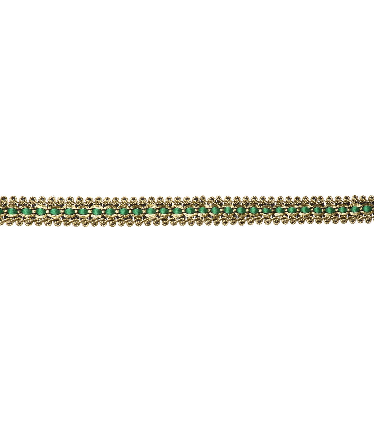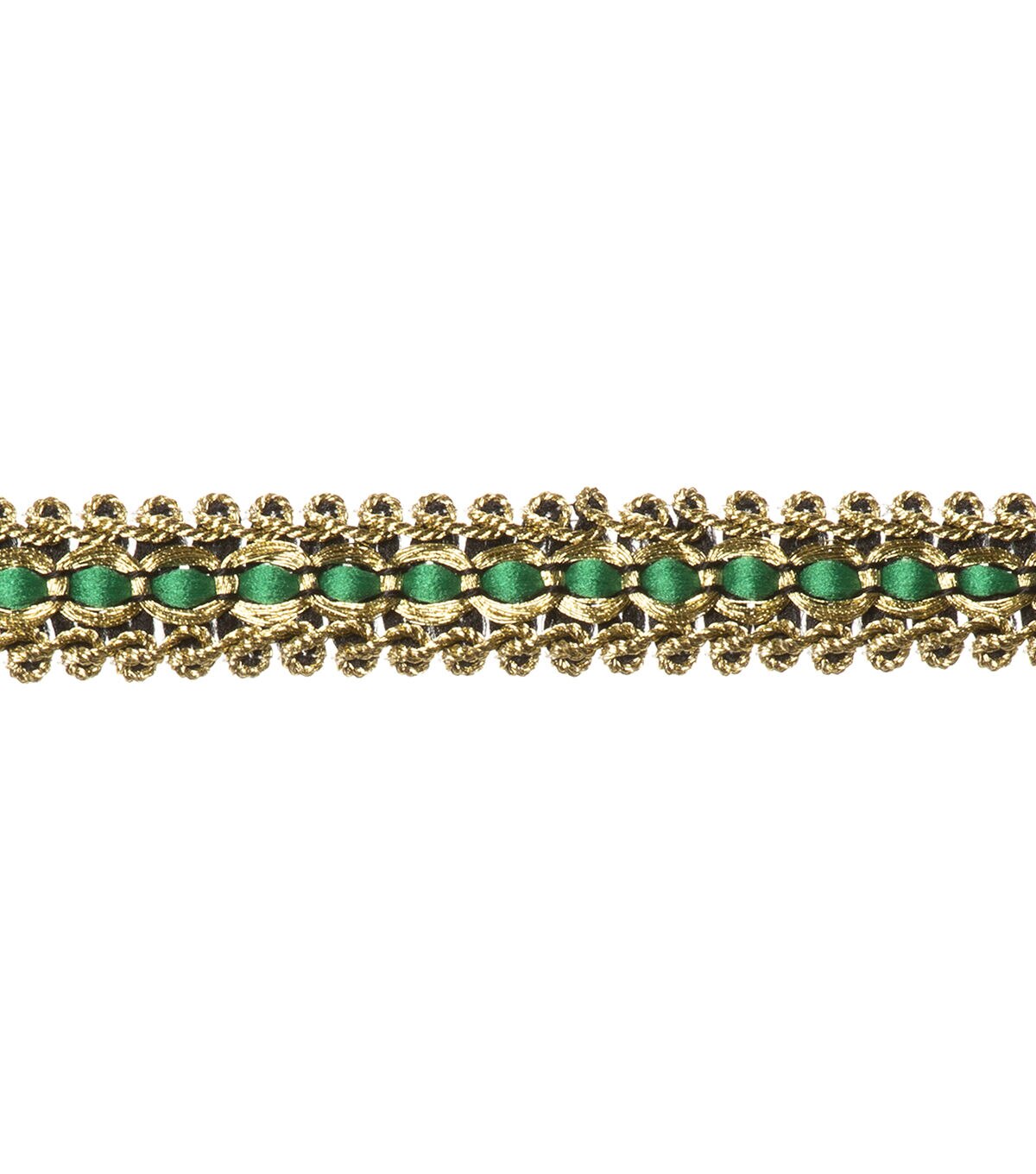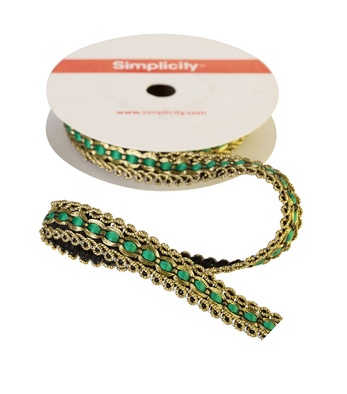 This 5/8 inch gold/emerald scroll trim in a polyester/nylon blend. Perfect fo apparel design, home décor inspirations and so much more!