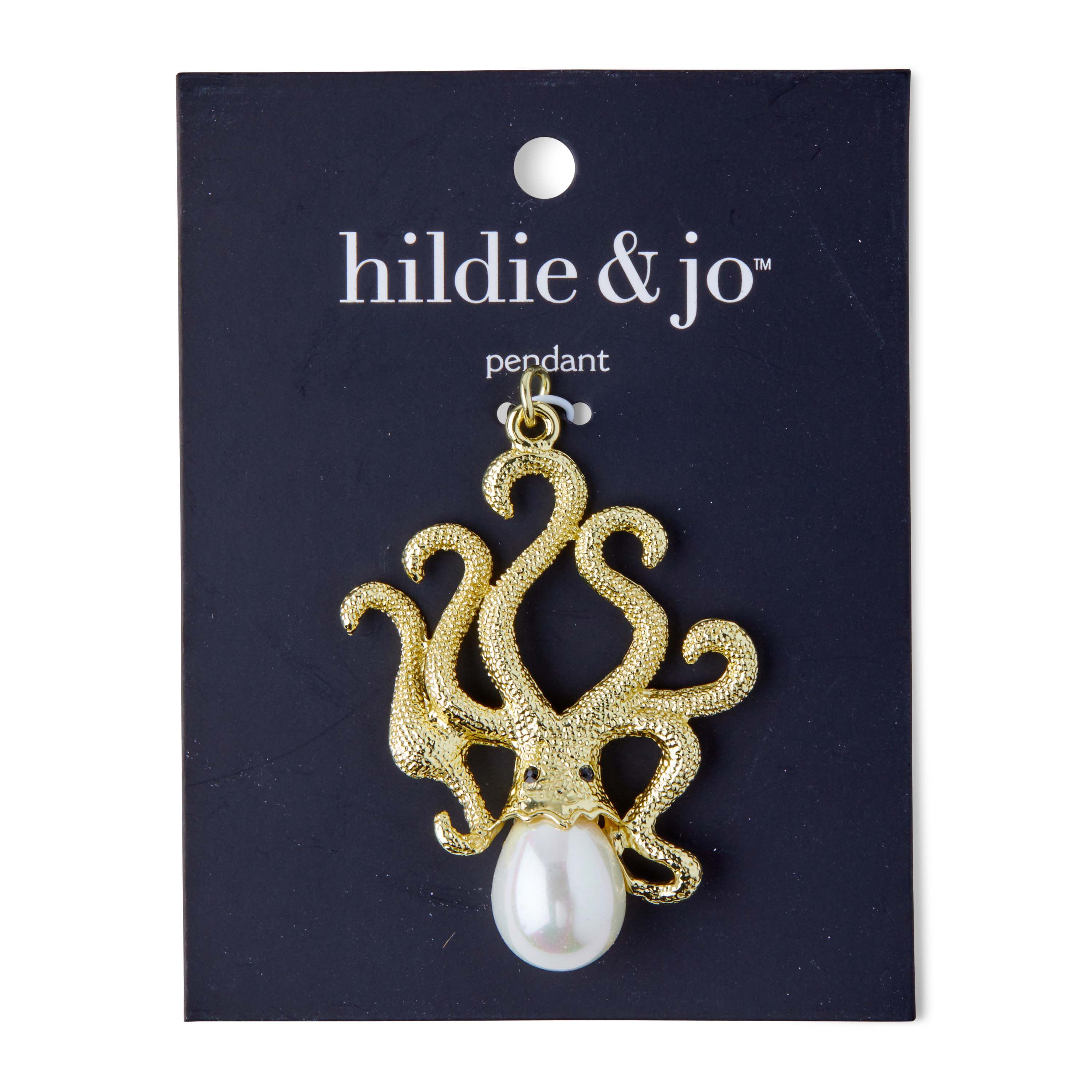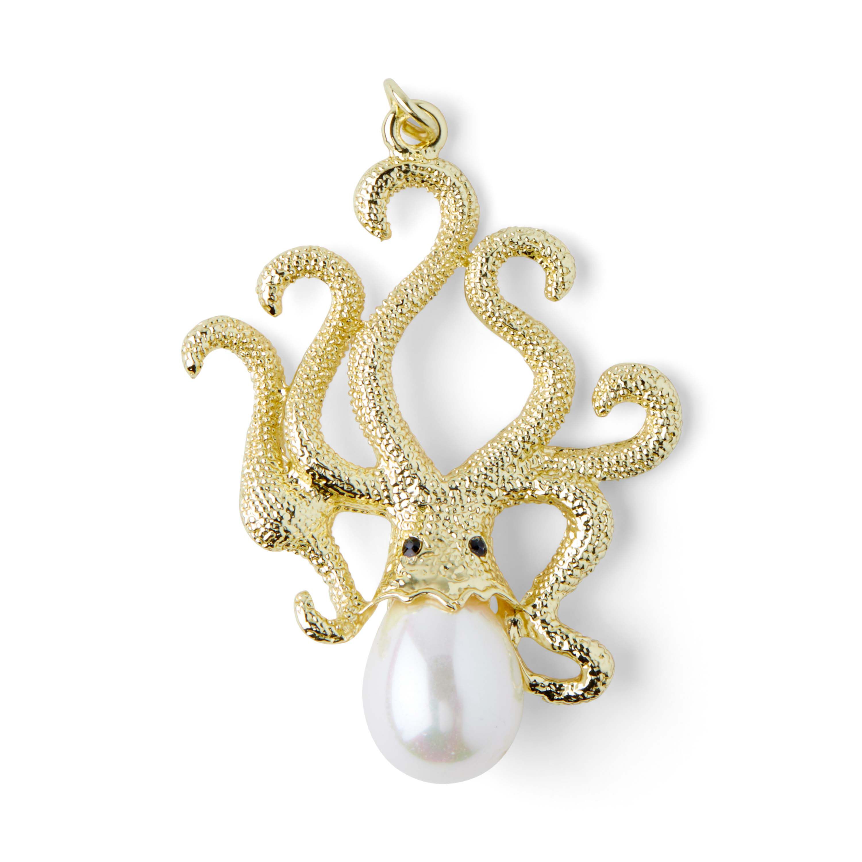 Adorn your necklace with this lovely hildie & jo Octopus Pendant-Gold. This pendant is in the shape of an octopus. The body of the octopus is textured gold, with two black eyes. Its mantle is a pearl. Add it to a chain for an eye-catching effect. It has jump rings for easy attachment.